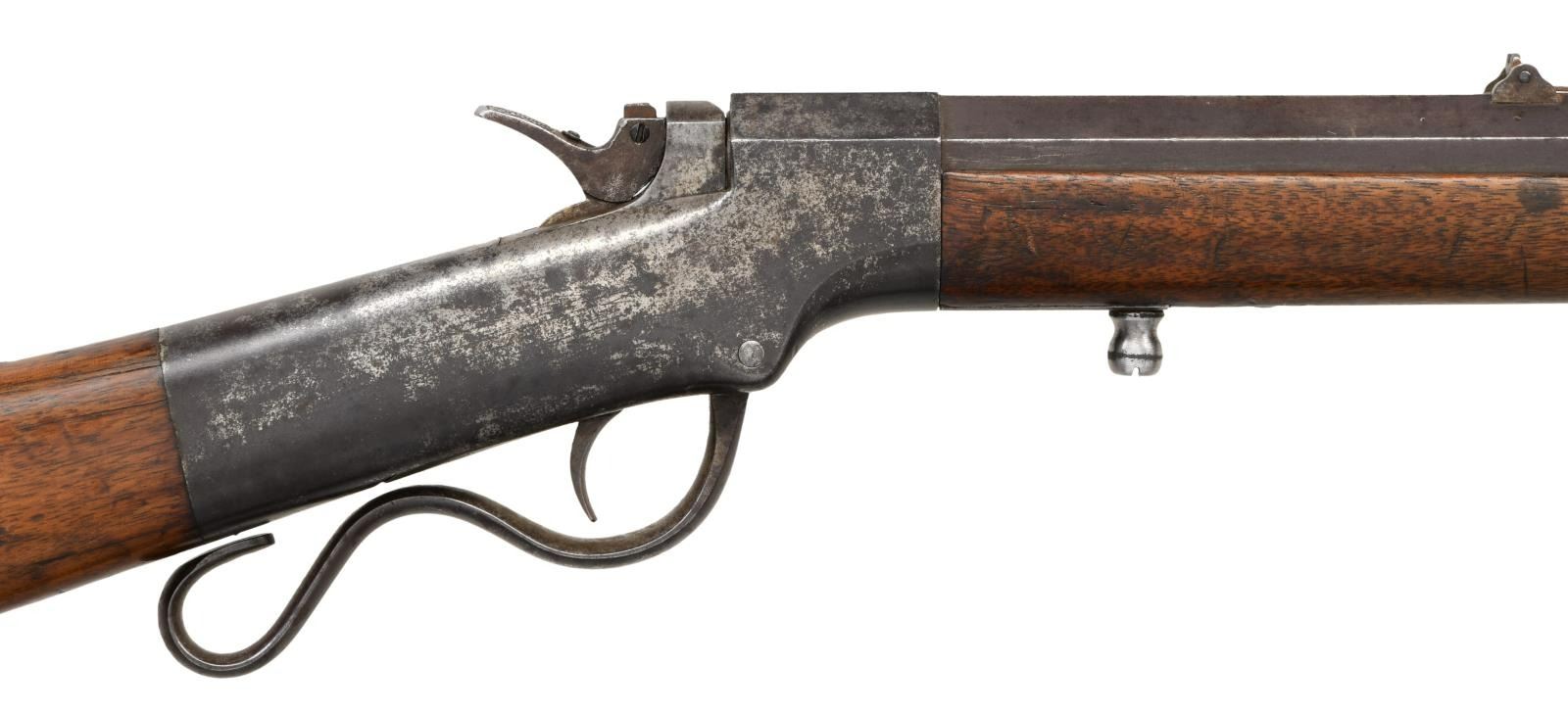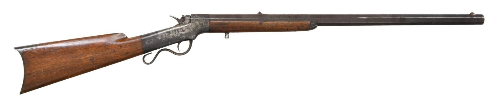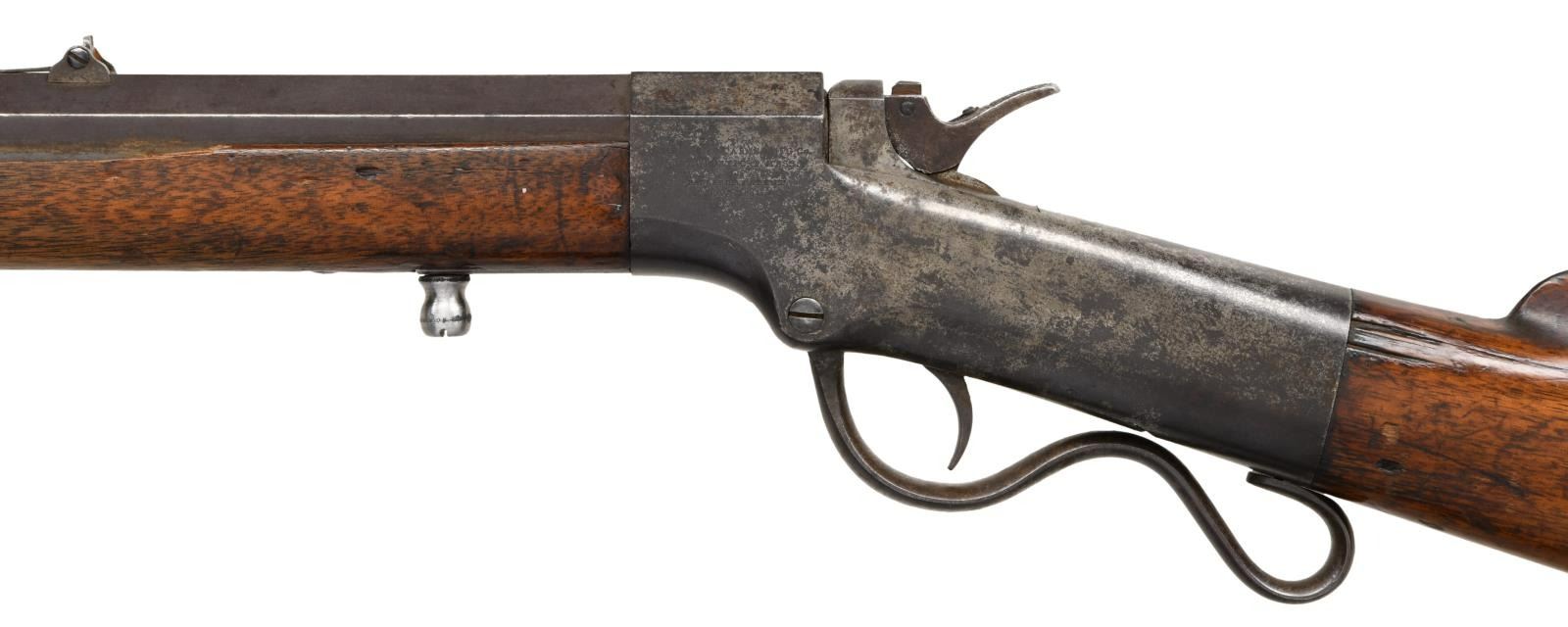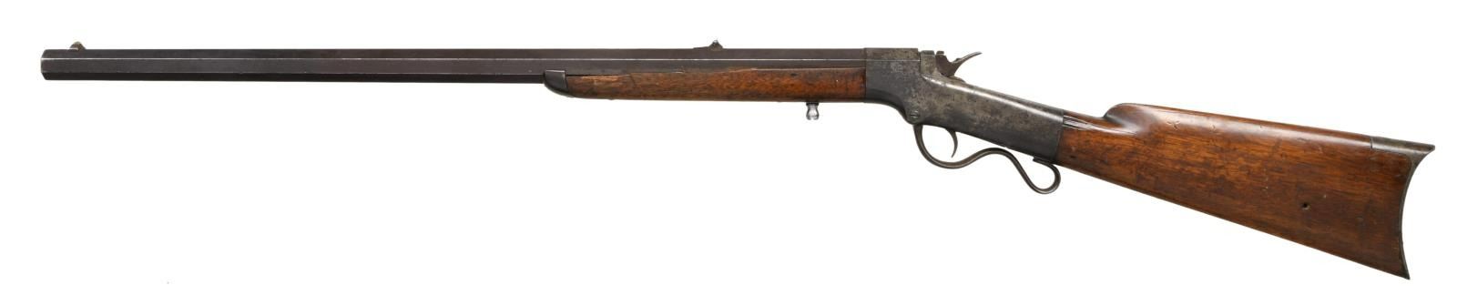 Cal. 46 RF. S# 19712. Bbl. 26" oct. Blade front sight. Folding leaf rear sight. Matching numbers on bbl. & frame. Left side of frame has Merrimack Arms Newburyport marking. Appears to be a single ignition model. Lever is loose & may require attention. Straight grip walnut stock & forend w/ crescent buttplate. CONDITION: stock has older added finish w/ a long 5 1/2" chipped piece on left side of forend, a couple notable cracks on right side of forend, an added hole on left side of butt, a few further cracks behind frame, scattered dings, flaking & handling wear. Metal is mostly a gray patina w/ scattered oxidation, some tool marks & dings. Pitted bore w/ evident rifling. (01-24172/MJC). ANTIQUE. $1200-1600.