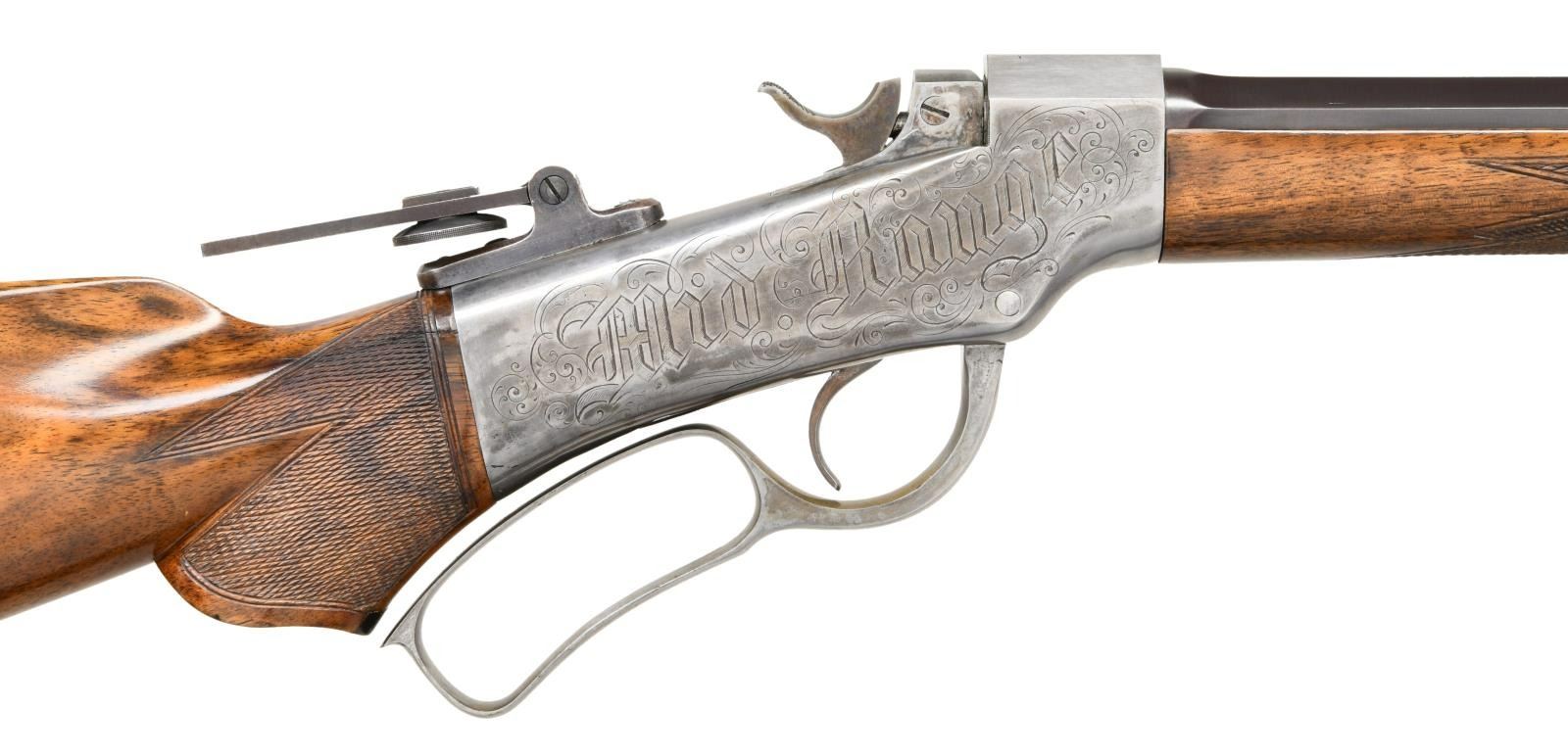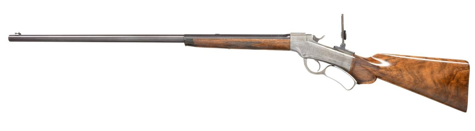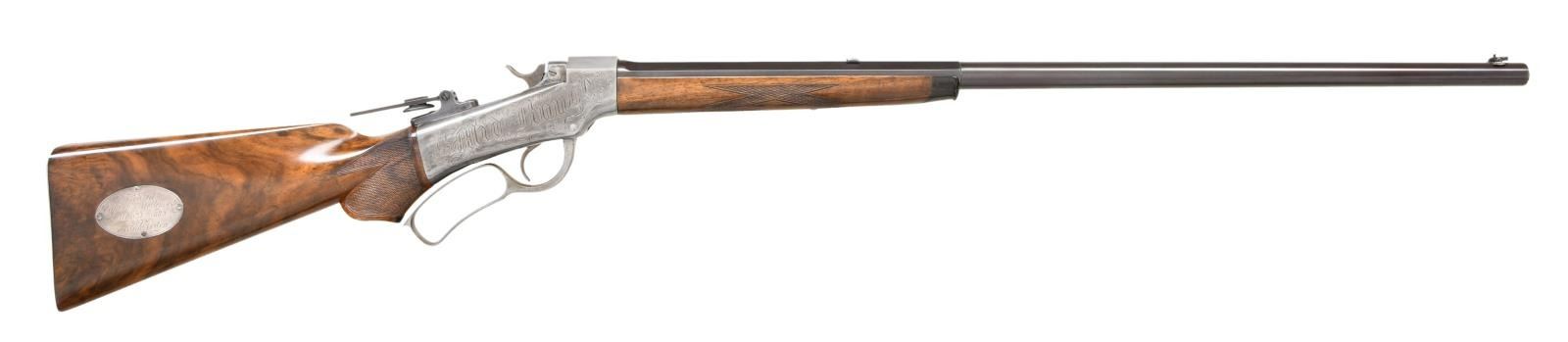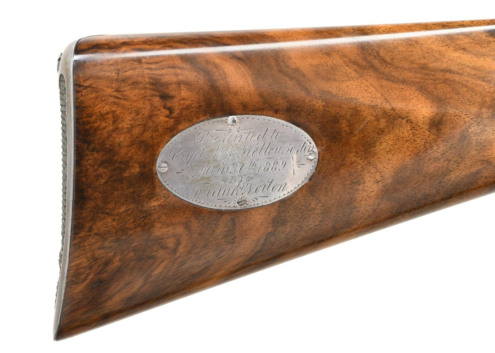 SHOT PRESENTATION RIFLE. Cal. 40-63. S# 1800. Bbl. 28" octagon to round. Combination front sight, filler in rear dovetail w/ mid range peep tang sight. Case colored action features a non-rebated receiver w/ full loop lever. Left side of receiver is engraved "Ballard A-1". Right side is engraved "Mid Range". Horn tipped forearm & S curved pistol grip stock of fancy thin shell walnut w/ hand checkering & steel shotgun buttplate. Right side of stock has a silver oval nameplate marked "Presented to / Capt. M. J. Kelley Boston / May 30th 1889 / by / Frank P. Norton"; consignor states M. J. Kelley is Michael Joseph Kelly (1857-1894), manager of the Boston Beaneaters from 1887-1890, Boston Reds in 1890 & Cincinnati Kelly's Killers in 1891. WEIGHT: 7 lbs, 12.2 ozs. CONDITION: bbl. retains over 90% reblued finish. Action has faded to silver gray. Refinished wood shows small handling marks. Bore retains sound rifling showing small spots of pitting. PROVENANCE STATEMENT: From the Harold Prucha Collection". (01-23227/DS). ANTIQUE. $3500-6000.