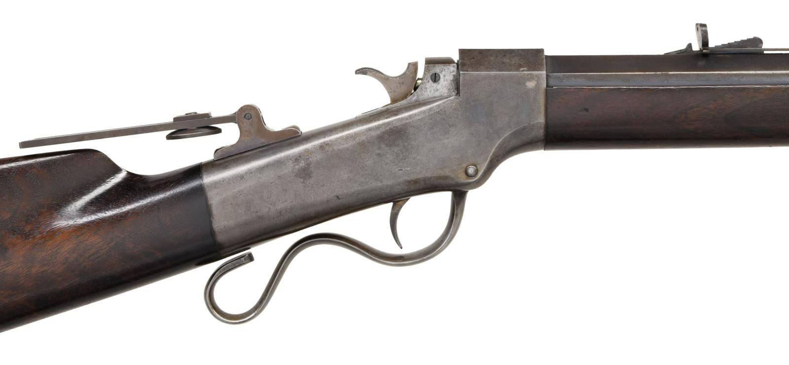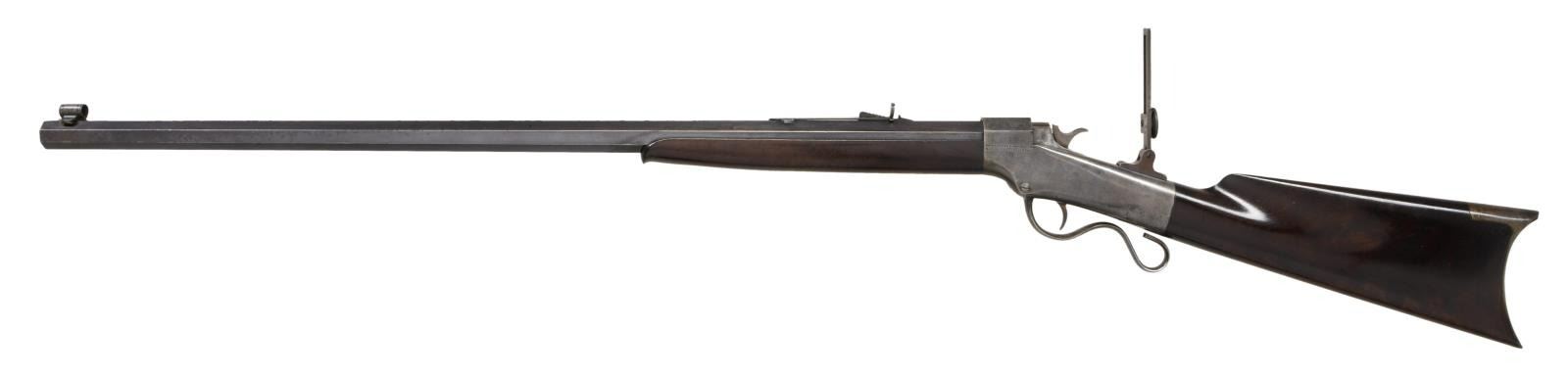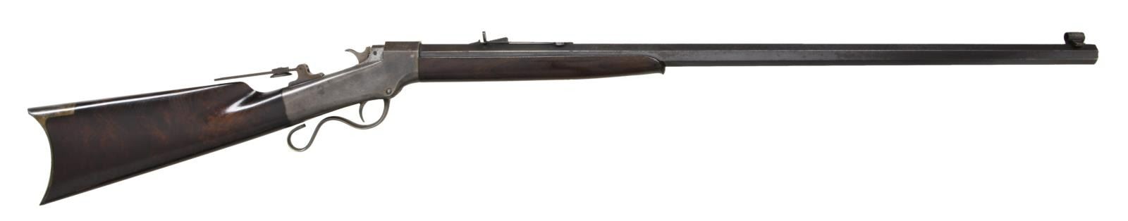 RIFLE. Cal. 40-70 Bottleneck. S# 984. Bbl. 30" octagon measuring 29/32" across flats at muzzle. Globe front sight w/ post aperture, sporting rear sight & long range peep tang sight. Non-rebated frame action w/ early brown style lever & trigger. Ebony tipped schnable forearm & straight gripped stock w/ crescent steel buttplate. CONDITION: bbl. retains 70% lightly faded blue showing scattered spots of corrosion w/ slight edge wear. Action has largely faded to gray showing some lightly visible case colors. Wood has a dark gloss refinish showing a few small marks. Bore is generally bright retaining strong rifling. PROVENANCE STATEMENT: From the Harold Prucha Collection". (01-23240/DS). ANTIQUE. $1400-2000.
