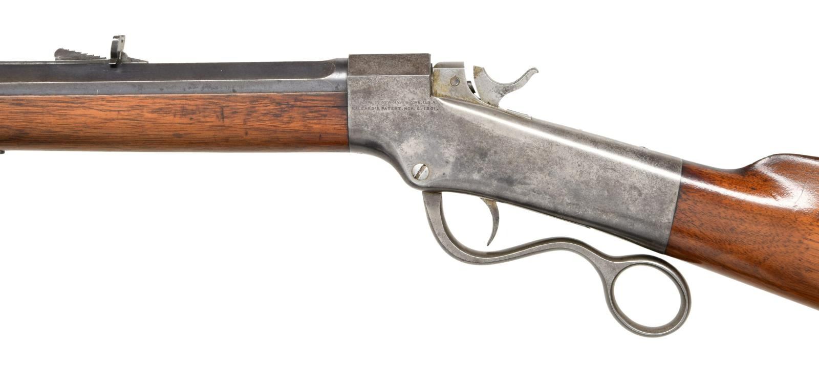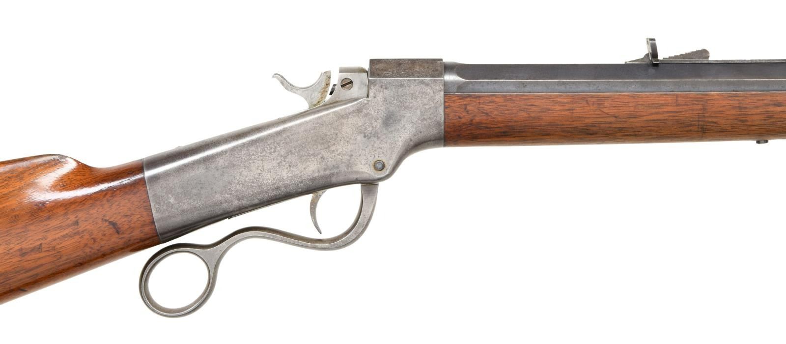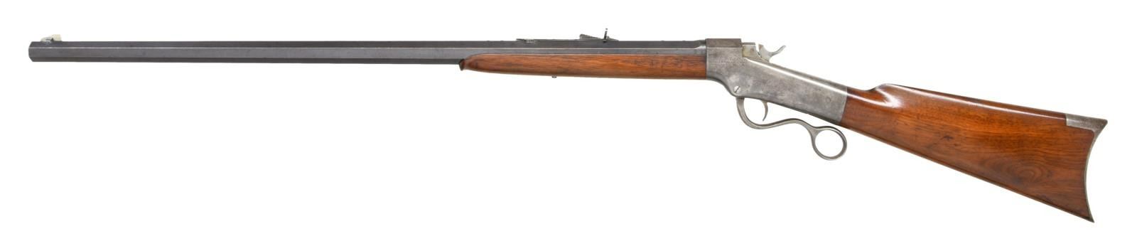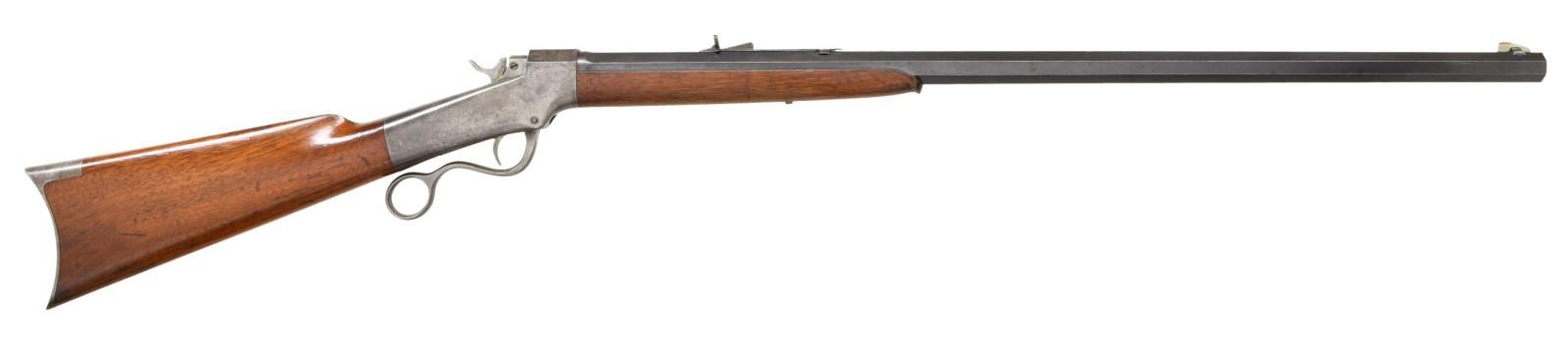 RIFLE. Cal. 44-75 Ballard Everlasting. S# 5116. Bbl. 30" octagon measuring 29/32" across flats at muzzle. Top flat has 4 holes w/ plug screws for apparent scope base attachment. German silver blade rocky mountain front sight w/ semi buckhorn sporting rear sight. Non-rebated frame action w/ the Brown trigger & single trigger ring lever. Ebony tipped schnable forearm & straight gripped walnut stock w/ crescent steel buttplate. CONDITION: bbl. retains 80% lightly faded blue showing edge wear. Action finish is faded to a mottled gray. Wood has added coat of varnish over scratches & marks. Left side of forearm has a hairline crack extending from the action. Bore retains strong rifling showing scattered spots of pitting. PROVENANCE STATEMENT: From the Harold Prucha Collection". (01-23241/DS). ANTIQUE. $1800-2500.