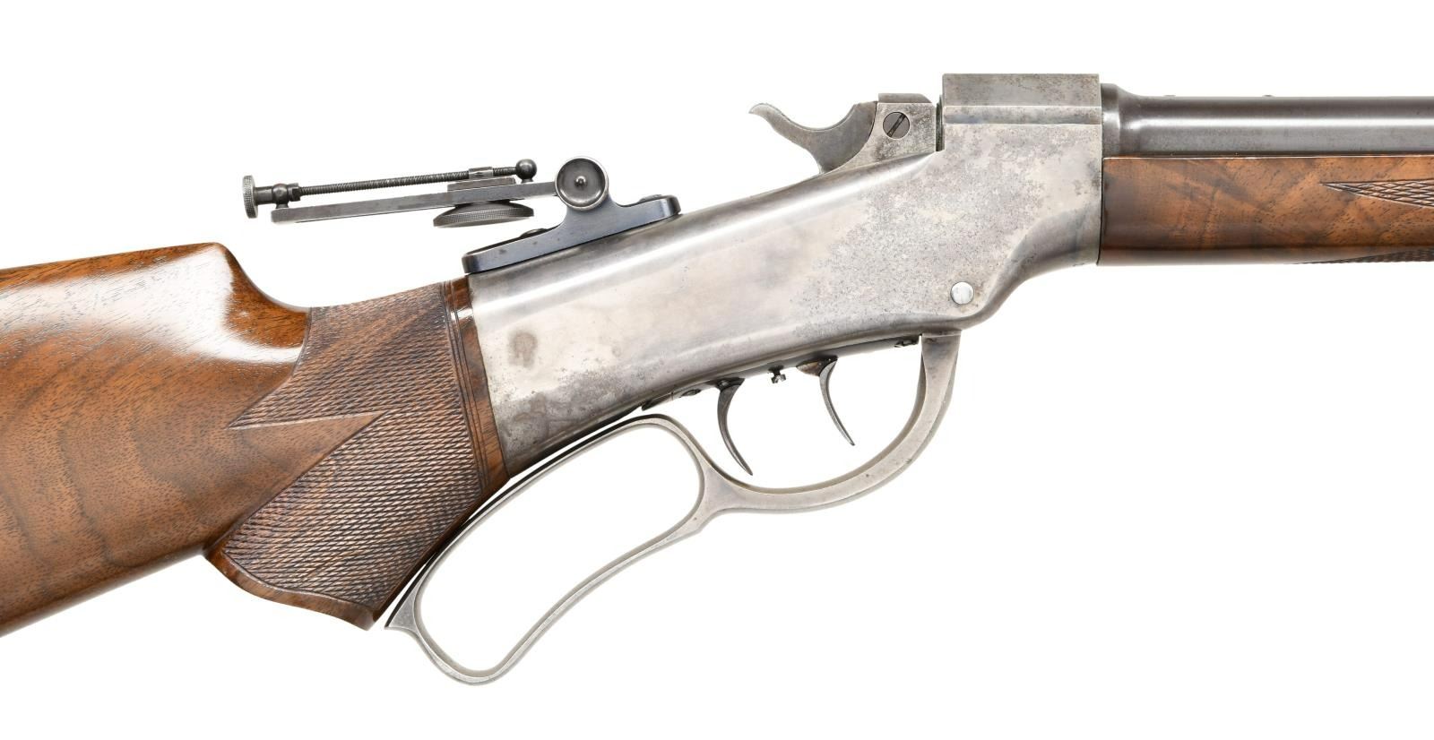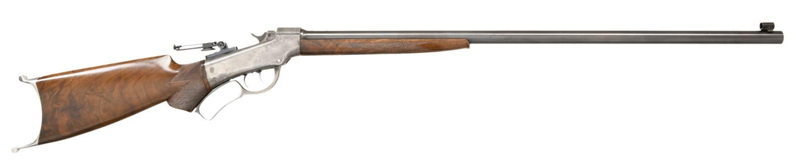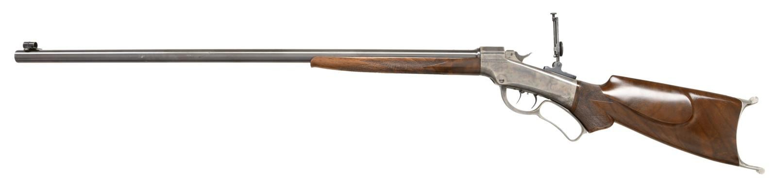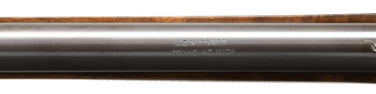 WITH A. O. NIEDNER CUSTOM BARREL. Cal. 22 LR. S# 29384. Bbl. 30" round measuring 7/8" across the muzzle. Top of bbl. is marked "A. O. NIEDNER / DOWAGIAC MICH". Adolph Otto Niedner(1863-1954) was a gunsmith who pioneered cartridge development including the 22 LR & 25-06 Remington cartridges. Globe front sight w/ a mid range graduated peep tang sight. Case colored action w/ rebated frame, full loop lever & slenderized double set triggers. Schnable tipped walnut forearm & S curved pistol grip cheekpiece walnut stock. Features include hand checkering & nickel finished Schuetzen buttplate. CONDITION: bbl. retains over 90% blue showing small handling marks & has plug screws in 4 holes for scope mount attachment. Action retains 30% nicely visible case colors w/ an area of light corrosion on left side. Refinished wood & refreshened checkering shows a few light marks. Properly operating set triggers. Very good bright bore. PROVENANCE STATEMENT: From the Harold Prucha Collection". (01-23235/DS). ANTIQUE. $3000-4500.