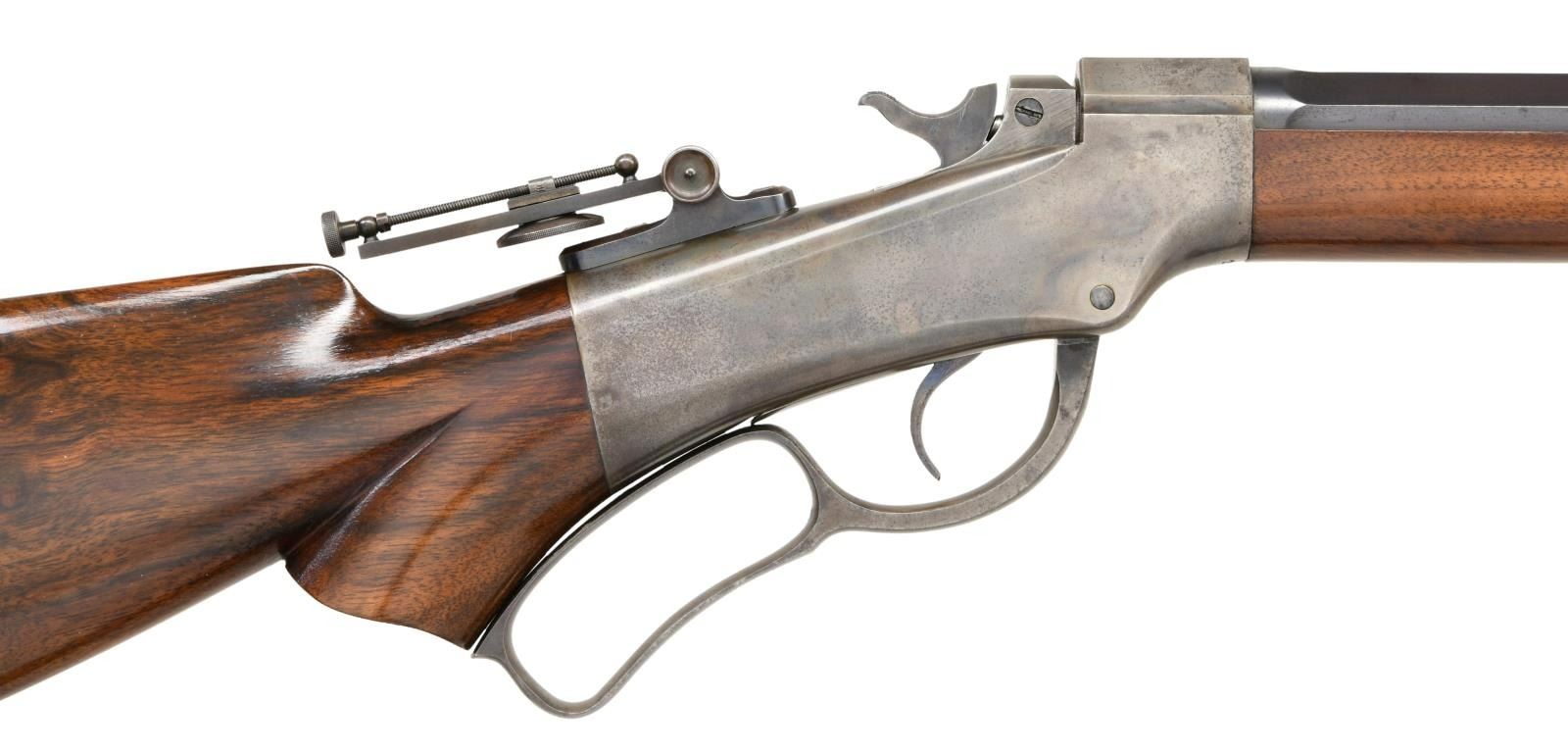 SINGLE SHOT RIFLE. Cal. 38-55. S# 22747. Bbl. 30" octagon to round. Wind-Gauge globe front sight w/ circular aperture & Marlin improved Vernier tang sight. Case colored action features rebated frame & full loop lever. Schnable tipped forearm & S curved pistol grip cheekpiece walnut stock w/ nickel finished Schuetzen buttplate. CONDITION: over 95% bbl. blue showing scattered small spots & marks. Frame retains 50% lightly visible case colors. Original wood finish shows a few small scratches & marks. Bore is bright w/ sharp rifling. PROVENANCE STATEMENT: From the Harold Prucha Collection". (01-23237/DS). ANTIQUE. $2500-4000.