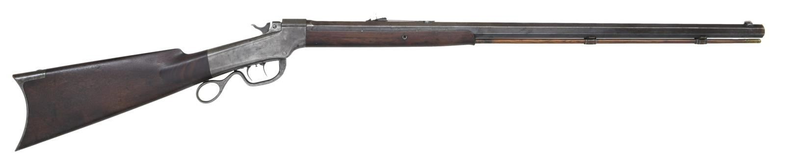 SHOT RIFLE. Cal. 38-55. S# 23230. Bbl. 30" octagon measuring 7/8" across flats at muzzle. Muzzle is stamped "C, C" German silver blade rocky mountain front with elevator adj. sporting rear sight. Rebated frame action features the split style breechblock small ring trigger guard, slenderized triggers and reverse curved hammer. Walnut forend and straight grip stock with crescent steel buttplate. Bottom of forend is stamped "CY. COLE". Brass tipped Hickory ramrod is held by 2 faceted pipes. CONDITION: action shows faint traces of case colors. Bbl. has 40% dull fading blue. Refinished wood shows scratches, marks & small chips. Stock has a large added wood repair on right side behind the action with a hairline crack on the right. Tight action, functioning triggers. Clean bore retains sharp rifling. (01-23332/DS). ANTIQUE. $2,250-3,000.