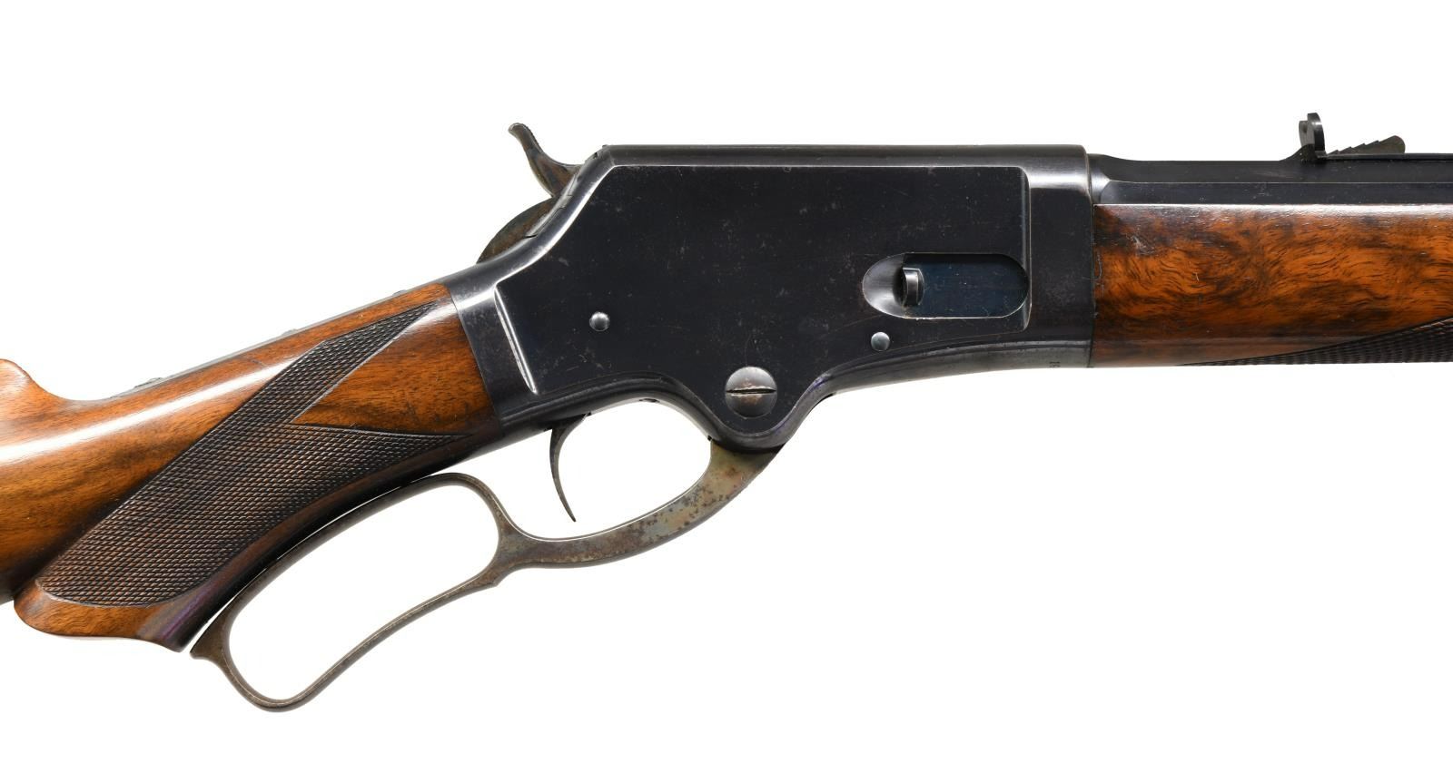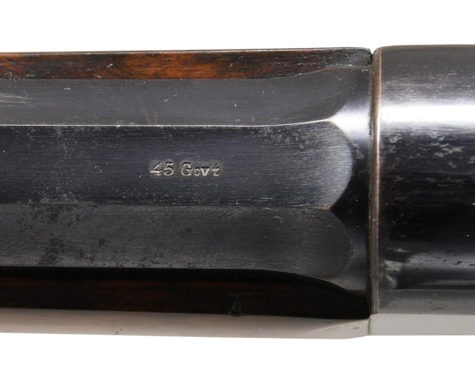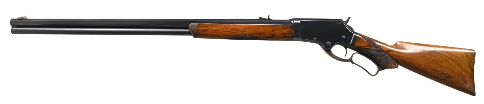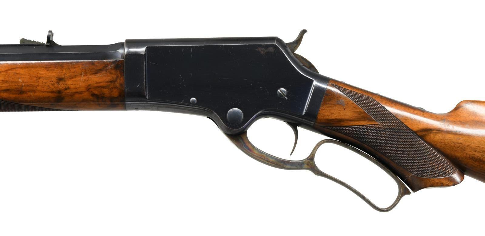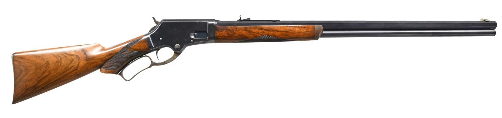 Cal. 45 Govt, (45-70). S# 16505. Bbl. 28" octagon. German silver blade rocky mountain front sight w/ sporting rear sight. Blue finish w/ case colored hammer & lever. Full length mag. Forearm & S curved pistol grip stock of fancy walnut w/ no. A checkering. LOP: 12 7/8" over a steel shotgun style buttplate. Mfg. 1888. CONDITION: very fine retaining over 90% blue showing slight edge wear w/ small spots of corrosion & light scratches. Hammer & lever retain over 50% case colors showing light fading & spotting. Forearm cap has faded to brown. Very good original wood finish & checkering showing scattered scratches, marks & small dents. Bore retains strong rifling showing a few spots of pitting. (01-24149/DS). ANTIQUE. $12500-17500.