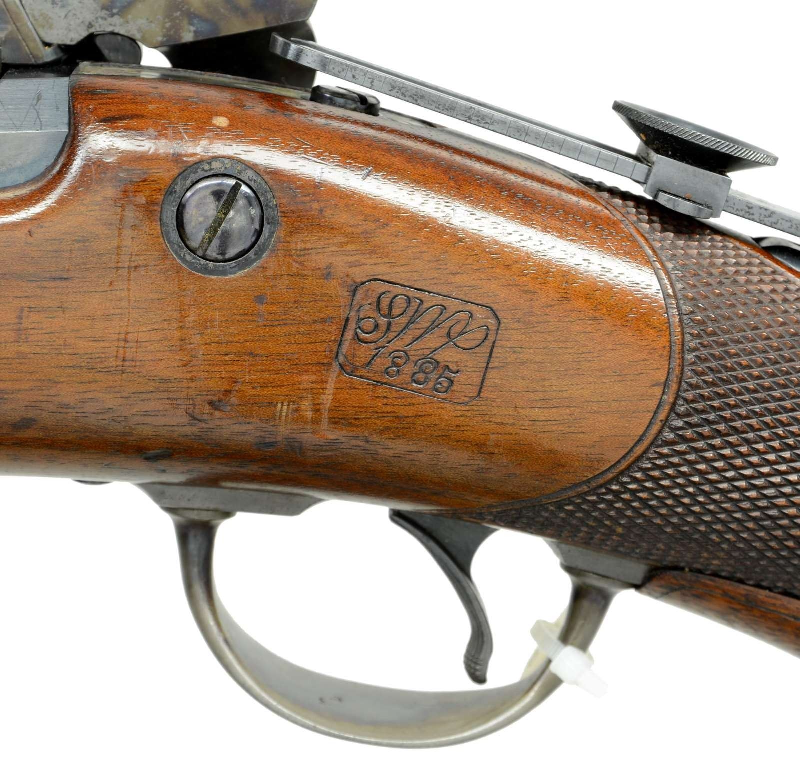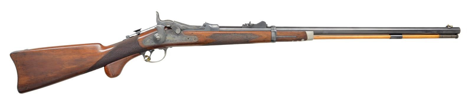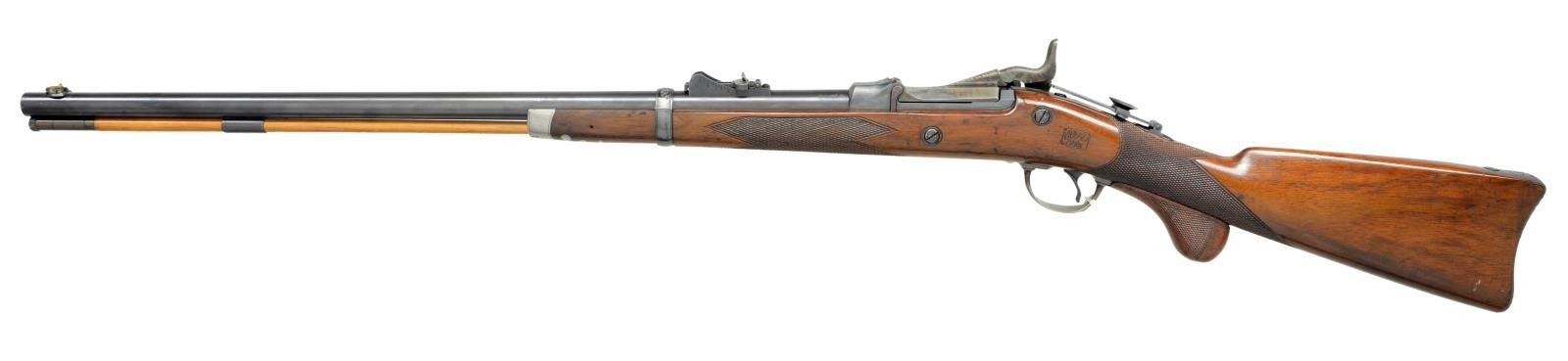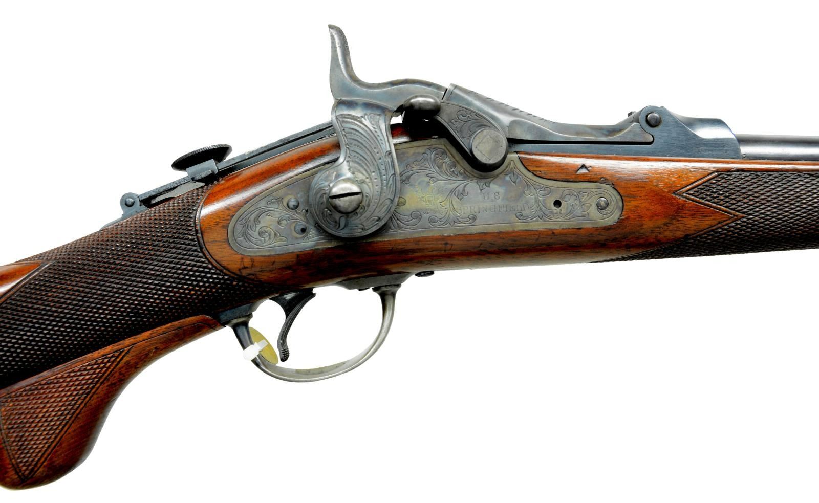 MODEL US TRAPDOOR RIFLE. Cal. 45-70. NSN. A total of 477 officers model rifles were produced between 1875-85. Most of these were purchased by officers with about 100 issued to officers in militia & guard units. The remainder were sold to commercial outlets after the adoption of the Krag rifle. Only 100 type III rifles were mfg. in 1885. Type III rifles differ from earlier styles by their stock type which has a 5/8" longer forearm tip. The nickel finished pewter nosecap is squared at the front rather than rounded, still having a long floral finial & engraving. Single band fastened short comb stock has checkered forearm & wrist with a checkered detachable wood pistol grip. Left ear of stock has a clear 1885 dated "SWP" cartouche. Bbl. & receiver finish is blued. Model 1879 style action. 1873 dated low arch breech block with Springfield marked lock. Breech block, top tang, lock, hammer & trigger guard have case colored finish. These parts along with the front receiver ring, bbl. band & buttplate have moderate coverage of scroll hand engraving with straight lined borders. Bbl. is 26" round. Beech front sight with gold washed folding ring, with model 1879 rear sight & Springfield vernier tang sight. Hardwood cleaning rod with brass fittings is held by a single iron band. WEIGHT: 8 lbs, 2.4 oz. CONDITION: exceptional and very fine all original rifle. Bbl., frame & fittings retain over 95% original blue obtaining a slightly plum cast with age. Lock, breech block, trigger guard & tang retain over 80% lightly muted case colors. Original wood finish shows scattered scratches, marks & small dents. Lock area shows small cracks & chips. Mechanics are fine. Exceptionally nice bright bore retaining strong rifling. PROVENANCE: From the estate collection of Thomas J. Mulligan. (01-23378/DS). ANTIQUE. $15,000-25,000.