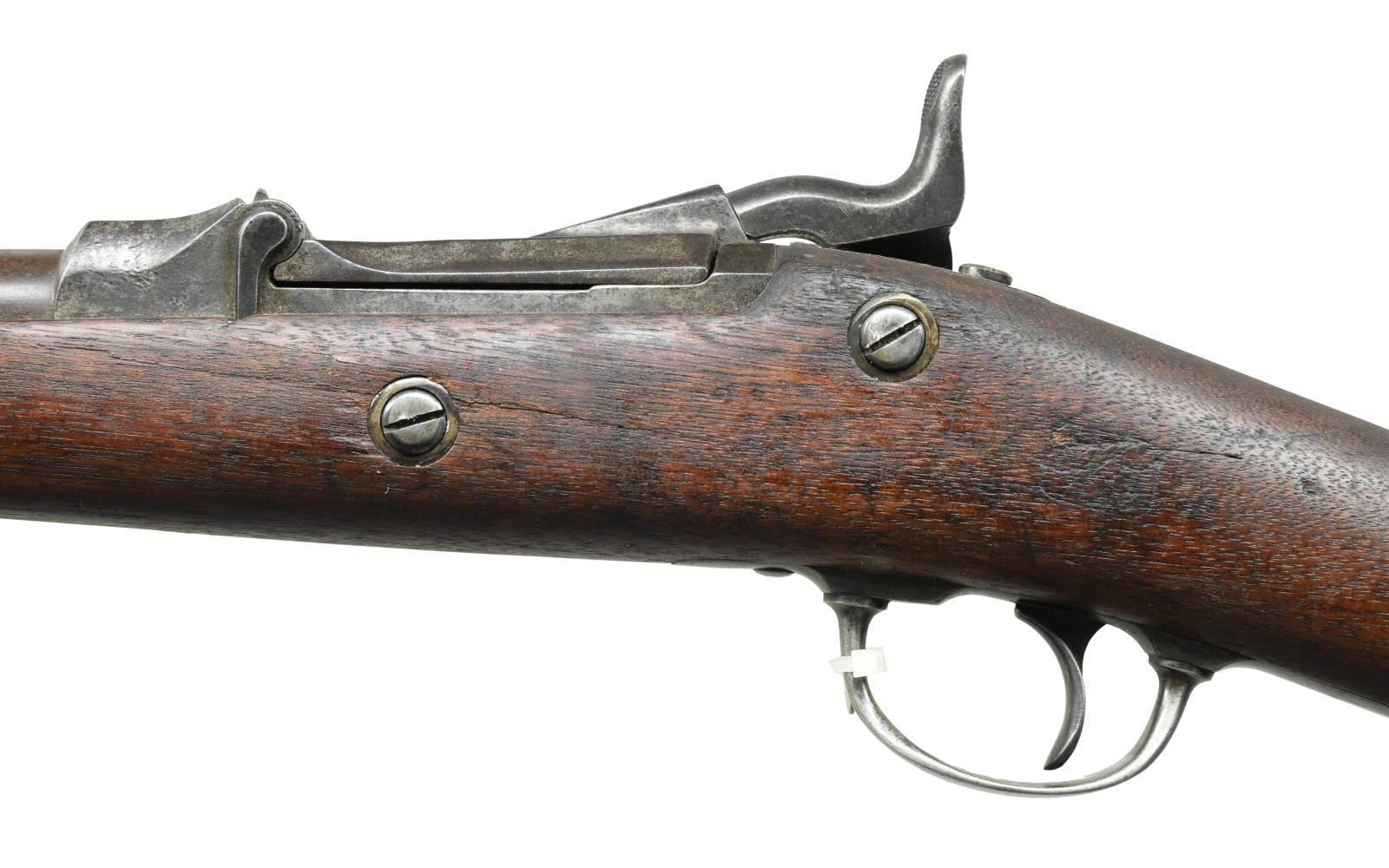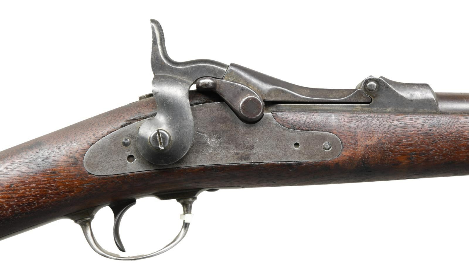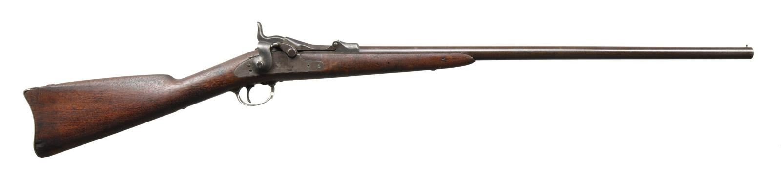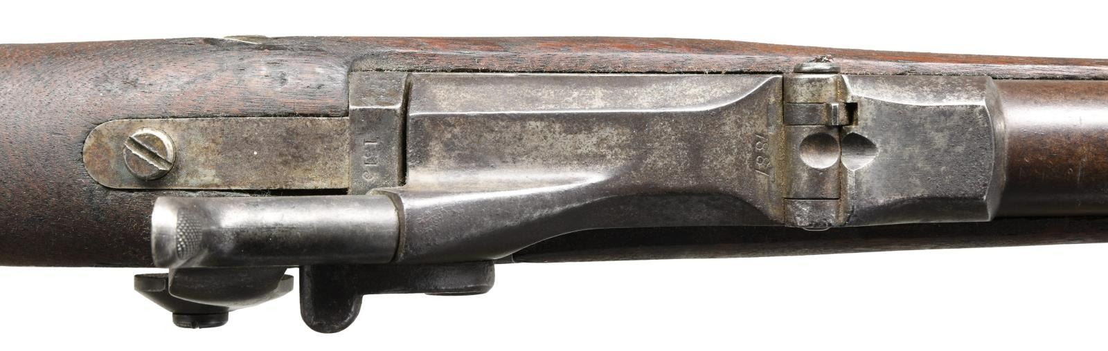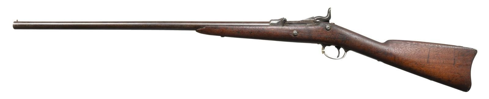 Cal. 20 ga brass shell. S# 1315. Bbl. 26" round w/ brass bead. Model 1879 receiver is enlarged for shot shell w/ special extractor. 1881 dated lower arch breech block. Springfield marked lockplate. Half length stock has partially visible cartouche on left side. Made for use by government hunters & scouts at western military outposts. Last known issue date was in Alaska in 1906. Total quantity of 1376 mfg. 1881-85. CONDITION: metal finish had faded to gray brown showing scattered pitting. Stock has dark weathered appearance w/ dents & handling marks having chips around buttplate & forearm areas. Dark pitted bore. PROVENANCE: From the estate collection of Thomas J. Mulligan. (01-23380/DS). ANTIQUE. $1000-1500.