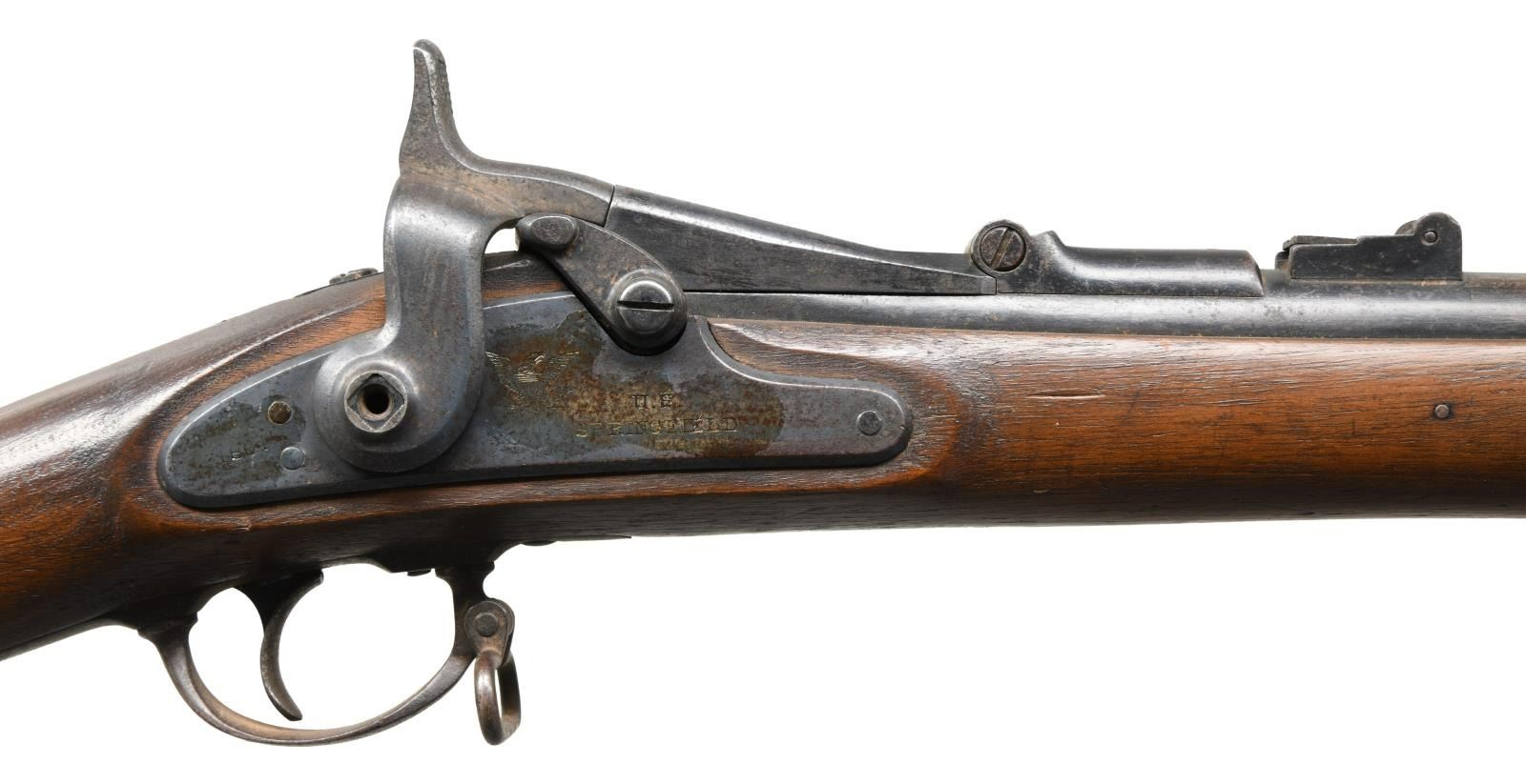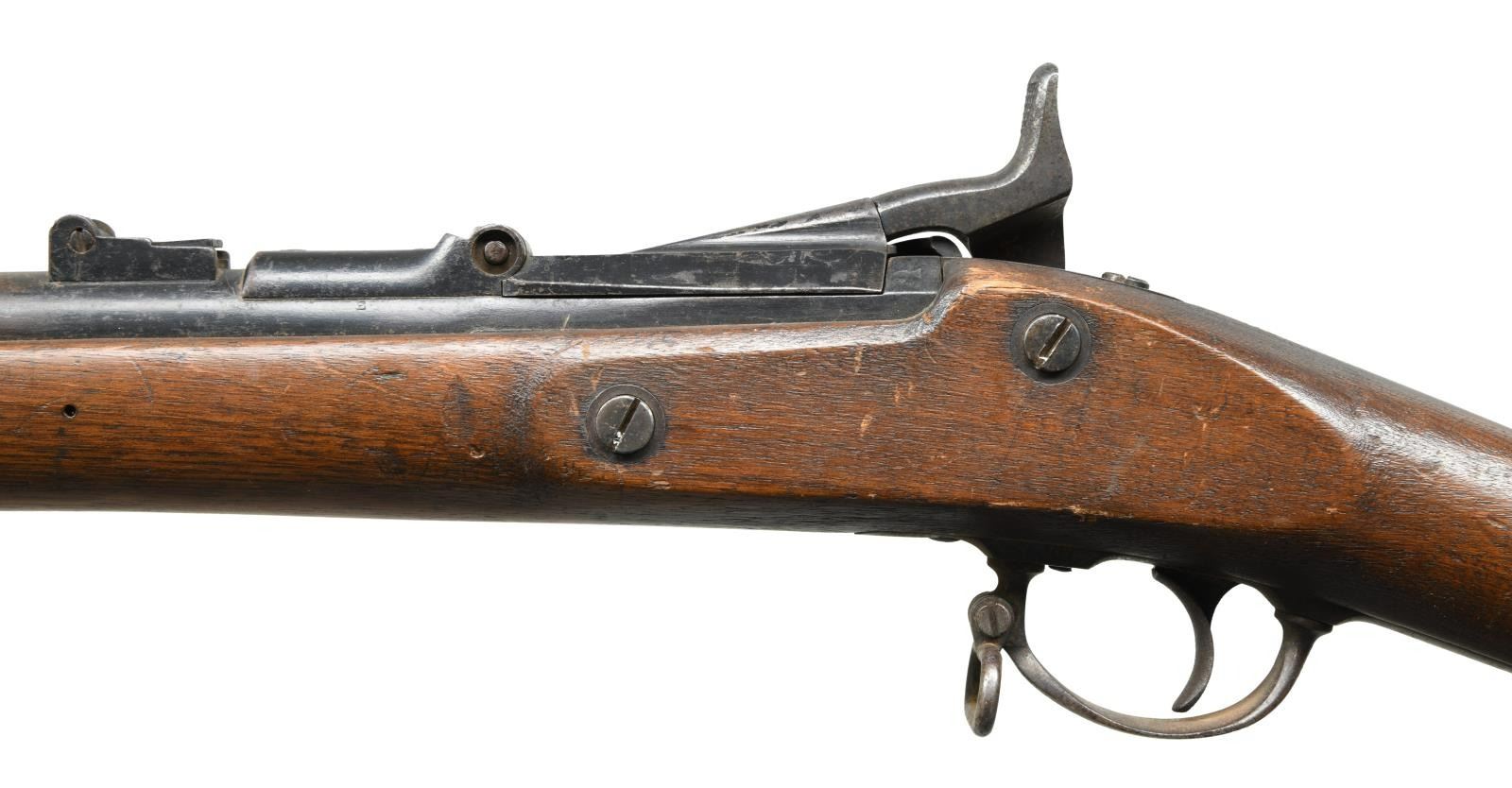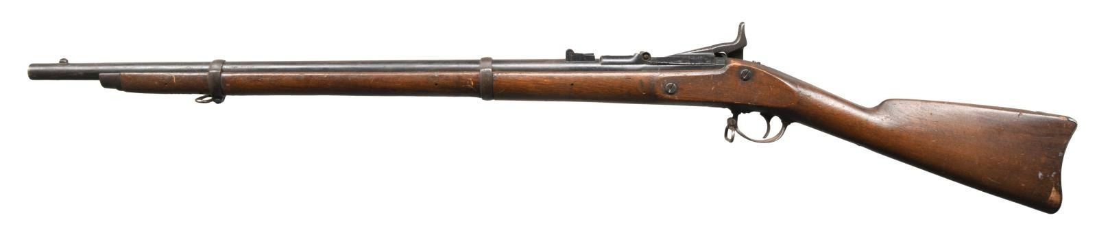 RIFLE. Cal. 50-70. NSN. Bbl. 27" cut down. Blade front sight. Folding leaf rear sight. 2nd Model Allin converted to a cadet style rifle possibly by Bannerman or the like. Breechblock dated 1866 w/ eagle. Lock is dated 1864 w/ US eagle, 1864 date & Springfield markings. Hammer & left breechblock screws are missing. Walnut stock w/ bottom mounted sling swivels. No ramrod present. CONDITION: stock appears sanded w/ scattered dings & handling wear. Metal retains 30% of an old reblue finish w/ a couple areas of dried varnish, scattered oxidation & overall fading to brown. Bore shows scattered pitting & oxidation. (01-23967/MJC). ANTIQUE. $600-900.