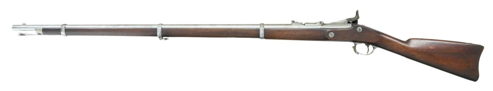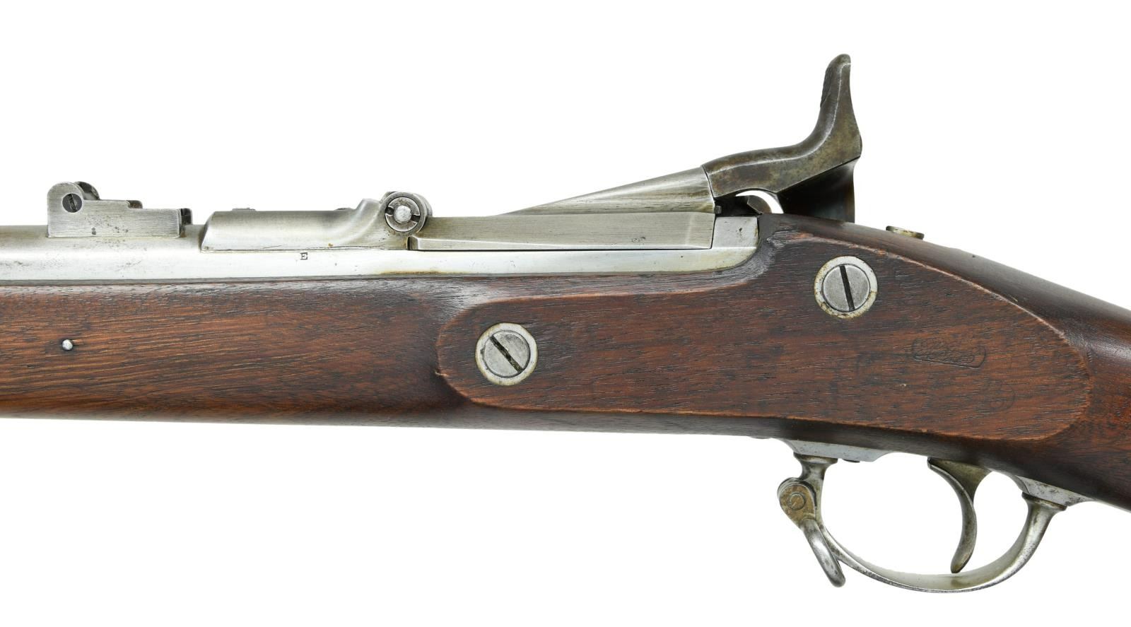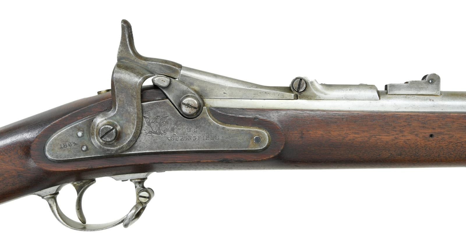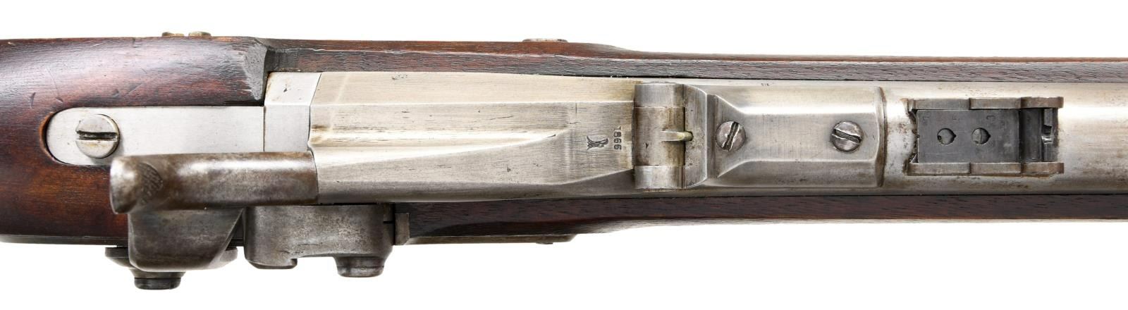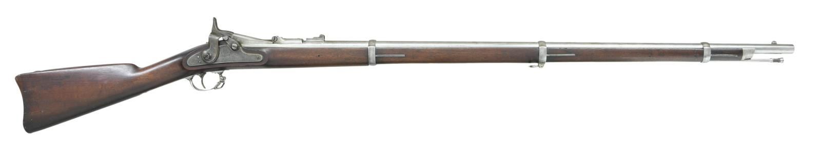 Cal. 50-70. NSN. Bbl. 36 5/8". Blade front sight. Folding leaf rear sight. Case colored 1864 dated Springfield lock assembly w/ US eagle. Top of breechblock dated 1866 w/ US eagle. Balance of metal has armory bright finish. Walnut stock w/ three bands. Left stock flat has one partially faded inspector cartouche w/ a second faint illegible cartouche. Slotted tip ramrod present. CONDITION: stock appears lightly sanded w/ scattered dings & handling wear. Lock assembly is mostly gray w/ scattered traces of case colors & oxidation. Balance of metal remains partially bright w/ areas turning to a gray patina & scattered oxidation. Very good bright bore w/ some light pitting. PROVENANCE: From the Lifelong Collection of Glen E. Mattox. (01-22493/MJC). ANTIQUE. $800-1200.