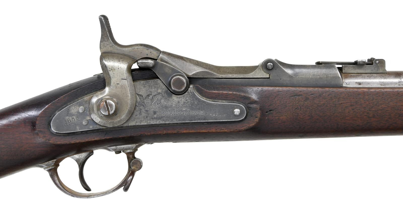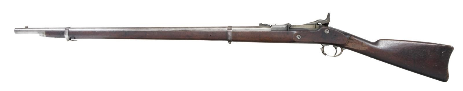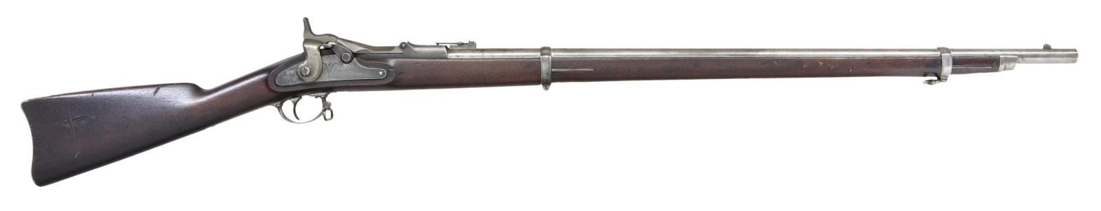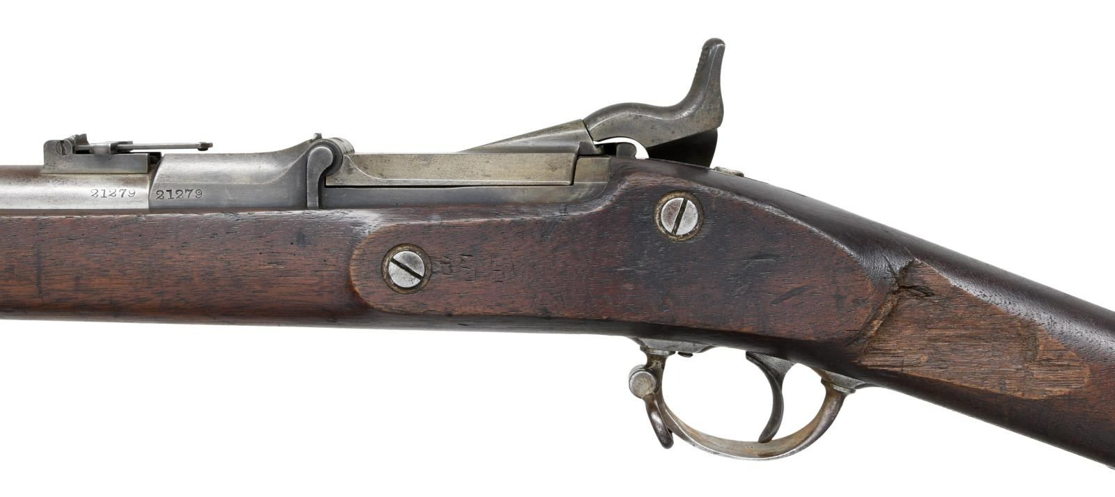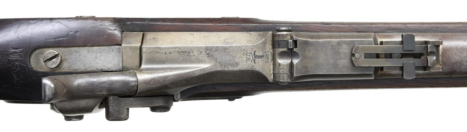 RIFLE. Cal. 50-70. S# 21279. Bbl. 32 5/8". Blade front sight. Ladder rear sight graduated to 900yds. Matching numbers on bbl. & receiver. 1870 dated high arch breechblock. 1863 dated Springfield lock. Walnut stock w/ bottom mounted sling swivels. No ramrod present. Right side of butt has odd cross carving. Left stock flat has upside down carved "195". Top of wrist has another carved number that appears to be "1952". CONDITION: left side of stock has large 2 3/4" chipped area behind stock flat, stock otherwise shows some chipping in ramrod channel, a crack running from behind upper tang to chipped area, another crack behind lock, scattered dings & handling wear. Metal is mostly a gray patina w/ some traces of original case colors, a few areas of pitting & scattered oxidation. Fair bore w/ scattered pitting & oxidation. (01-23755/MJC). ANTIQUE. $600-900.