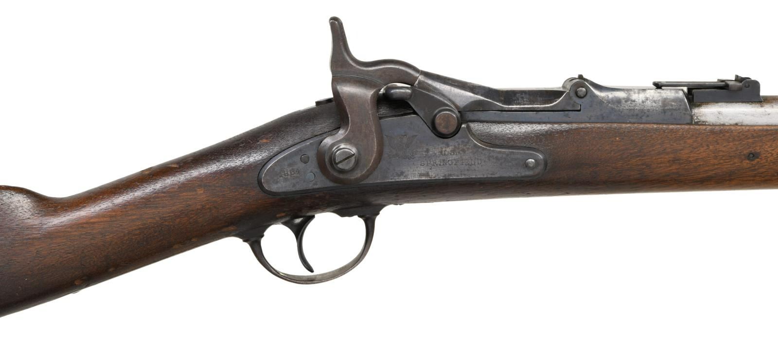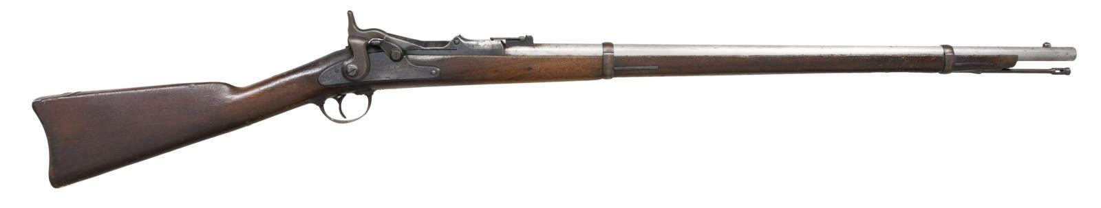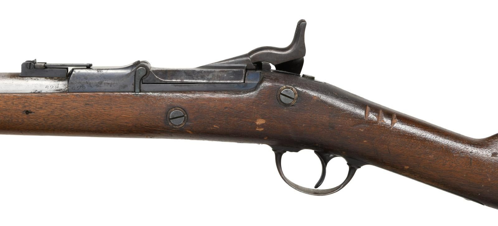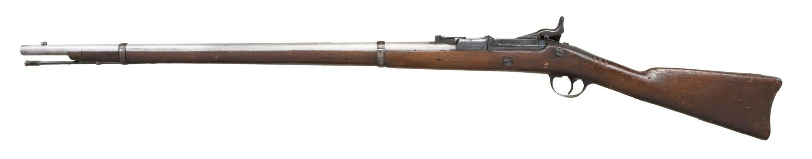RIFLE. Cal. 50-70. S# 629. Bbl. 29 5/8". Blade front sight. Ladder rear sight graduated to 900yds. Matching numbers on receiver & bbl. Breechblock has 1870 date, eagle & "US" marking. Lock has 1864 date, eagle & "US SPRINGFIELD" marking. Blued trigger guard, upper tang, lock, rear sight, breechblock & receiver. Walnut stock w/ two bands & lacking sling provisions. Slotted tip ramrod present. CONDITION: stock shows an old sanding w/ added finish, some chipping in ramrod channel, three added notches on left side of wrist, some paint remnants on toe, scattered dings & handling wear. Bbl. appears cleaned long ago w/ some oxidation & dings. Bands, hammer & trigger guard are turning gray w/ scattered oxidation. Rear sight, breechblock, receiver, upper tang & lock retain strong amounts of an old reblue w/ scattered oxidation & fading. Fair bore w/ scattered patches of pitting but strong rifling. (01-24204/MJC). ANTIQUE. $500-800.