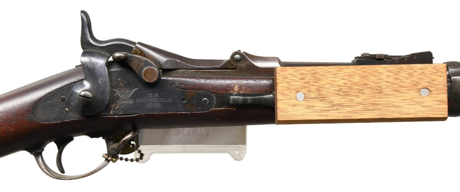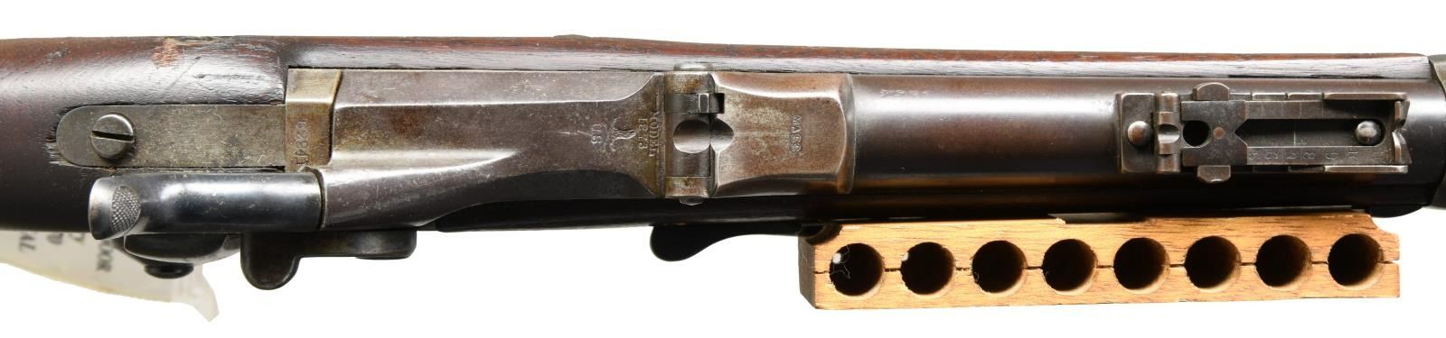 BLOCK. Cal. 45-70. S# 62941. Bbl. 32 5/8". Fixed front sight w/ slide on cover & model 1873 rear sight. 1873 dated high arch breech block w/ 1873 dated Springfield lock. Receiver ring has State of Massachusetts marking "MASS". 2 band walnut stock w/ ESA cartouche referring to principal subinspector Erskin S. Allin. Toeline of stock has initials "AL" w/ circle "P" firing proof. Right side of stock is fitted w/ the experimental Metcalfe 8 round cartridge block attachment. 1008 model 1873s were fitted w/ the Metcalfe device in 1876. No evidence exists to show they were issued. Metcalfe parts appeared as surplus into the 1940s. CONDITION: metal retains over 80% lightly faded blue. Stock has age darkened appearance showing scratches & marks. Metcalfe block is in very good condition. Bright bore retains lightly worn rifling. PROVENANCE: From the estate collection of Thomas J. Mulligan. (01-23388/DS). ANTIQUE. $1000-2000.