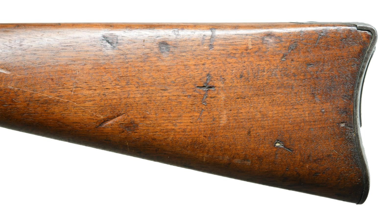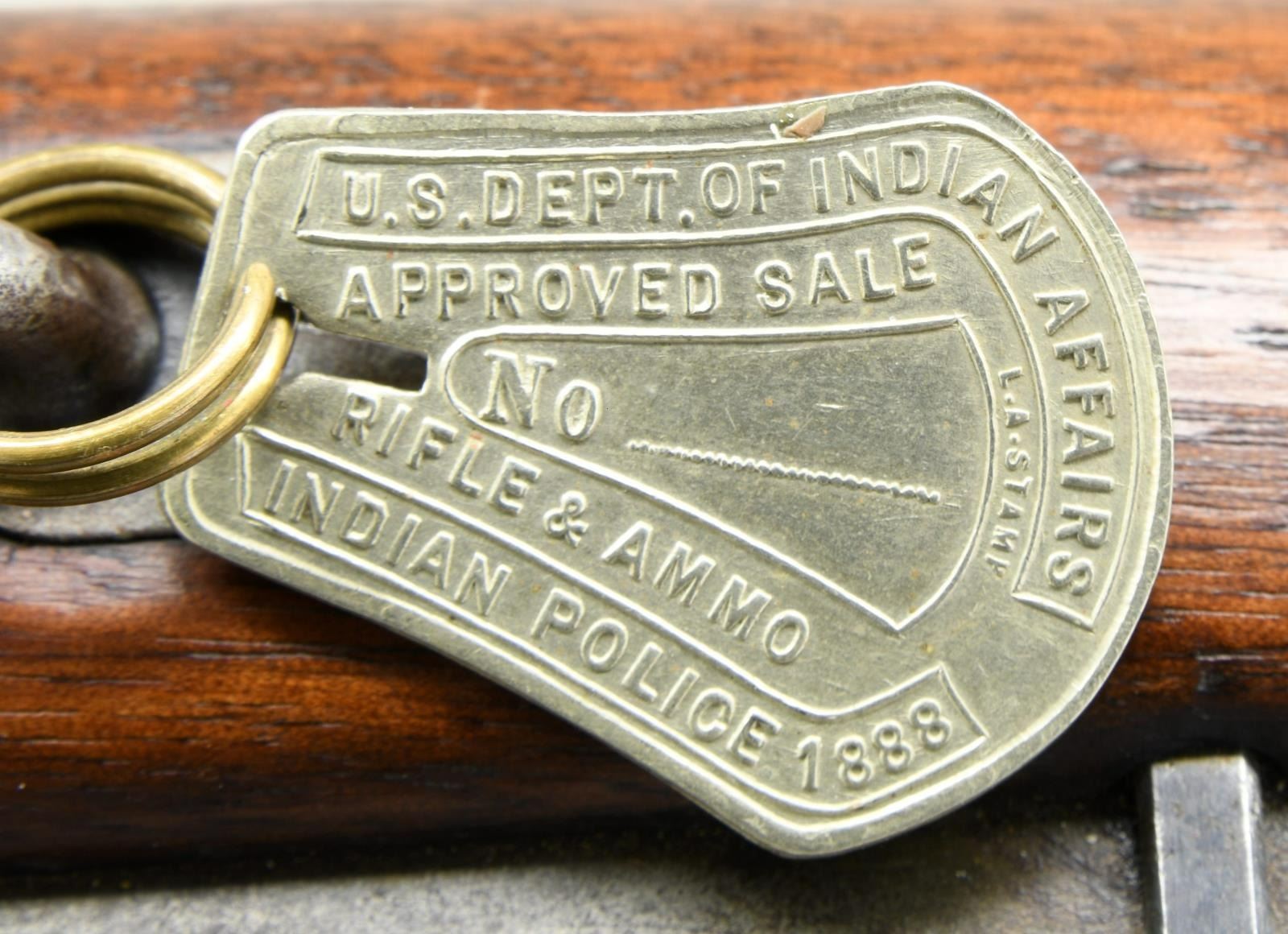 Cal. 45-70. S# 140261. Bbl. 22". Pinned blade front sight. Model 1879 rear sight. 1873 dated high arch breechblock. Flat style lock plate. Band fastened carbine stock w/ trapdoor carbine buttplate having saddle ring & bar on left side. A Wendell Grangaard, The Guns of History, Inc letter is included. Togia is the pictorial language of the Sioux. Wendell translates the Togia markings on this carbine as "the man who carries the sword". Born in 1847 into Red Cloud's Band of Sioux, he was given the name George Sword when he converted to Christianity. He fought at the Little Bighorn & was one of the original Indian Police on the Pine Ridge Reservation, 1879-1885. The letter further states that Sword would have been issued this carbine sometime before 1882. George Sword died of tuberculosis in 1910. UNATTACHED ACCESSORIES: triangular bayonet & metal scabbard. 2 sections of a 3 piece cleaning rod held in the stock compartment. A metal Indian Police tag from the US Department of Indian Affairs dated 1888. Binder containing Wendell's letter includes several photos of the rifle along w/ historical information & photographs about the Pine Ridge Indian Police. CONDITION: bbl. & lock plate retain 50% dull faded blue. Action has faded to gray. Stock shows heavy wear w/ dents & marks retaining Togia markings. Pitted bore retains largely intact rifling. (01-23411/DS). ANTIQUE. $1500-2500.