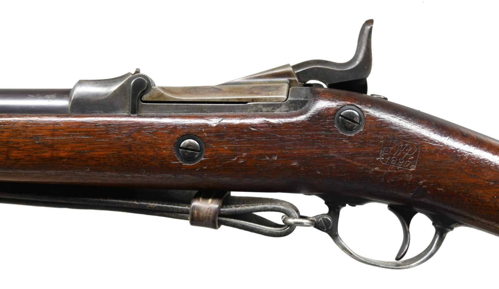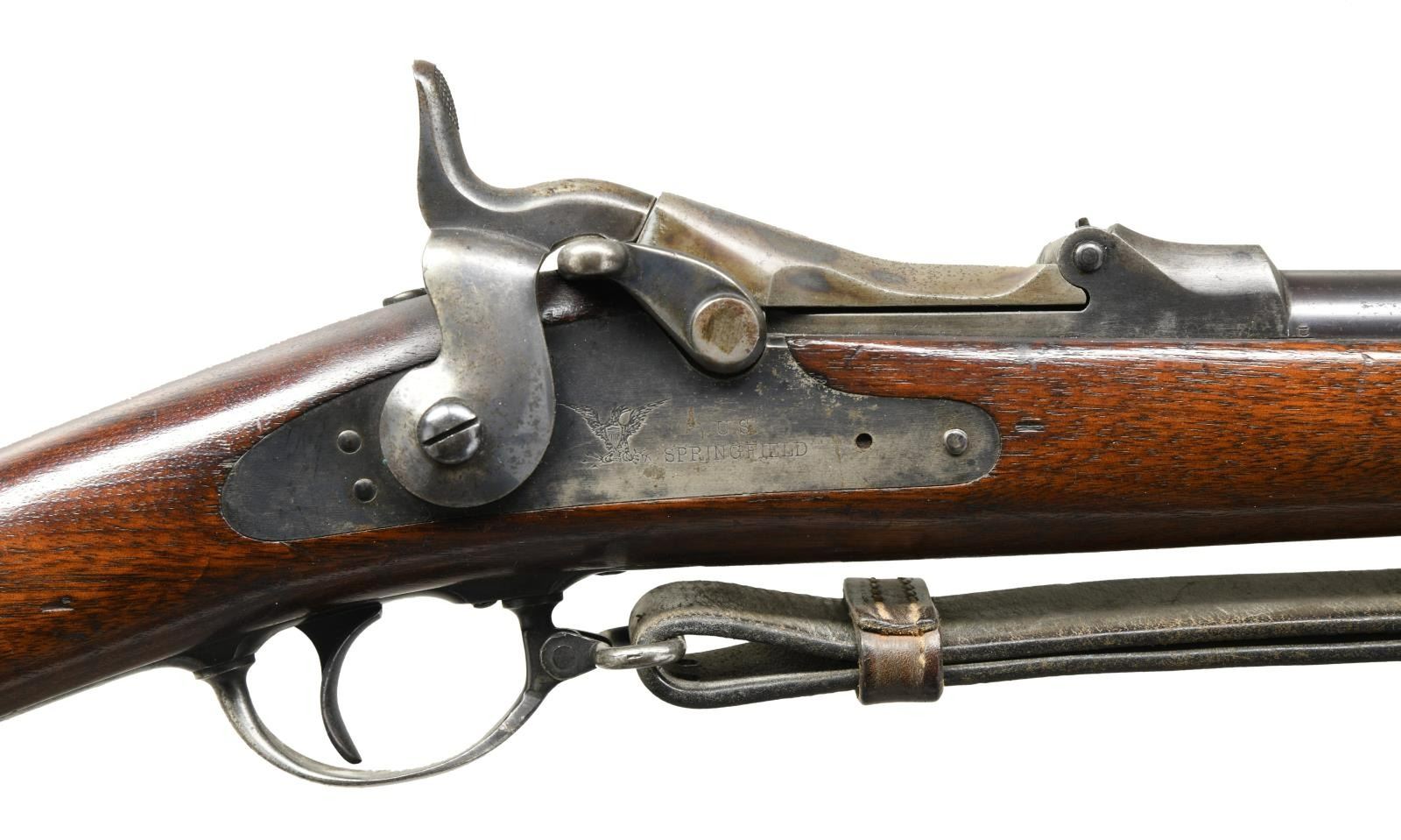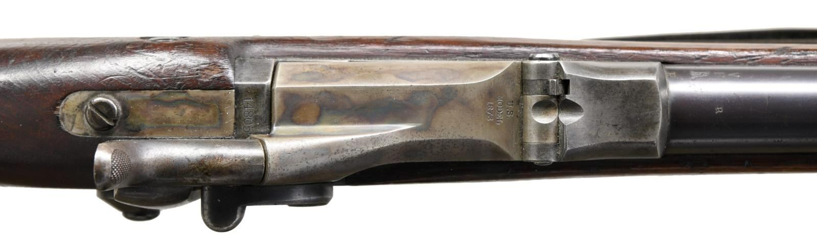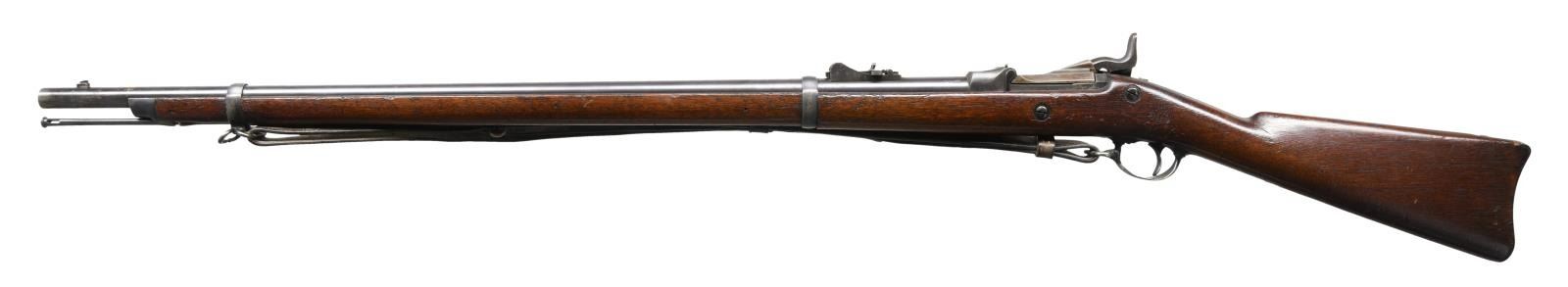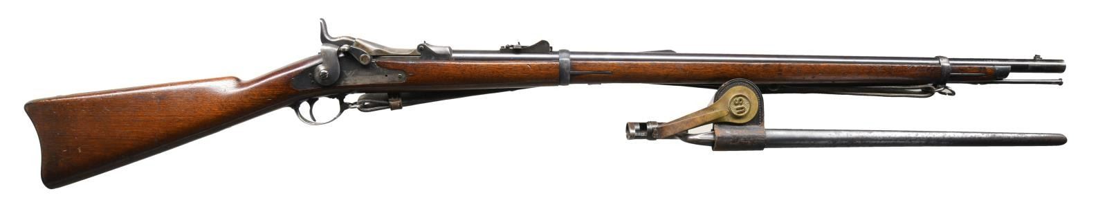 Cal. 45-70. S# 148050. Bbl. 32 5/8". Pinned blade front sight w/ model 1879 rear sight. 1873 dated case colored low arch breech block. Springfield marked flat block plate. 2 band walnut stock. Left ear has 1880 dated "SWP" cartouche. Toeline has circle p firing proof. Original military leather sling. Slotted tip iron ramrod. UNATTACHED ACCESSORIES: US marked triangular bayonet w/ scabbard & frog. Shank of bayonet is stamped "38". CONDITION: metal retains over 80% original finish showing fading on breech block & lock plate. Stock shows moderate wear w/ numerous scratches, dents & marks. Bright bore retains sharp rifling. (01-24037/DS). ANTIQUE. $800-1200.