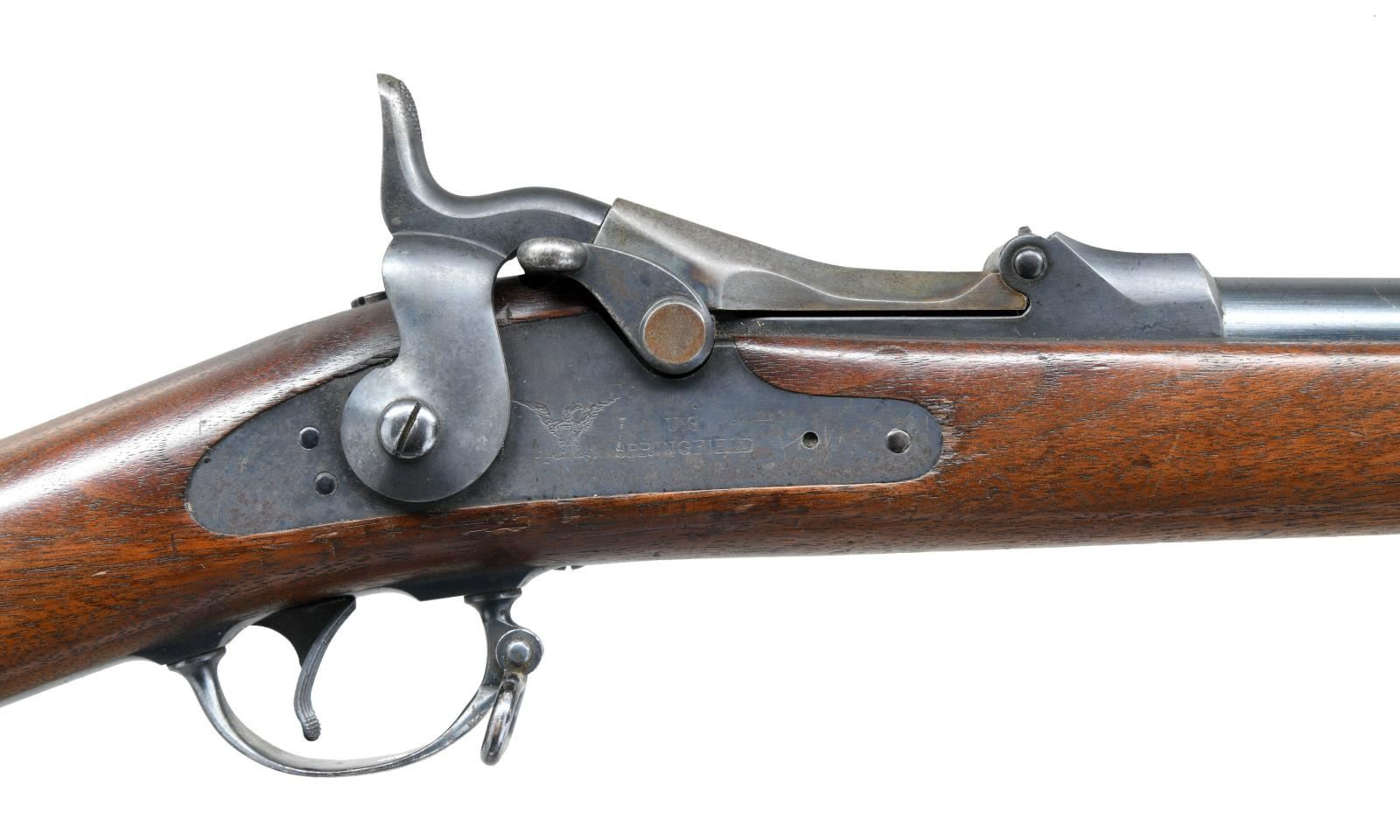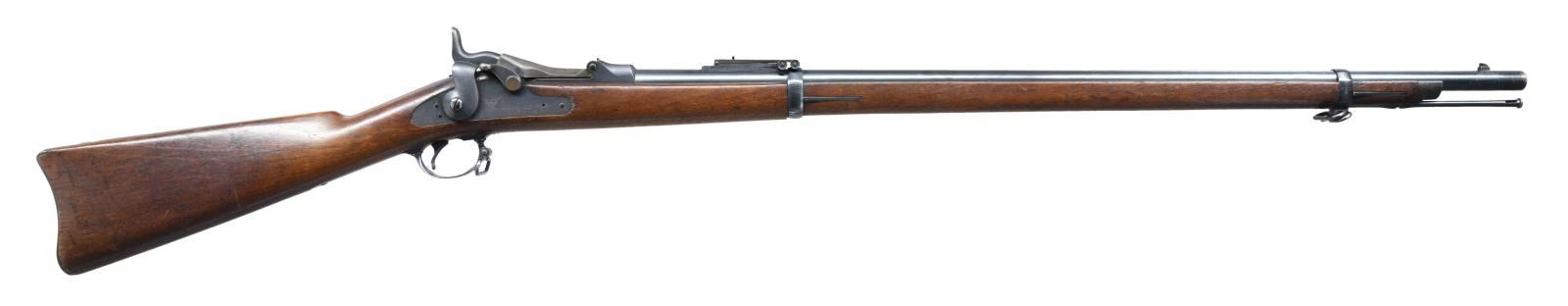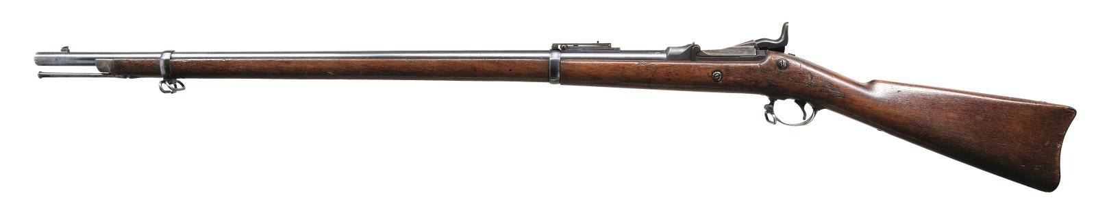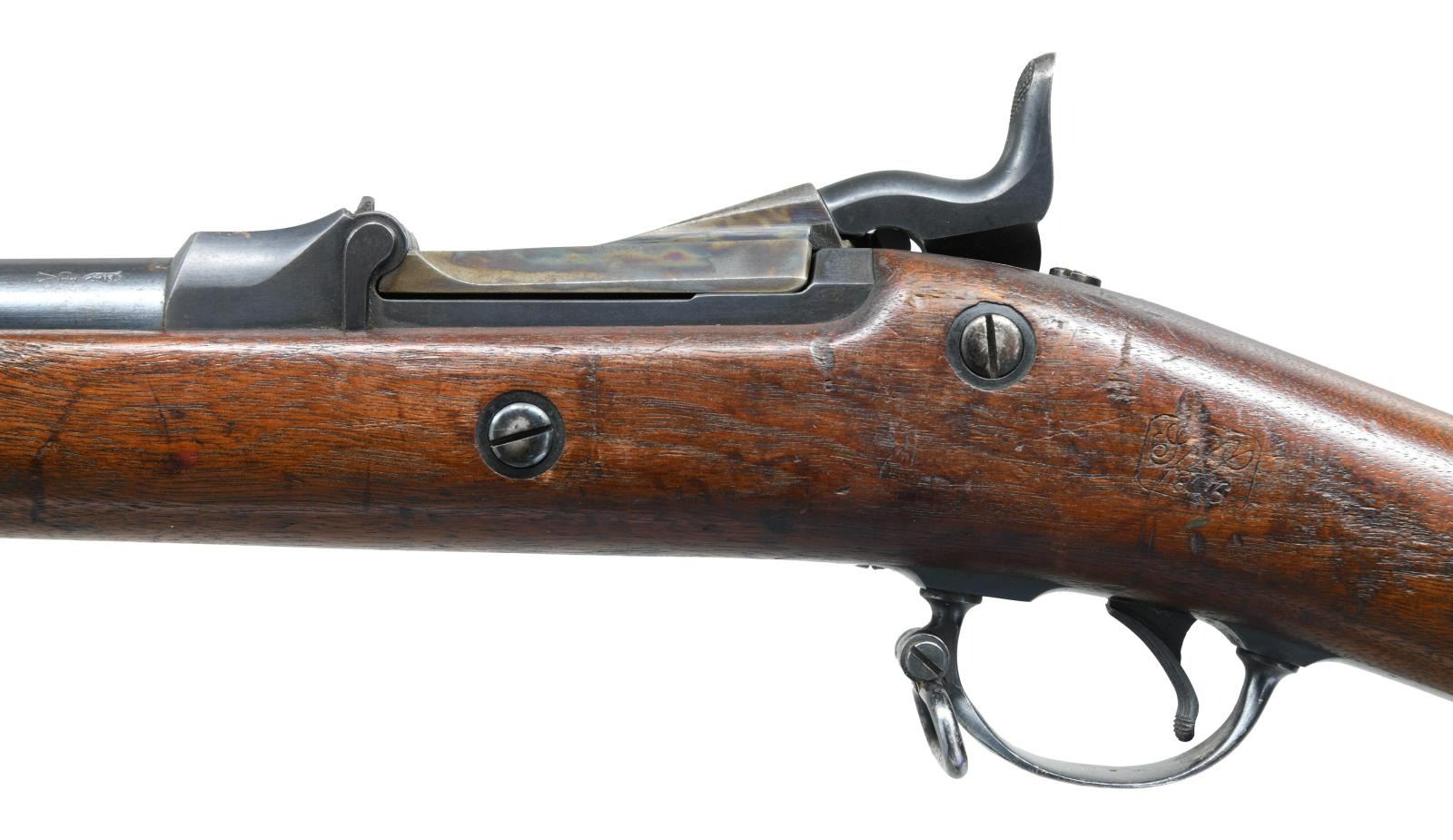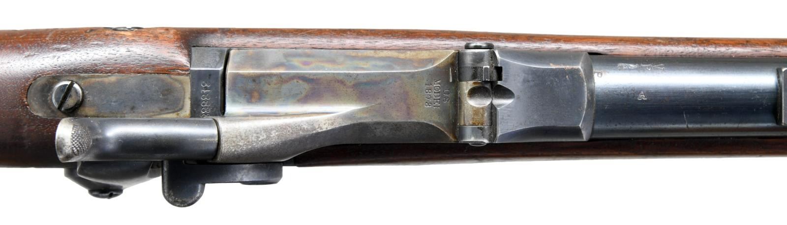 Cal. 45-70. S# 348888. Bbl. 32 5/8". Blade front sight. Buffington rear sight. 1873 marked Springfield low arch breechblock. Case colored breechblock & upper tang. Other parts are blued. Walnut stock w/ bottom mounted sling swivels. Left side of stock has strong 1886 dated SWP inspector's cartouche w/ a gouge across it. Bottom of wrist has crisp circled "P" firing proof. Ramrod present. CONDITION: stock shows scattered dings & handling wear from the years. Breechblock & upper tang retain strong amounts of their original case colors w/ scattered oxidation & fading. Balance of metal retains 60% original blue w/ scattered fading to brown & light oxidation. Very good bore. PROVENANCE: From the Lifelong Collection of Glen E. Mattox. (01-22539/MJC). ANTIQUE. $800-1200.