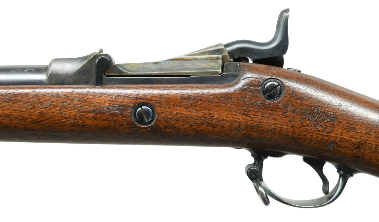 RIFLE. Cal. 45-70. S# 443924. Bbl. 32 5/8". Blade front sight. Buffington rear sight. Very nice example retaining a high degree of original case colors & bluing. Low arch breechblock w/ "US MODEL 1884" markings. Lock has eagle & "US SPRINGFIELD" markings. Walnut stock w/ bottom mounted sling swivels. Ramrod present. Left side of stock has strong 1889 "SWP" inspector's cartouche. Bottom of wrist has strong circled "P" firing proof. CONDITION: stock show some scattered dings & handling marks. Breechblock shows retains 85% original case colors w/ some light oxidation & fading. Upper tang is turning to a dull brown patina. Balance of metal retains 85% original blue w/ some scattered dings, light oxidation & fading. Very good bore. PROVENANCE: From the Lifelong Collection of Glen E. Mattox. (01-22499/MJC). ANTIQUE. $700-900