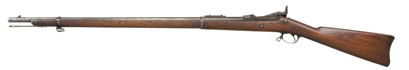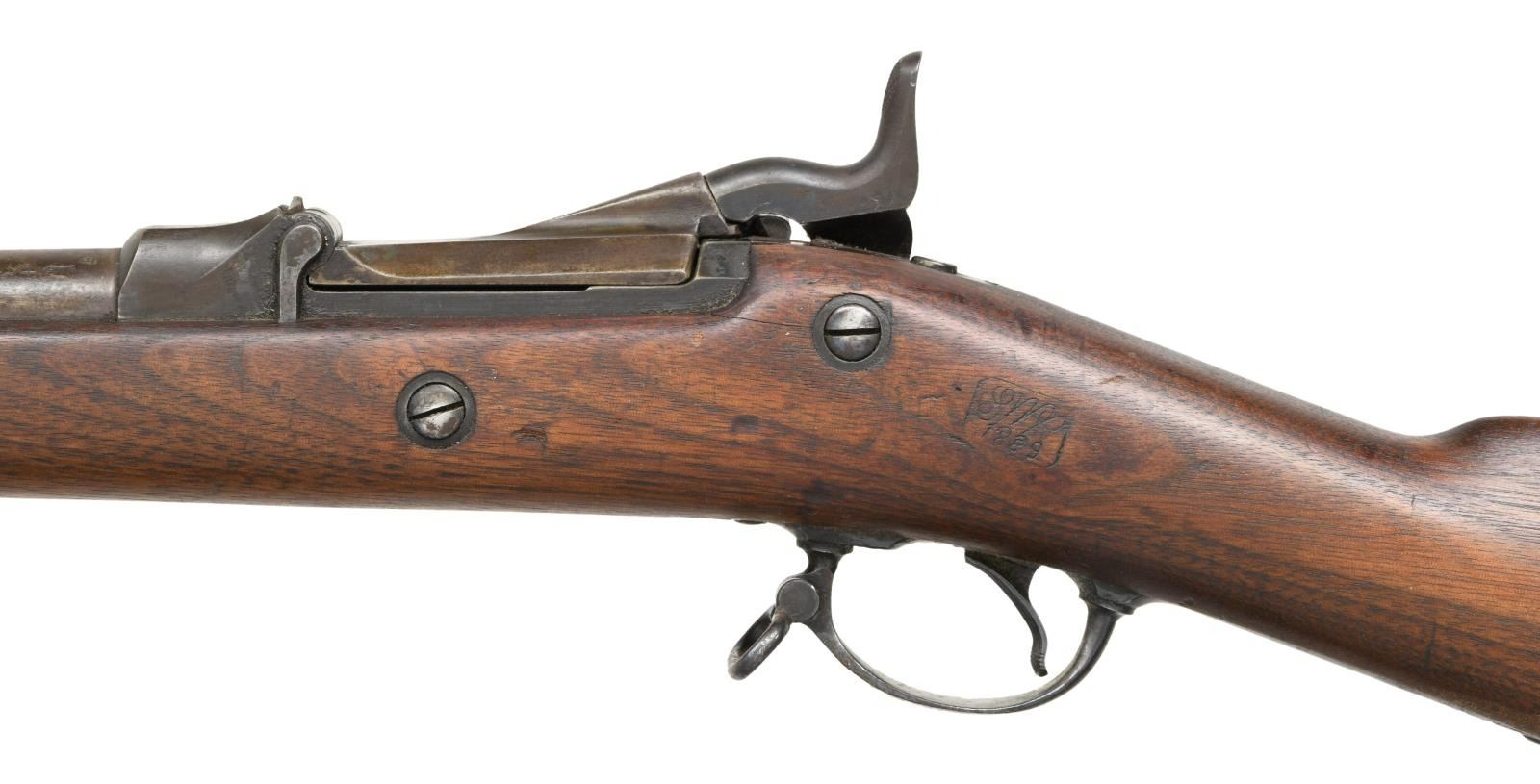 Cal. 45-70. S# 469212. Bbl. 32 5/8". Blade front sight w/ base only for Buffington rear sight. Low arch 1884 dated breechblock. Flat style Springfield lock plate. 2 band walnut stock w/ 1889 dated "SWP" cartouche. Toeline has circle "P" firing proof. Slotted tip ramrod. CONDITION: bbl. & action finish have faded to a mottled gray appearance. Buttplate & trigger guard have some surface rust. Lock plate retains good blue w/ an overcoat of stock finish. Sanded & refinished stock has darkened appearance w/ numerous dents & marks. Dark pitted bore. (01-24038/DS). ANTIQUE. $400-600.