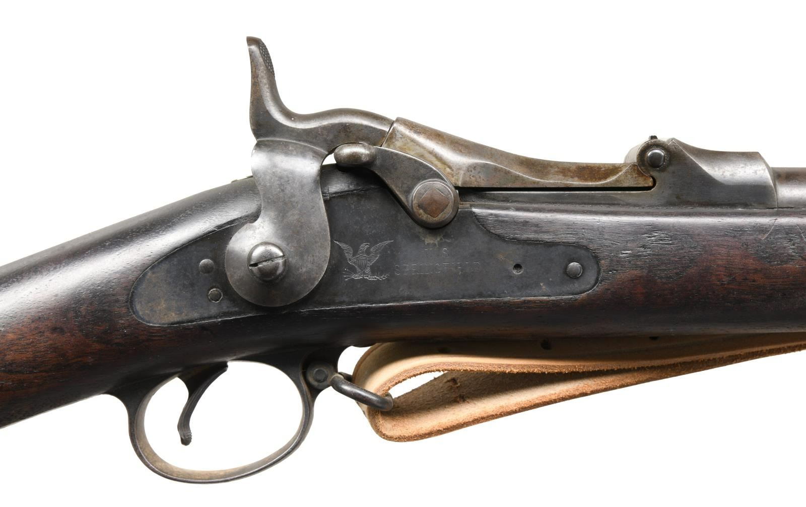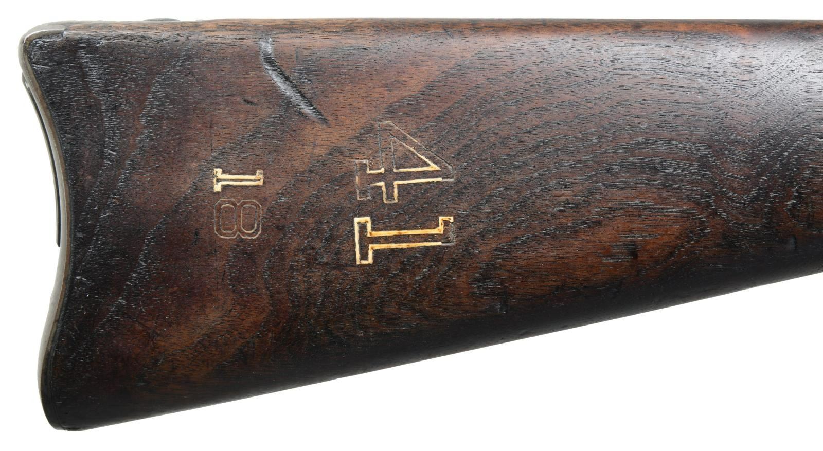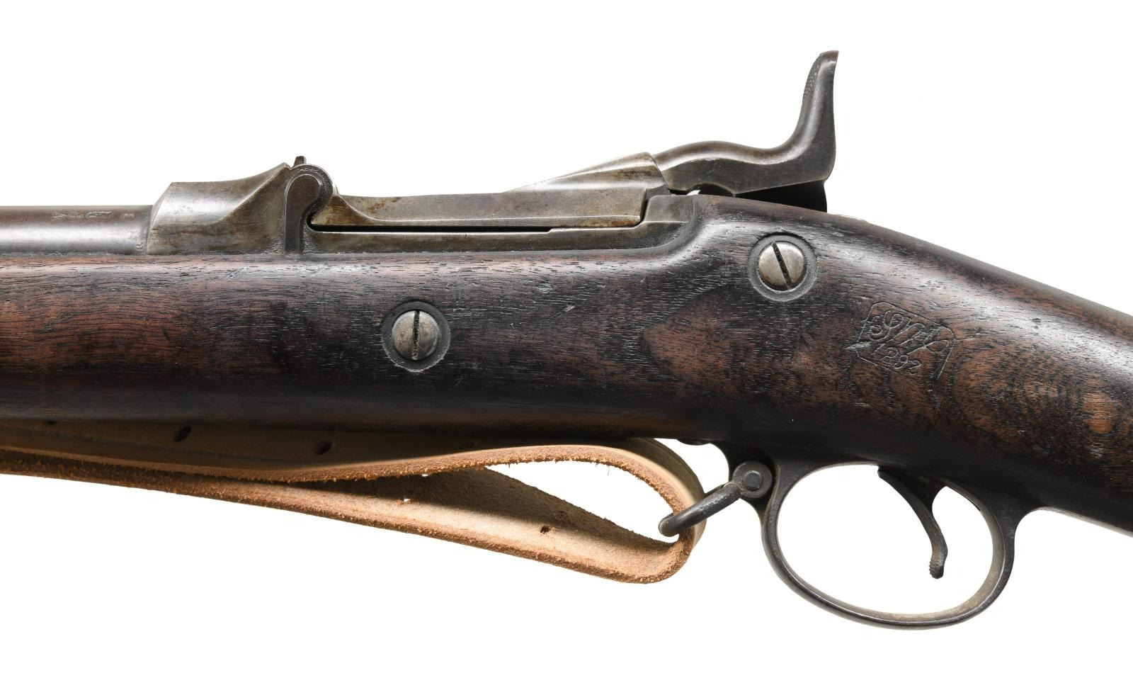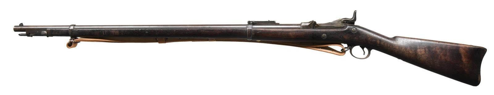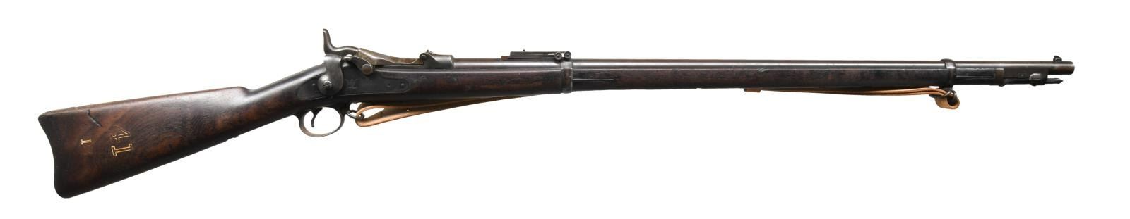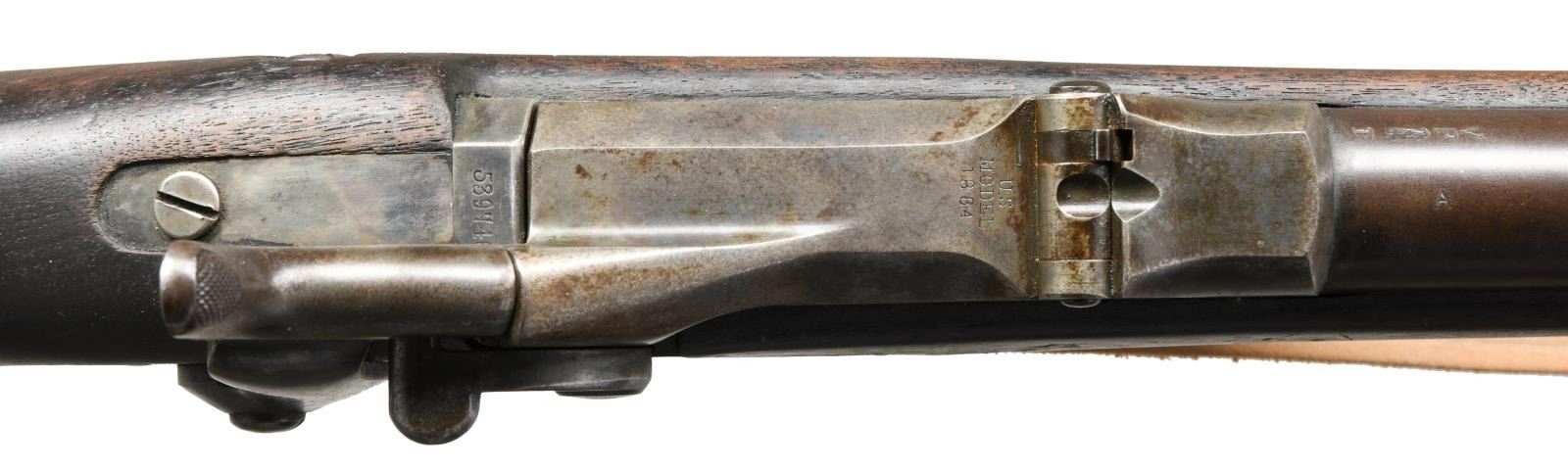 Cal. 45-70. S# 539746. Bbl. 32 5/ 8". Blade front sight. Buffington rear sight. Ramrod bayonet present. Walnut stock w/ bottom mounted sling swivels & repro M1907 style sling. Right side of butt & top of buttplate have "41" & "18" rack numbers. Left side of stock has 1892 dated "SWP" inspectors cartouche. Bottom of wrist has strong circled "P" firing proof. CONDITION: stock has added oil finish w/ some chipping in ramrod channel, scattered dings & handling wear. Metal is mostly a gray patina w/ some scattered oxidation & traces of original finish. Bore shows scattered oxidation & pitting but evident rifling. (01-23565/MJC). ANTIQUE. $700-1000.