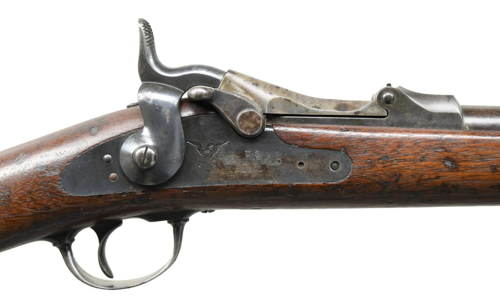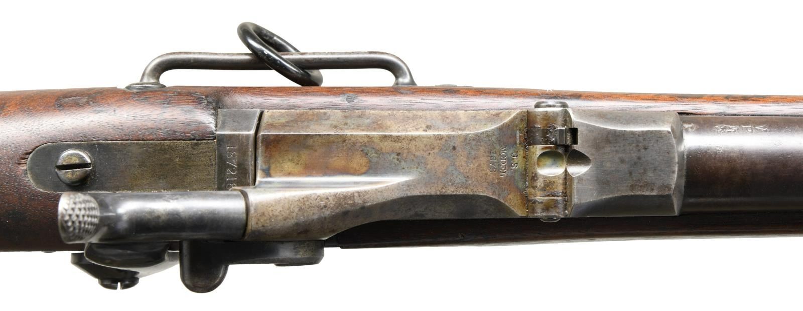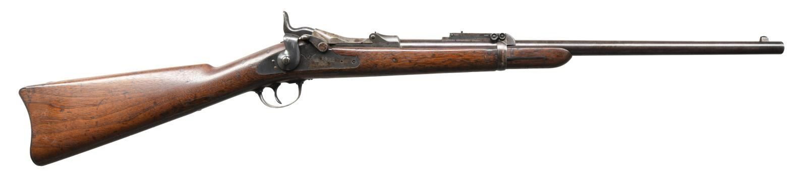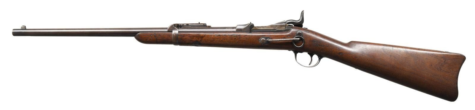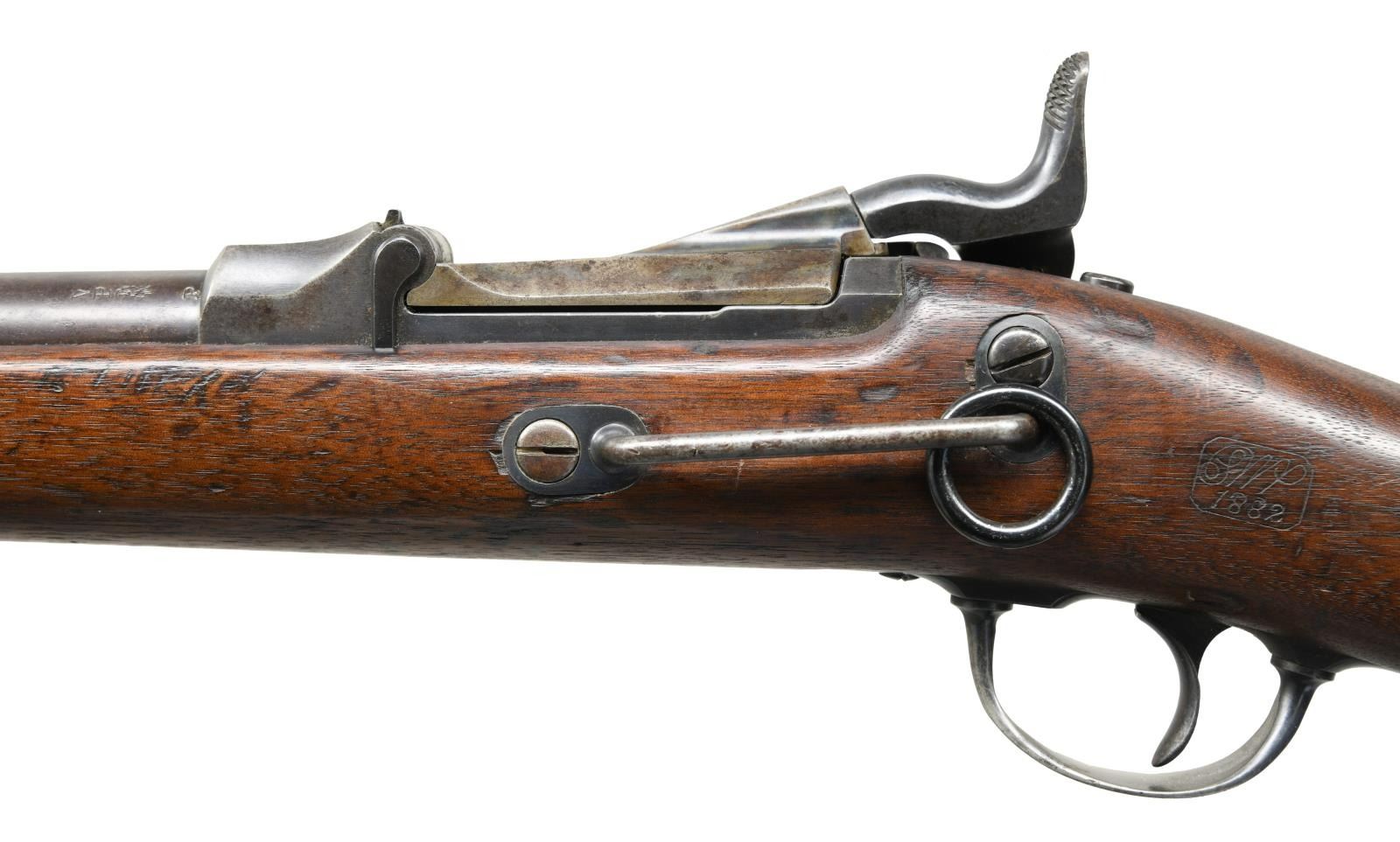 S# 187216. Bbl. 22". blade front sight. Left side of front sight base has pin. "C" marked Buffington rear sight graduated to 1900yds. The 1890 designation is a collector's term for earlier carbines that were arsenal altered w/ the later barrel band. 1873 marked low-arch breechblock. Left side of stock has saddle bar & ring. Rear of bbl. has "VP", eagle & "P" markings. Walnut stock w/ 1890 high hump barrel band. Left side of stock has strong "SWP" 1882 dated acceptance cartouche. Bottom of grip has strong circled "P" firing proof. CONDITION: stock has a large abrasion on left side behind band, stock otherwise shows scattered dings & handling wear. Breechblock retains strong traces of case colors w/ overall fading & some light oxidation. Balance of metal retains about 30% arsenal blue w/ overall fading to gray & scattered light oxidation. Good bright bore w/ scattered oxidation & light pitting but strong rifling. PROVENANCE: From the Lifelong Collection of Glen E. Mattox. (01-22532/MJC). ANTIQUE. $1000-1500.
