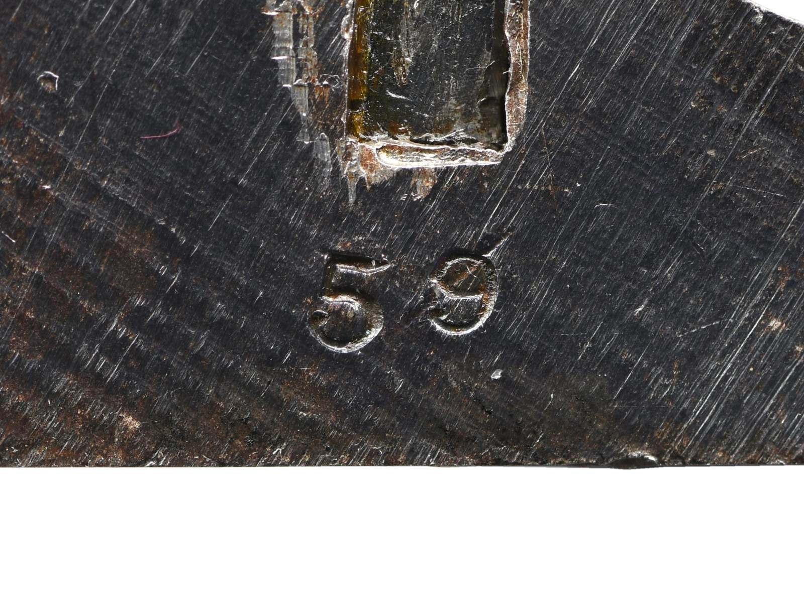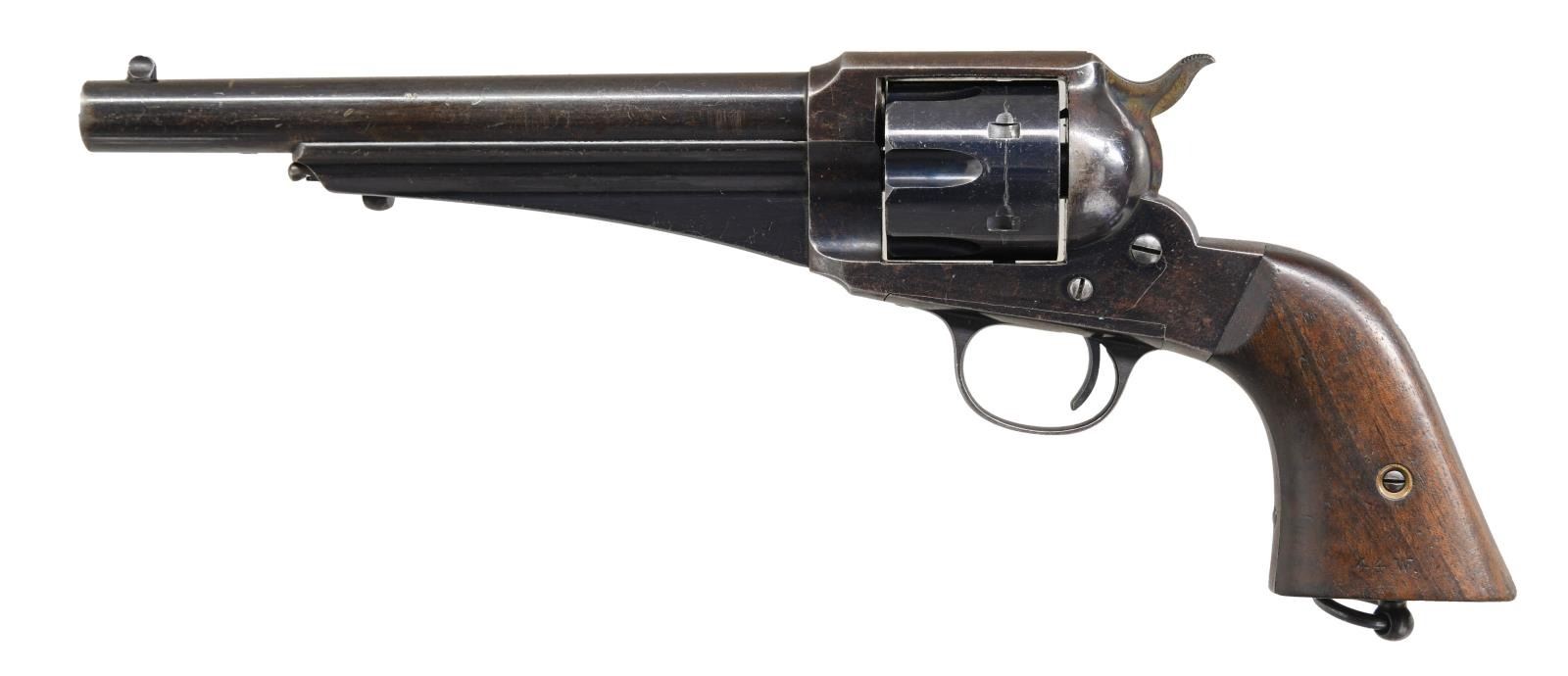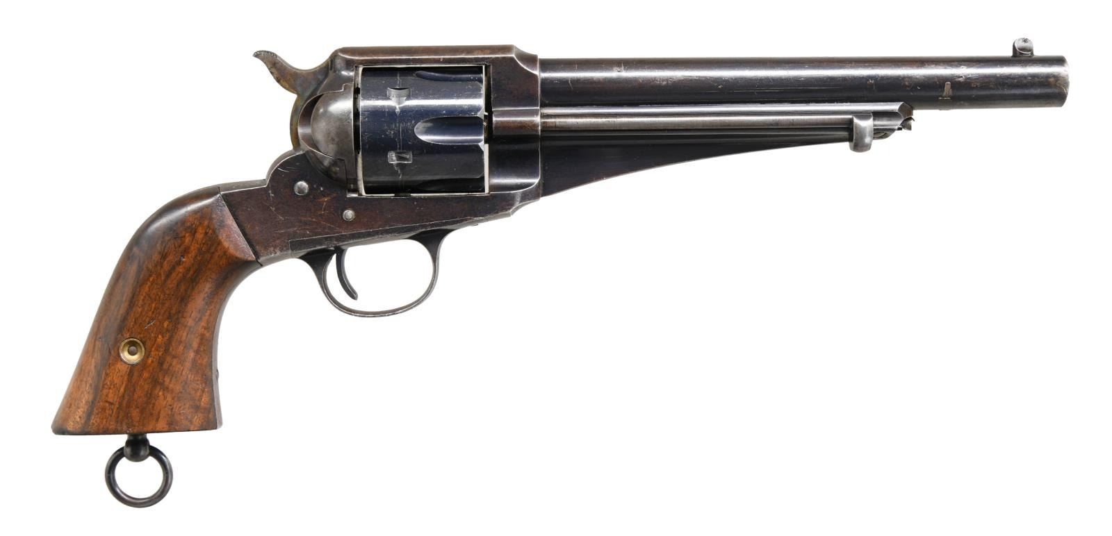Cal. 44-40. S# 59. Bbl. 7 1/2" with webbed ejector housing & pinched screw in front sight. Model 1875 revolvers were manufactured from 1875 to 1889 with an estimated total of 25,000-30,000. The majority of these revolvers were produced with a nickel finish. Blued steel frame, bbl. & six shot fluted cyl. Smooth walnut grip panels. Lanyard ring at butt Top of bbl. marked "E. REMINGTON & SONS. ILION. N.Y. U.S.A." Left side of frame under grips marked "59". Left grip panel marked "44 W". CONDITION: fine overall with metal retaining 60% original blue turning brown with age & scattered scratches, handling marks & areas of peppery oxidation. Hammer retains 60% bright original case colors. Very good grips exhibit a few scattered light dens & impressions. Good bore has strong rifling with light pitting in grooves. Trigger is very light. (01-24256/BH). ANTIQUE. $7,000-10,000.