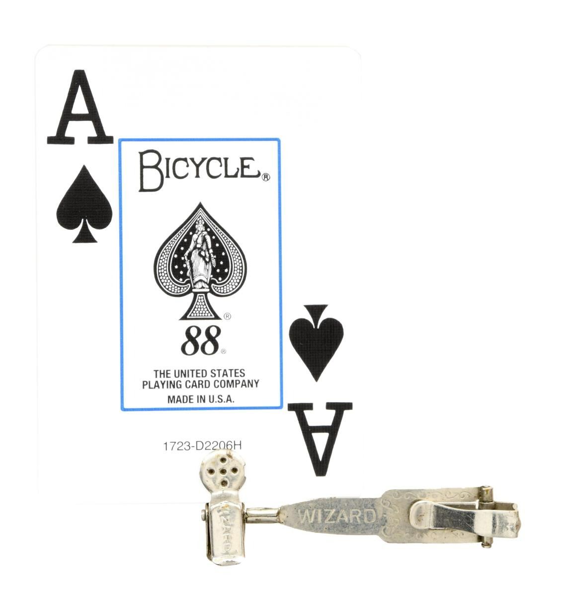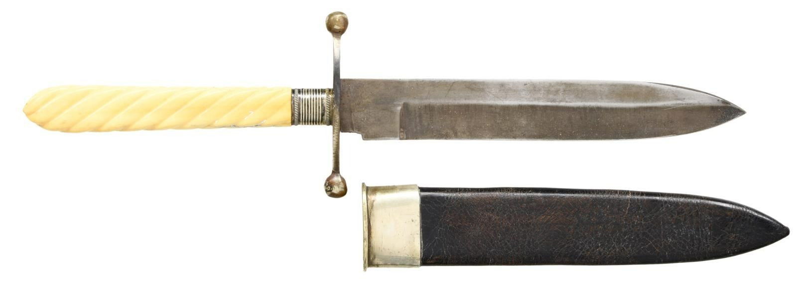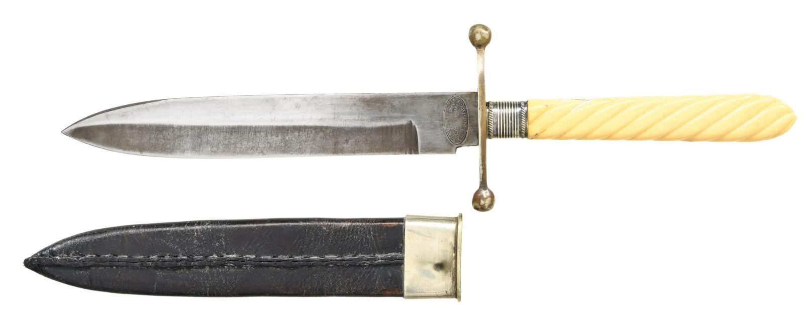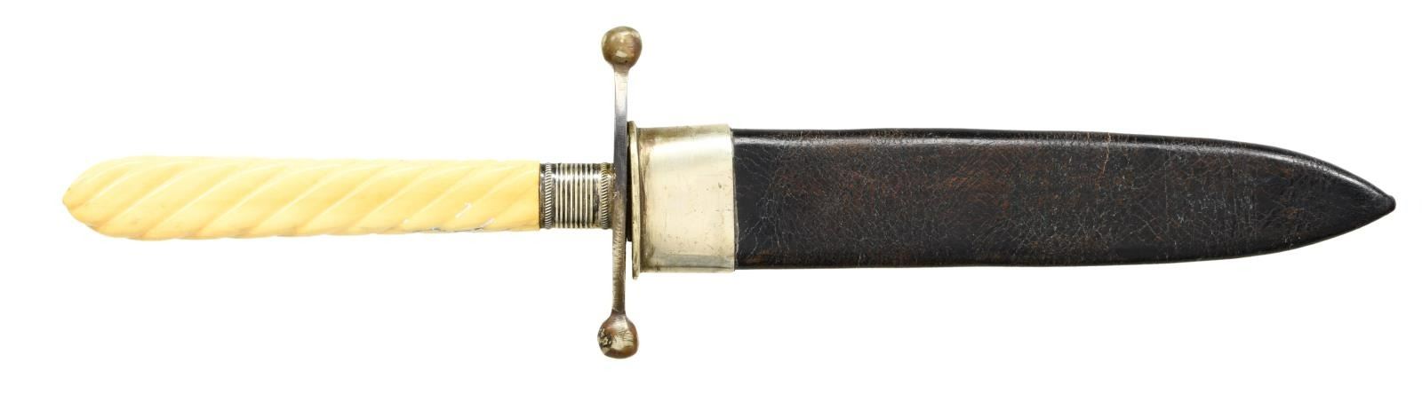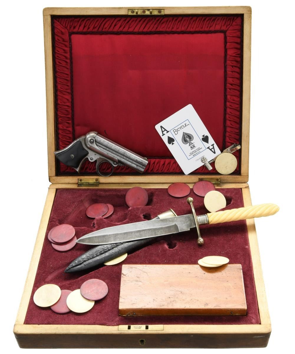 IN GAMBLERS KIT. Cal. 32 RF. S#. 15084. Bbl. 4 shot 3 n3/8" ribbed cluster. Bbls tip forward for loading Ring trigger action. 2 piece hard rubber grips. Mfg. 1863-1868. UNATTACHED ACCESSORIES: Gamblers kit consisting of 10' X 11 3/4" wood box. Fancy veneer lid has a brass presentation plate. Burgandy felt fitted interior with padded red cloth lid lining. Tiffany & Co knife with 6 1/4" hollow ground pointed blade. Nickel finished brass guard has circular quillens, German silver ferrule, twist carved ivory handle & leather scabbard Scarce Wizard "ACE UP THE SLEEVE" card holder. 6" X 2 3/4" accessory box contains 10 red & 7 white poker chips. CONDITION: pistol bbls. retain small amounts of blue in protected areas. Frame has over 50% nickel. Sound action. Bores show scattered pitting. Knife blade has a dull tarnish. Ivory handle has cracks extending from the ferrule. (01-23569/DS). ANTIQUE. $1000-1500
