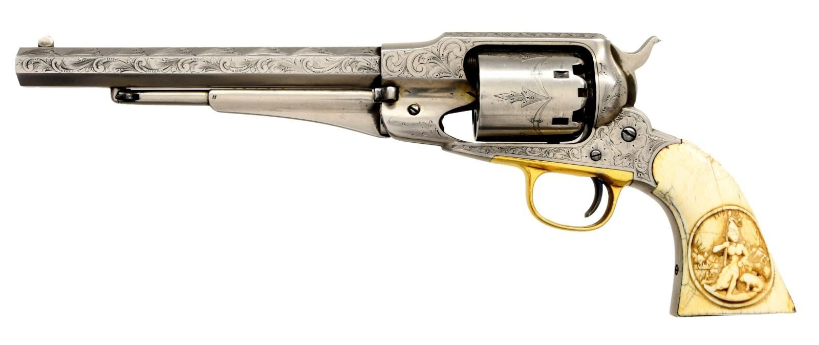 CALIFORNIA STATE SEAL GRIPS. Cal. 44. S# 48924. Bbl. 8" octagon. Round six shot cyl. Frame, cyl. & bbl. have 75% coverage of New York style engraving. Engraving features flowers on the side of the action w/ vine type foliate scroll on other frame & bbl. areas. Cyl. has banner connected floral highlights. Spectacular 2 piece Ivory grips. Left panel has raises carving of the California state seal marked "EUREKA" around the top. Right panel depicts an American eagle w/ shield & flags. Major parts have "C" or "H" inspector initials. The new model army was the second most common revolver used by Union troops during the Civil War. Approx 122,000 were mfg. 1863-1865. CONDITION: gun retains most silver finish showing dark tarnish in protected areas. Brass trigger guard has a bright polish. Grips have an aged & weathered appearance w/ chips & cracks missing around action, backstrap & butt areas. Sound action. Bore retains sound rifling showing scattered pitting. (01-24183/DS). ANTIQUE. $5000-8000.