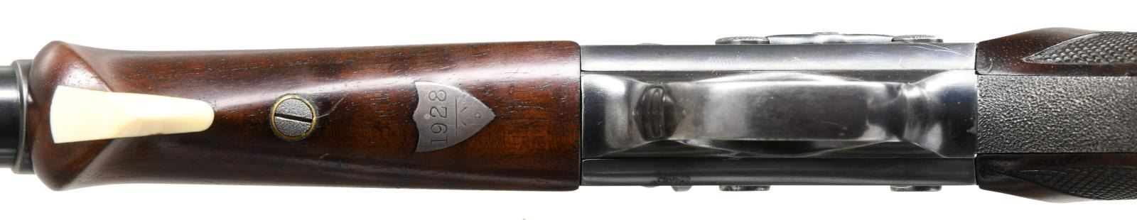 Cal. 22 Short. NSN. Bbl 10". Remington Rolling Block pistol converted from a Model 1867 Rolling Block Pistol, chambered in .22 Short. The left side of the frame is stamped "REMINGTONS ILION N.Y.". Metal components exhibit a lustrous blue finish, with the frame being mounted with a 1 piece checkered wood grip and ivory inlaid schnabel tip forend. Grip features a diamond escutcheon on either side that exhibits an engraved encircled "J", with the underside of the forend exhibiting a small shield escutcheon engraved "1928". 2 stage barrel with a silver band at the breech, featuring a stippled blade front sight and frame mounted adjustable square notch rear sight. Grip straps and rear of breechblock feature stippling. CONDITION: metal components retain bountiful amounts of their period blue finish, exhibiting some mild wear, a couple small scattered spots of mild pitting, as well as some superficial marks from handling. Brilliant mirror bore, exhibiting strong rifling throughout. Wood furniture shows some scattered mild superficial marks form handling and storage, but is otherwise very good overall. PROVENANCE STATEMENT: From the Harold Prucha Collection". (01-23213/MLW). ANTIQUE. $2,000-3,000.