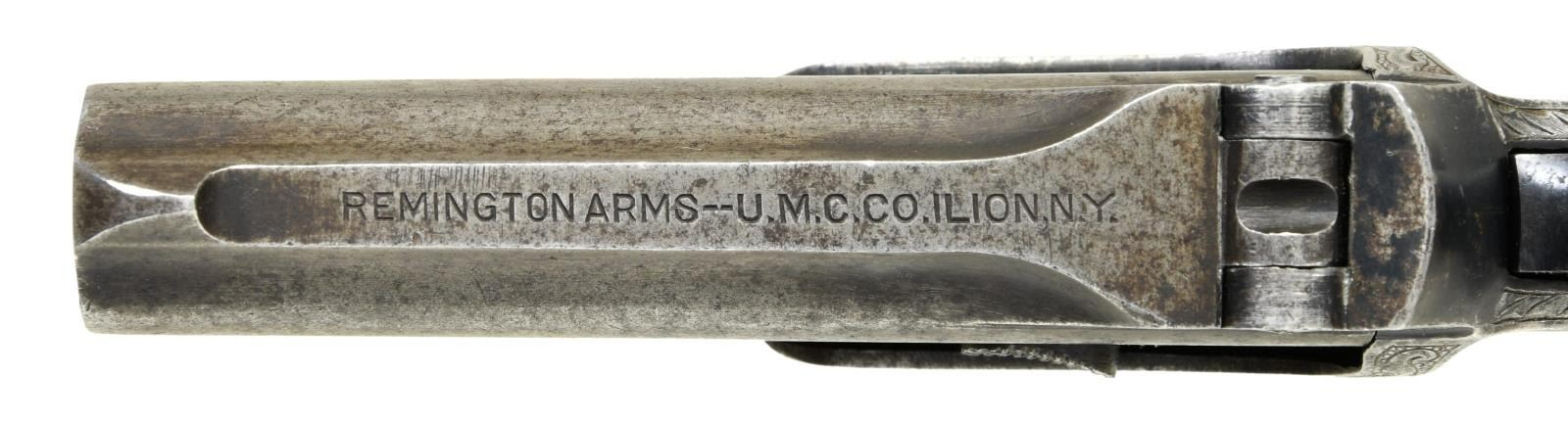 Cal. 41 RF. S# L90549. Bbls. 3". Blade front sight. Fixed rear sight. Late production example w/ UMC marking on top of bbl. Matching numbers on frame & bbl. Most of frame & backstrap have floral engraving. Checkered white hard rubber grips. Fire blue grip screw that is likely a replacement. CONDITION: grips show scattered staining & worn checkering. Bbls. are a dull gray patina w/ scattered oxidation & some fine pitting. Frame is a light gray patina w/ some light oxidation. Good bores w/ some light pitting & oxidation. (23-974/MJC). CURIO. $700-900.
