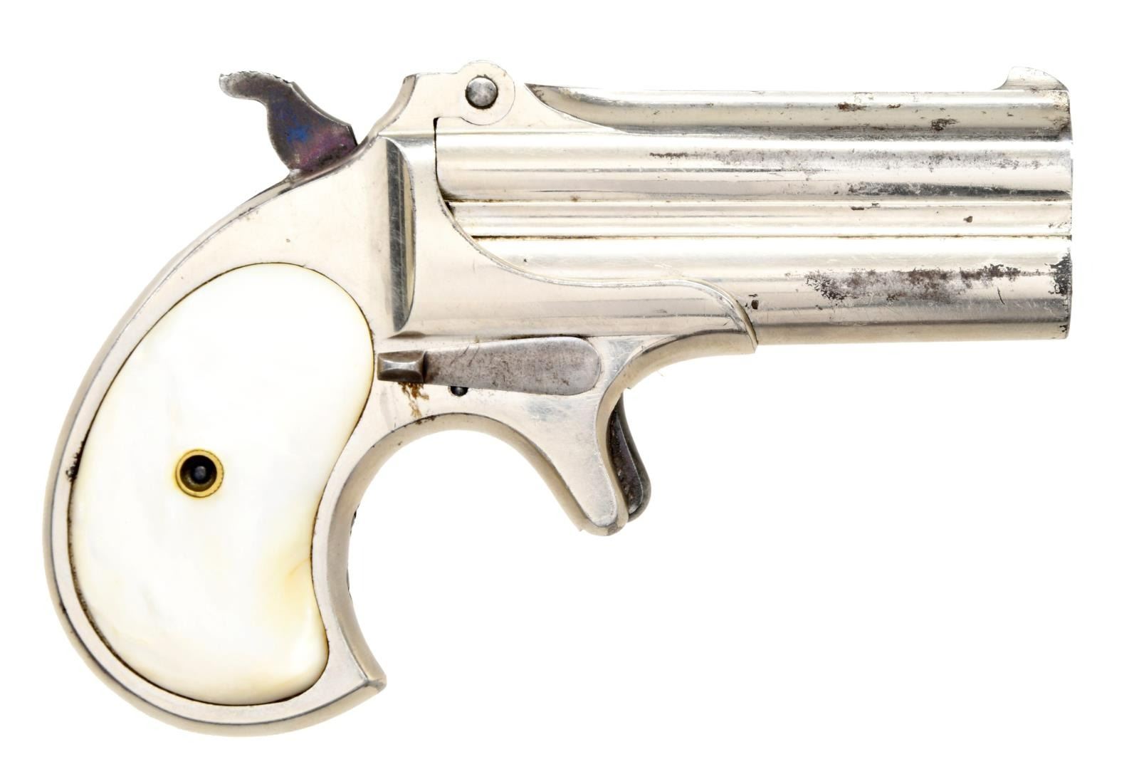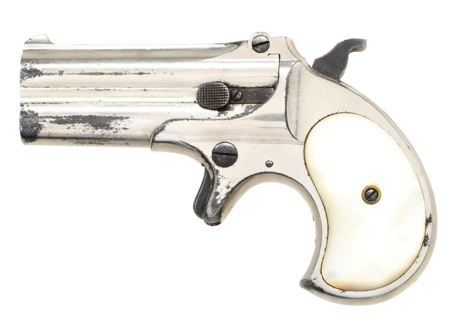Cal. 41 RF. S# 2062. Bbl 3". Model 95 derringer manufactured by Remington. The top of the barrels is stamped "REMINGTON ARMS CO. ILION, N.Y.". "2062" is stamped on the left side of the frame beneath the grip, as well as on the underside of the barrel. Metal components exhibit a nickel plated finish, with the frame being mounted with 2 piece smooth pearl grips. CONDITION: metal components retain the majority of their original factory nickel plated finish, exhibiting some losses and flaking overall. Bright bores, exhibiting scattered pitting and strong rifling throughout. Grips show a few minor marks from handling and storage, but are otherwise good overall. (23-1405/MLW). CURIO. $350-500.
