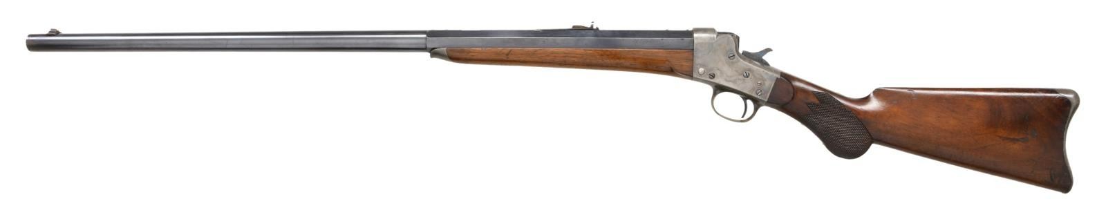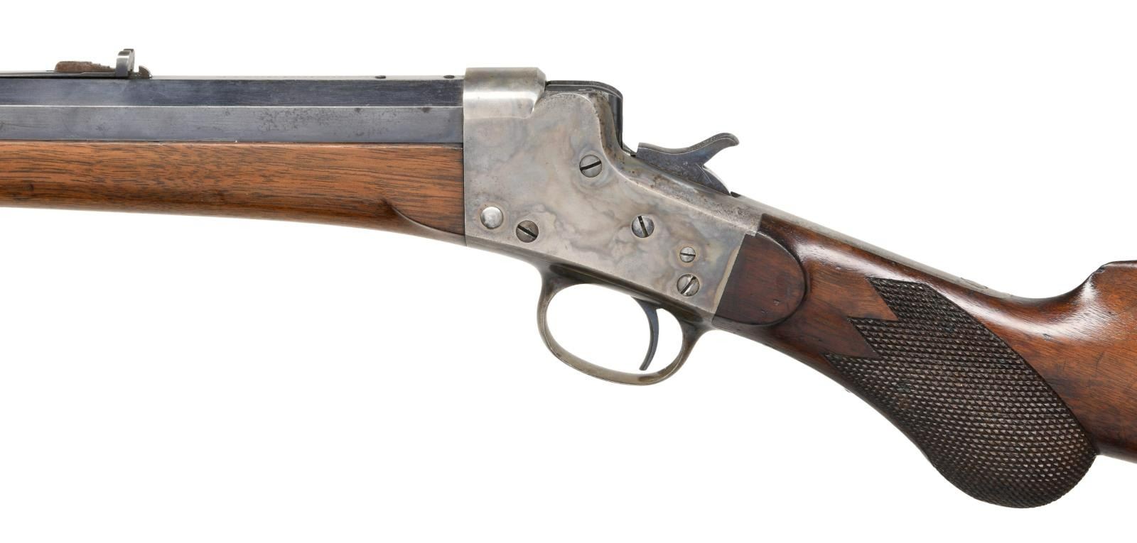 Cal. 40, 1 7/8" case. S# 512. Bbl. 30" octagon to round. Sporting front & rear sight having a replacement elevator. Case colored action. Steel capped forearm w/ round knob walnut stock having a checkered pistol grip & steel crescent buttplate. Estimated quantity of 8,000-10,00 mfg. 1883-1907. CONDITION: 90% bbl. blue showing slight edge wear. Action retains 70% nicely visible case colors. Wood shows numerous scratches, marks & dents. Top bbl. flat has 4 added holes for scope base attachment. Bore has slightly darkened appearance retaining strong rifling. PROVENANCE STATEMENT: From the Harold Prucha Collection". (01-23265/DS). ANTIQUE. $2000-3000.