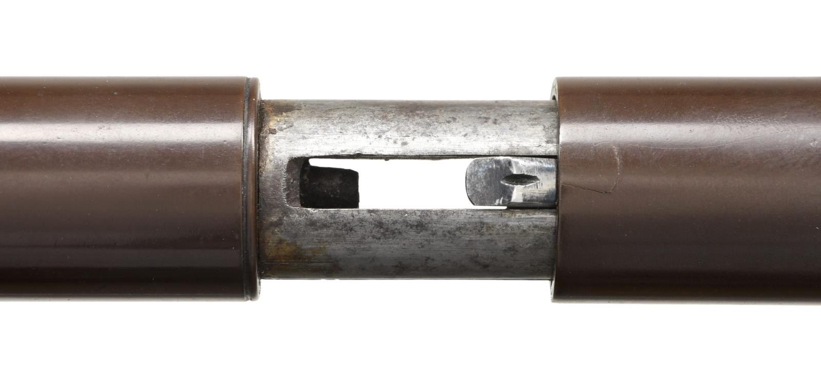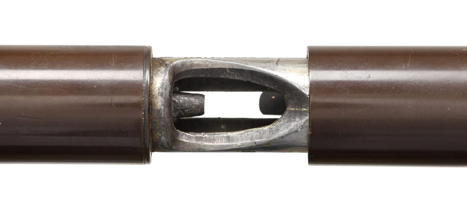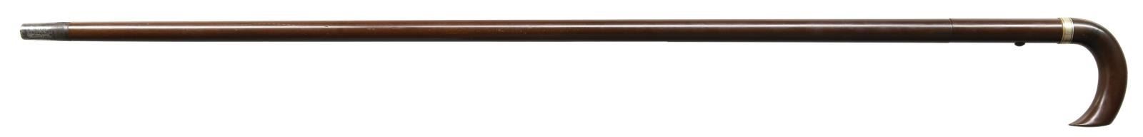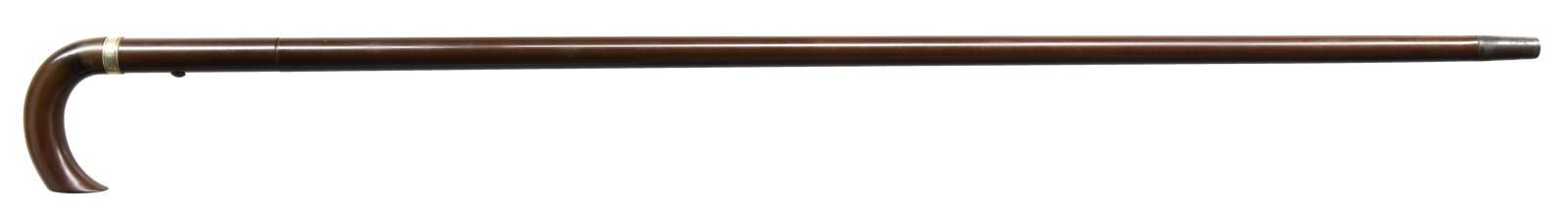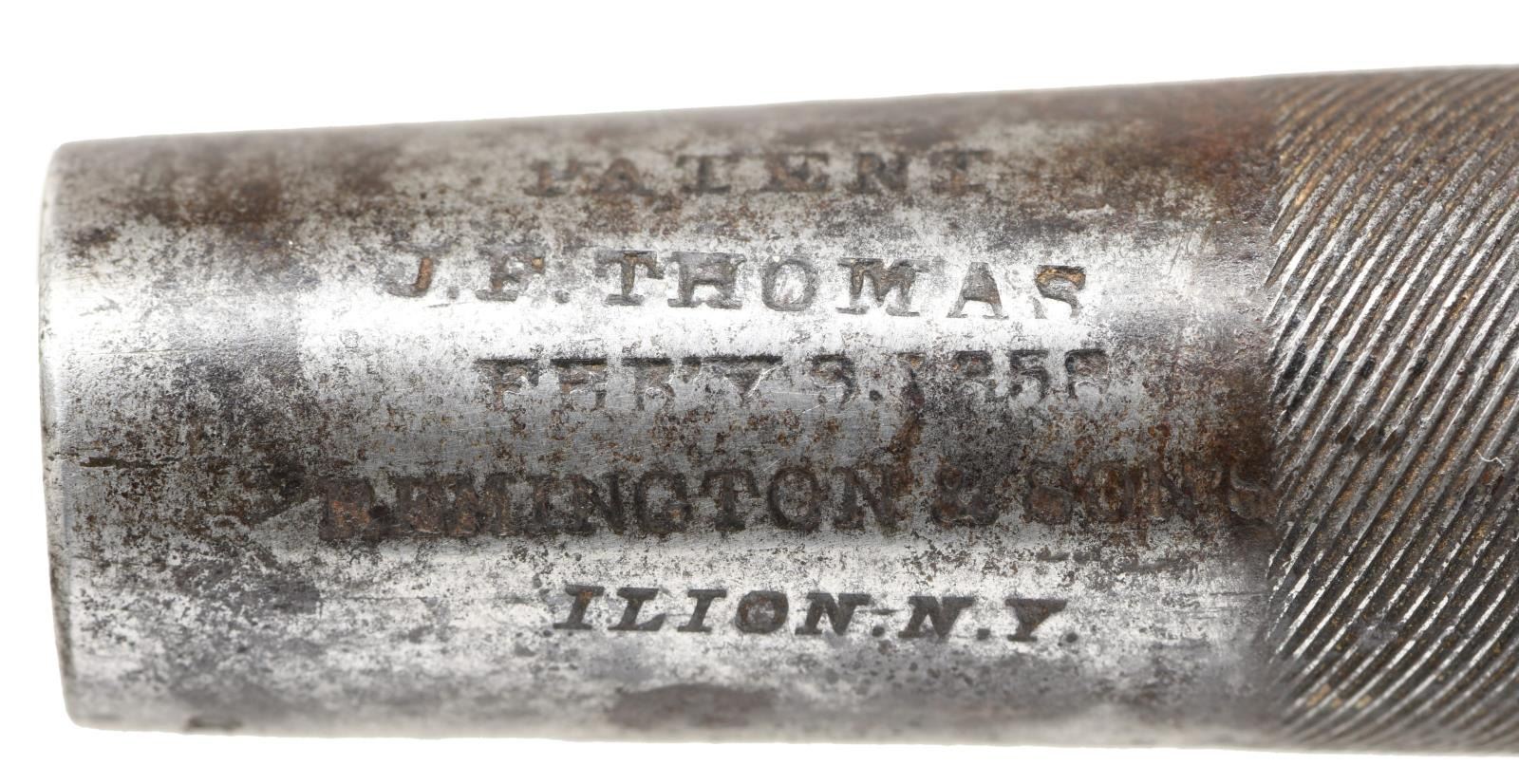 Cal. 31. NSN. Overall length is 36". Gutta percha shaft & curved handle. Iron tip is marked "PATENT / J.P. THOMAS / FEBR 9, 1858 / REMINGTON & SONS / ILION, N.Y.". Mechanism is accessed by pulling back on handle. Estimated quantity of under 500, mfg 1858-1866. CONDITION: very fine showing minor handling marks. Iron tip has fading blue showing spots of corrosion. Action opens smoothly, cocks and fires. PROVENANCE: Marshall "Brook" Davis Collection. (01-23535/DS). ANTIQUE. $3500-5000.