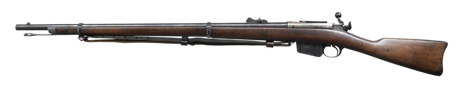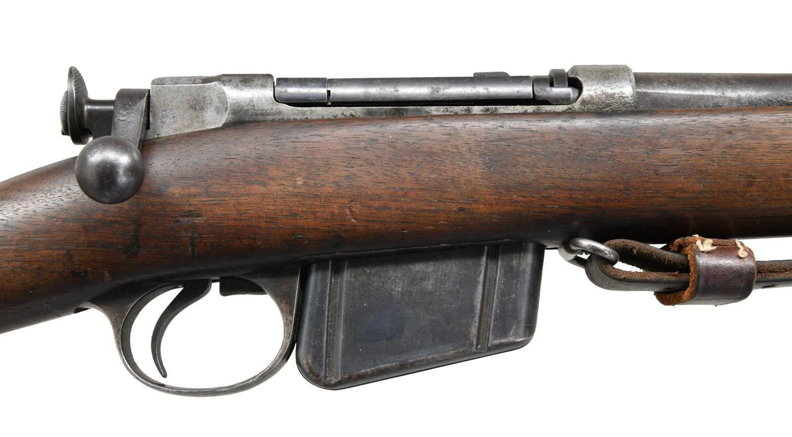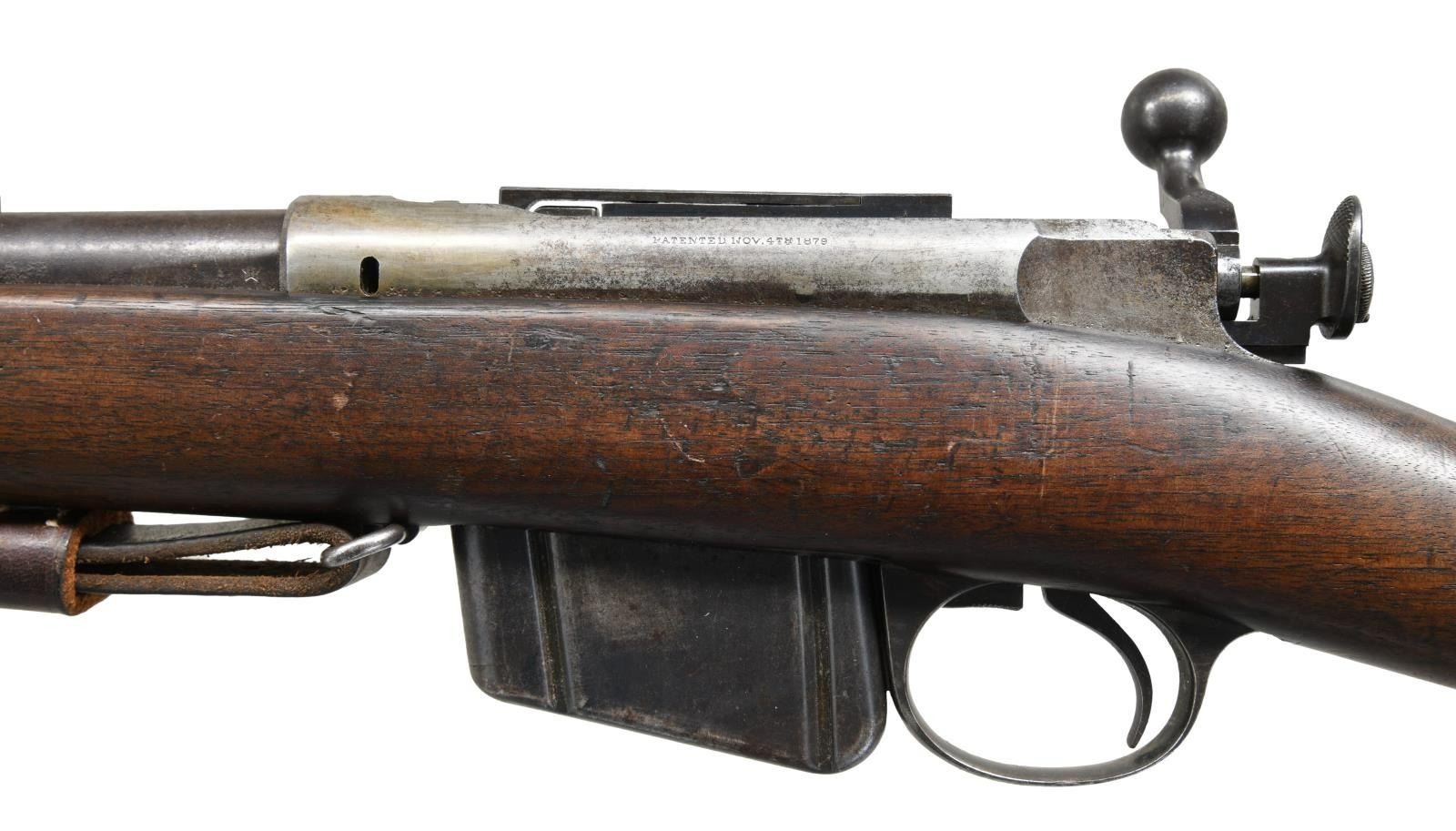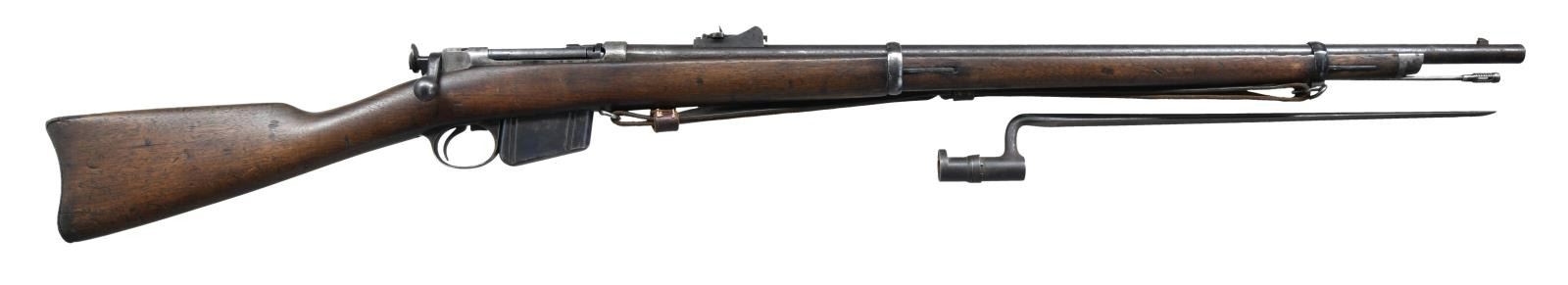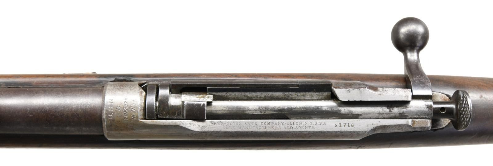 RIFLE WITH BAYONET. Cal. 45-70. S# 51716. Bbl 32 1/2". Model 1885 Remington-Lee bolt action rifle. Receiver is stamped "U.S.N./ (ANCHOR)/ NO 2738/ W.K.K." over the chamber, with " REMINGTON ARMS COMPANY, ILION, N.Y. U.S.A./ SOLE MANUFACTURERS AND AGENTS." followed by the serial number, over the top of the receiver wall. Buttstock is stamped with what appears to read "1227" at the rear of the comb. In the white cleaning rod with military brown leather sling. UNATTACHED ACCESSORIES: U.S. marked socket bayonet. CONDITION: receiver has been cleaned, exhibiting a gray patina with pitting and areas of dark discoloration. Barrel exhibits dark surface oxidation overall. Bright bore, exhibiting scattered areas of pitting and strong rifling throughout. Stock shows scattered marks and impressions from storage and handling, with a couple minor losses. Bayonet exhibits oxidation overall. (01-23727/MLW). ANTIQUE. $1,000-1,500.