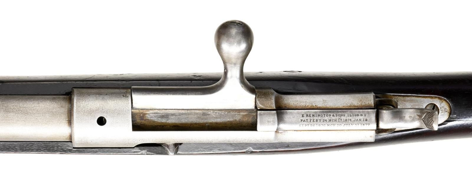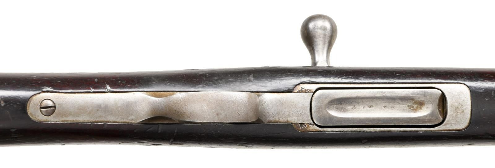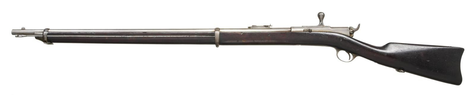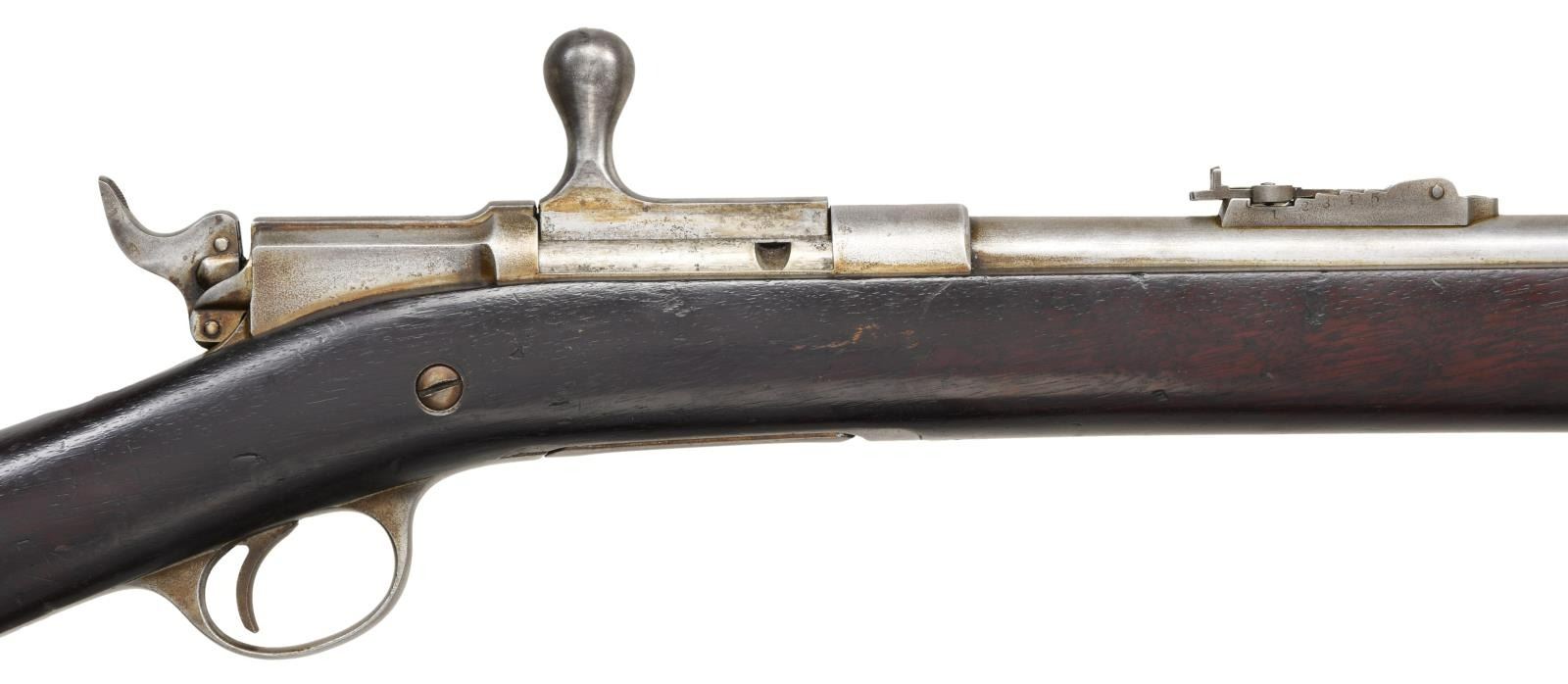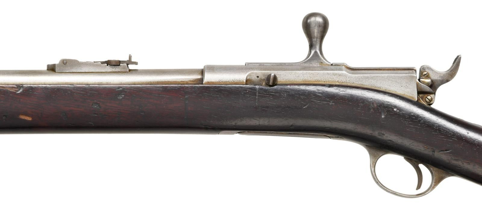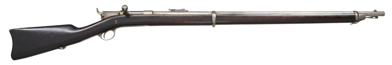 CAL. 45-70. S# NSN. Bbl. 32 1/2" Full stock with 2 bands. Scarce variation with the US Army only using a few examples in the 1881 trails and made no further purchases. This example carries no additional markings other than a faint 45-70 on the action, the standard bolt markings, & an "R" on the stock just forward of the rear sling swivel. CONDITION: Metal surfaces have been cleaned over fine pinprick pitting. Stock has scattered handling marks with some heavy dings present. Very good bore with good rifling. (01-23172/ZAL) ANTIQUE $2500-4000