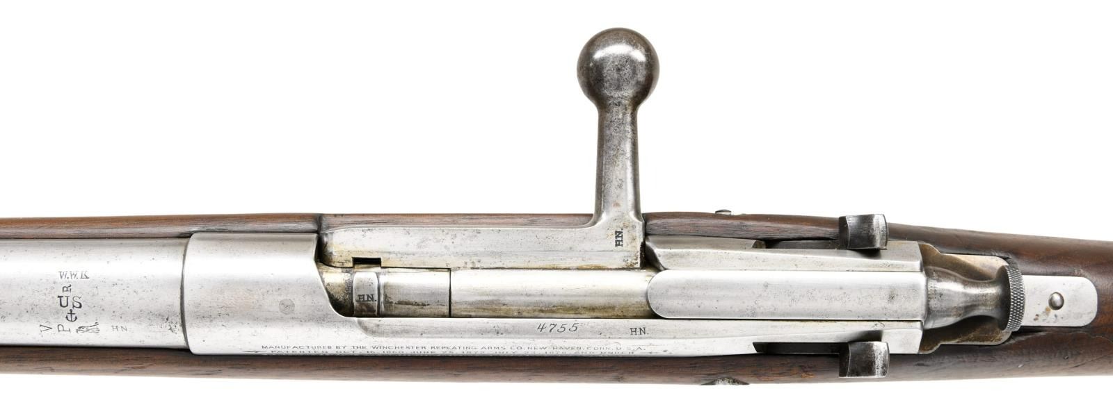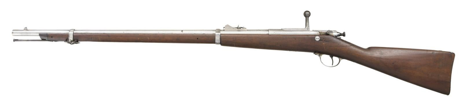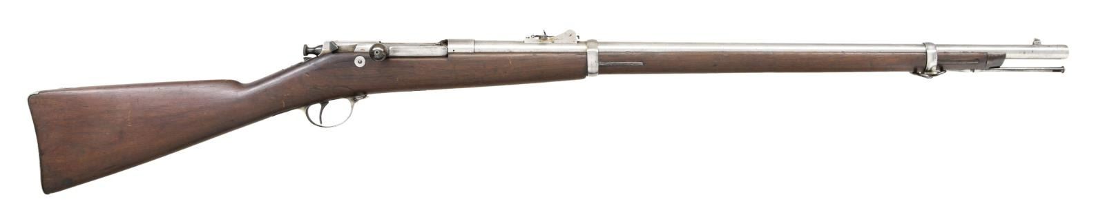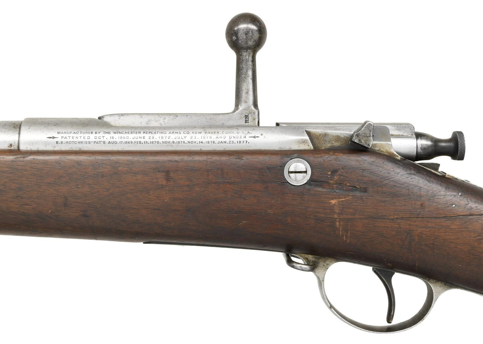 RIFLE. Cal. 45-70. S# 4755. Bbl 28 3/4". Blade front sight. Ladder rear sight graduated to 1300yds. Rear of bbl. has "W.K.K." inspector's stamp, "VP" proof & US Navy anchor marking. Left side of receiver has Winchester markings. Walnut stock w/ bottom mounted sling swivels & faint inspector's cartouche on left side of butt. Replacement ramrod present. CONDITION: sanded stock has a repaired 4" crack on left side of wrist, a few other cracks, scattered dings & handling wear. Metal has been cleaned to bright w/ scattered oxidation & light pitting. Very good bore w/ a few spots of pitting but strong rifling. (01-23733/MJC). ANTIQUE. $800-1200.