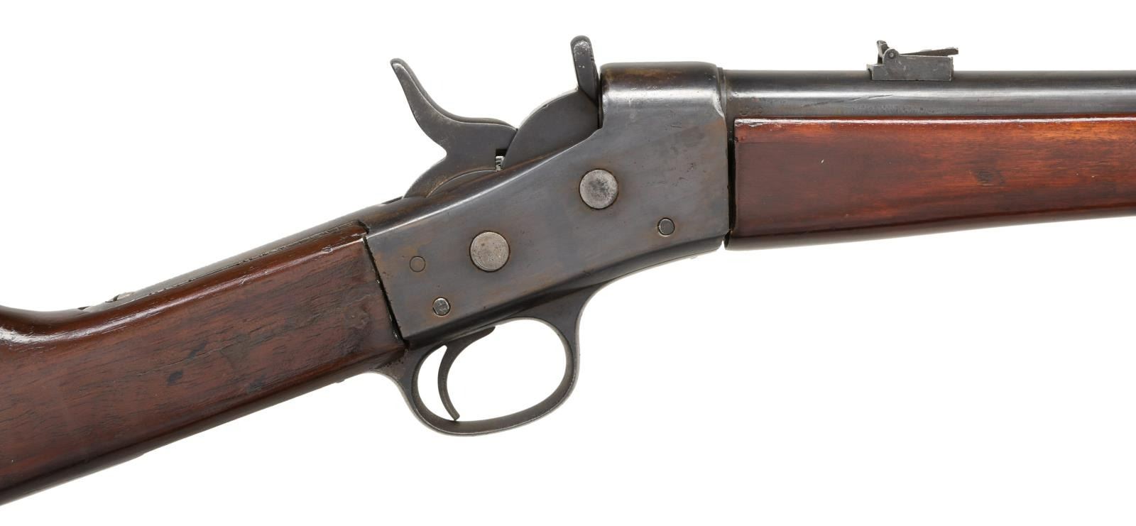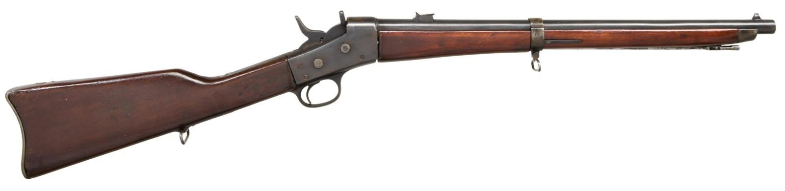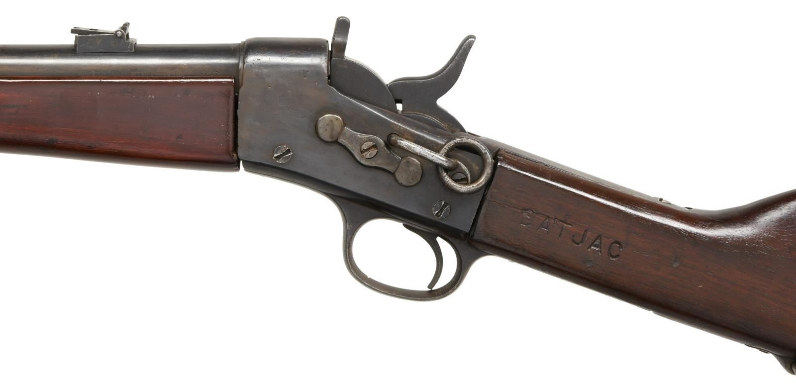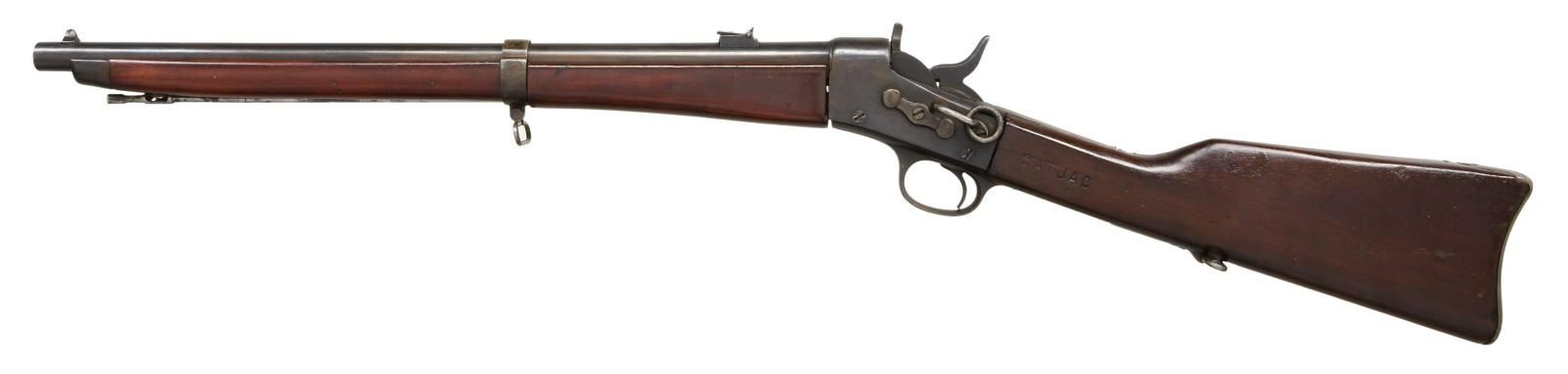 BLOCK SRC. Cal. 43 Spanish. NSN. Bbl. 20 1/2". No. 1 action Rolling Block in saddle ring carbine configuration. Blade front sight. Flip up rear sight. Bbl. marked "R" at top rear & two crosses at right rear. Walnut stock set w/ bottom mounted sling swivels. Replacement cleaning rod. Left side of butt marked "BATJAC" denoting that this Rolling Block was owned by John Wayne's movie production company. Modified Rolling Block rifles were used in the film "The Alamo" by the extras playing the Mexican army & modified to resemble period flintlock muskets. UNATTACHED ACCESSORIES: printed copies of two other Rolling Blocks marked to John Wayne's production company. CONDITION: walnut stock set has a loose fit w/ added finish, a few cracks, scattered dings & handling wear. Metal has a fading reblue finish w/ scattered pitting, light scratches & handling wear. Fair bore w/ scattered pitting & worn rifling. (01-24111/MJC). ANTIQUE. $1,000-1,500.