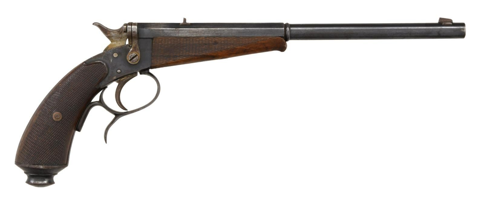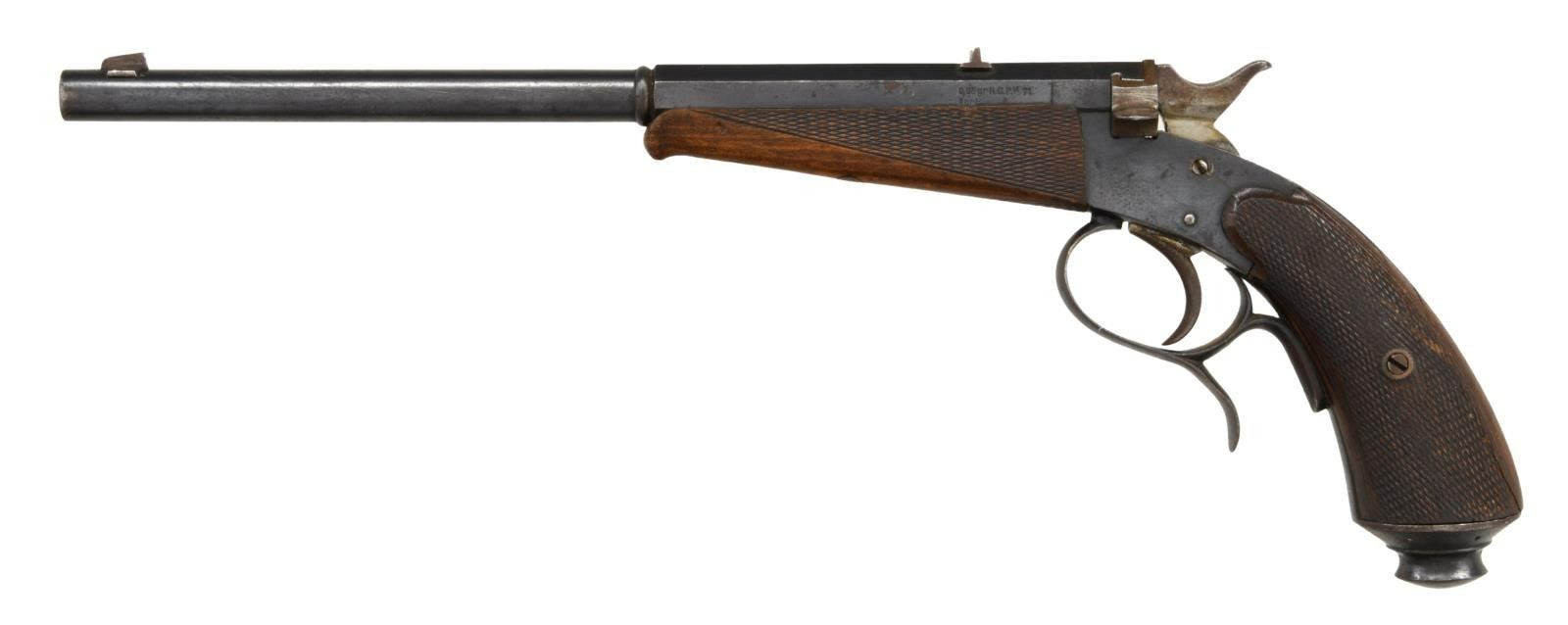 GASSER. Cal. 22 RF. BB Cap. S# NSN. The 10" octagon to round barrel with "V" notch rear and post front sights has maker's name on top flat along with "VIEN" (Vienna). Flip-over Flobert type locking lug is at rear. Blued action has finger spur on trigger guard. Checkered walnut stocks. CONDITION: fine. Metal retaining most of its original blue with scattered freckling. Wood with original finish has many light marks. Bore appears to be very good but quite dirty. Mechanically good. (23-4730/MGM). C&R. $300-600.