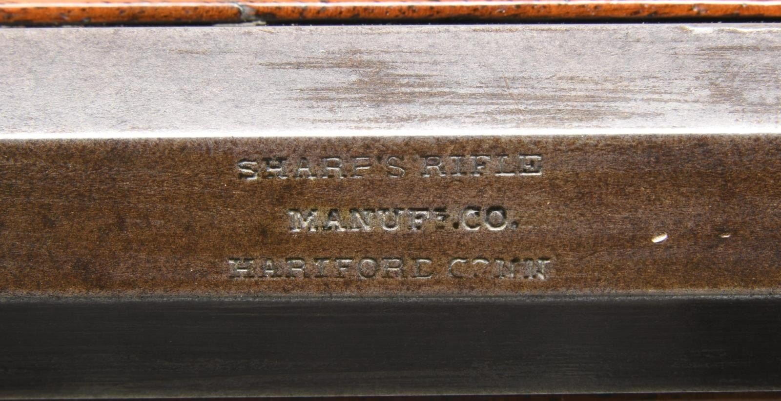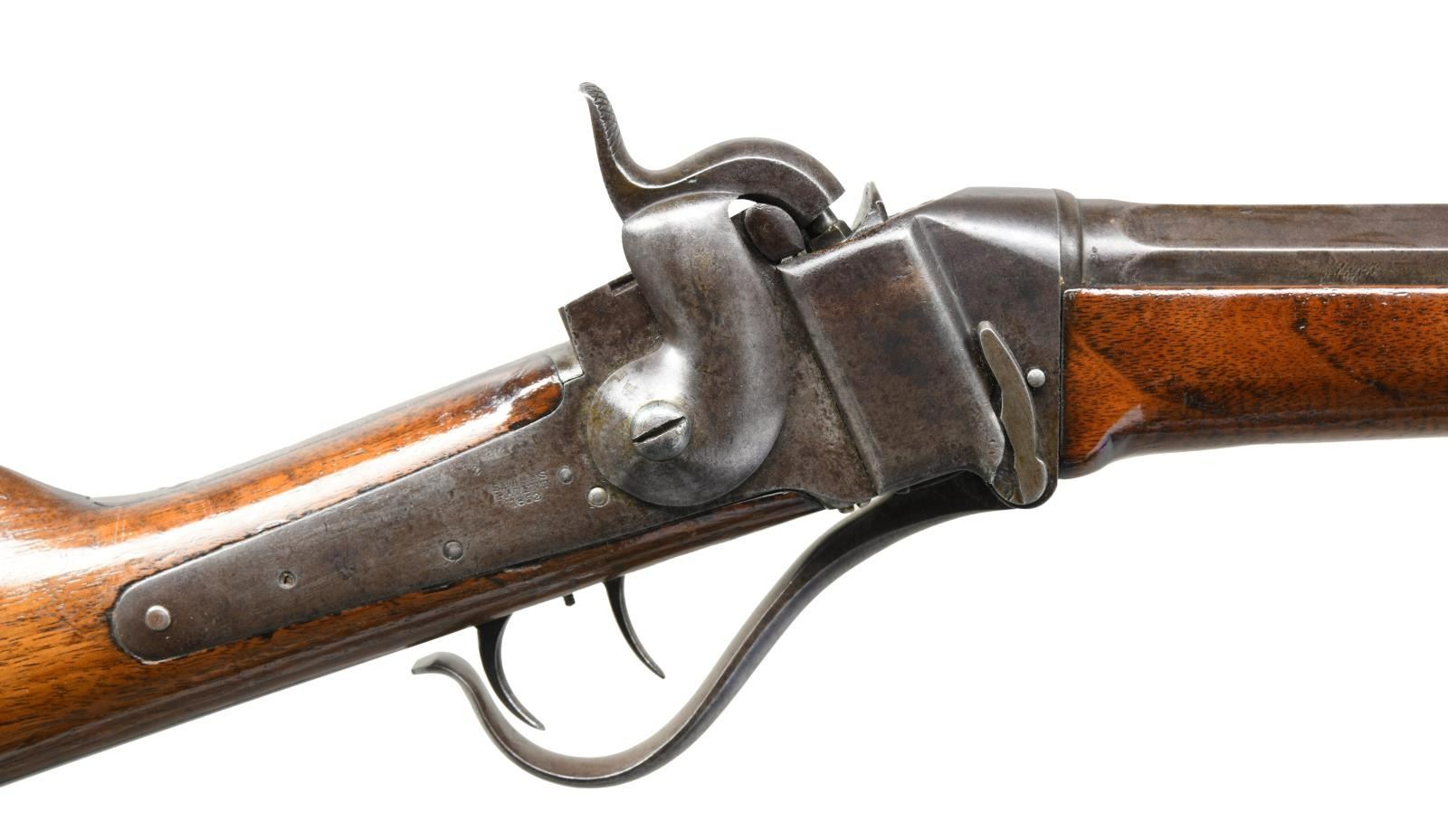 Cal. 44. S# 9525. Bbl. 26'' heavy octagon measuring 1'' across flats at muzzle. Top flat has 3 line Hartford address. Dovetail mounted front sight w/ replacement bone blade. Lawrence patent graduated leaf rear sight. Slant breech percussion action. 1852 dated lock has pellet primer feed attached. Left side of action has 3 line patent marking w/ 1848 date. Double set triggers. Pewter tipped walnut forearm & straight grip stock w/ steel carbine buttplate. Right side has rectangular lid iron patchbox. WEIGHT: 9 lbs, 3.2 ozs. Total of 2,970 model 1853 sporting rifles were mfg. July 1854 to Dec 1859. UNATTACHED ACCESSORIES: spare latch plate found in patchbox. CONDITION: good. Metal has faded to a smooth brown patina showing small dents & spots of light pitting. Stocks have added finish over wear & handling marks. Action & triggers are sound. Bore is generally bright retaining strong rifling. PROVENANCE: From the Lifelong Collection of Glen E. Mattox. (01-22525/DS). ANTIQUE. $2,500-4,000.