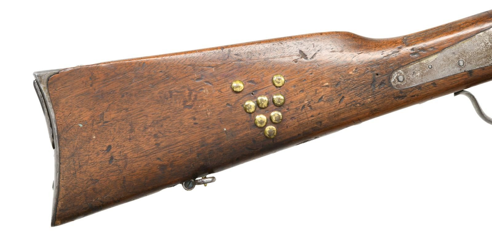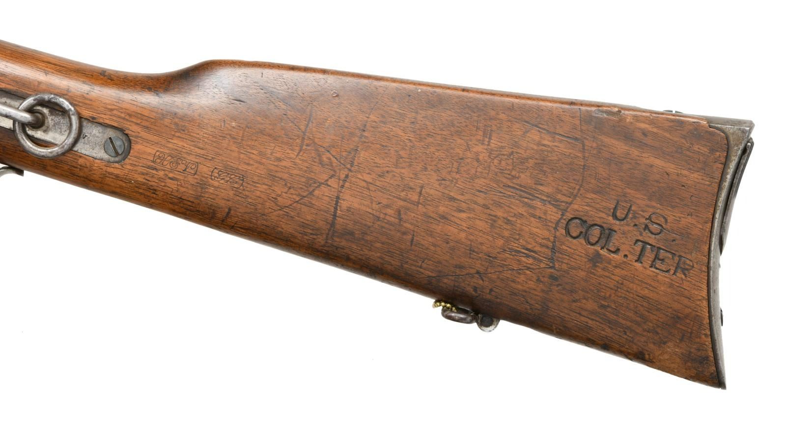 SRC. Cal. 56-50. SN. 9689. Bbl. 20" with blade front & leaf rear sight. Case colored action is fitted with the Stabler cutoff & has a saddle ring & bar on the left side. 7 round tubular mag inserts thru the buttplate. Band fastened forend & straight grip walnut stock. Left side of stock has 2 clear cartouches with hand carved initials "WBC" found below the saddle ring bar. Deeply stamped marking "U.S. / COL. TER" is located near the buttplate. Right side of the stock of this Indian Wars era carbine has 8 brass tacks in the shape of a "V". CONDITION: The right side of the action shows traces of case colors with the balance of the metal largely fading to gray .Wood shows heavy wear with deep dents, & marks. Right side of forend has 2 tack holes that appear to be from a tag that has been removed. The bore retains good rifles with spots of deep pitting. PROVENANCE: From the Collection of James B. Taylor. (01-23874/DS). ANTIQUE. $3000-5000.