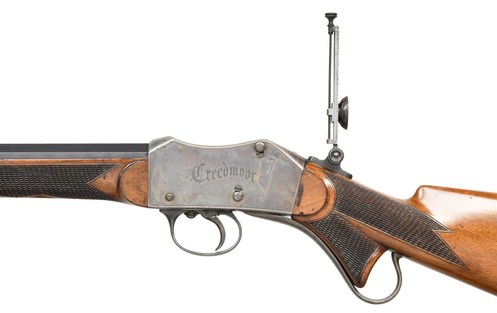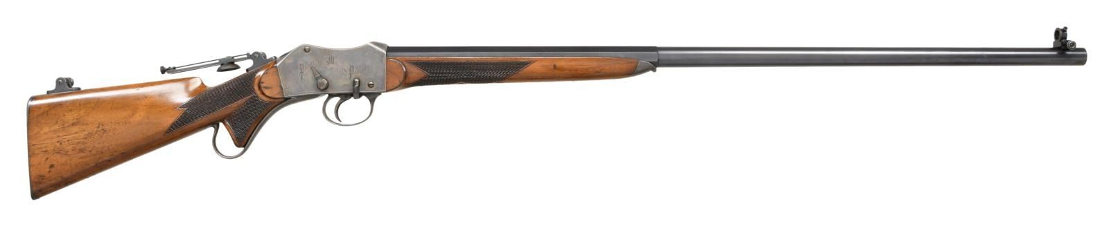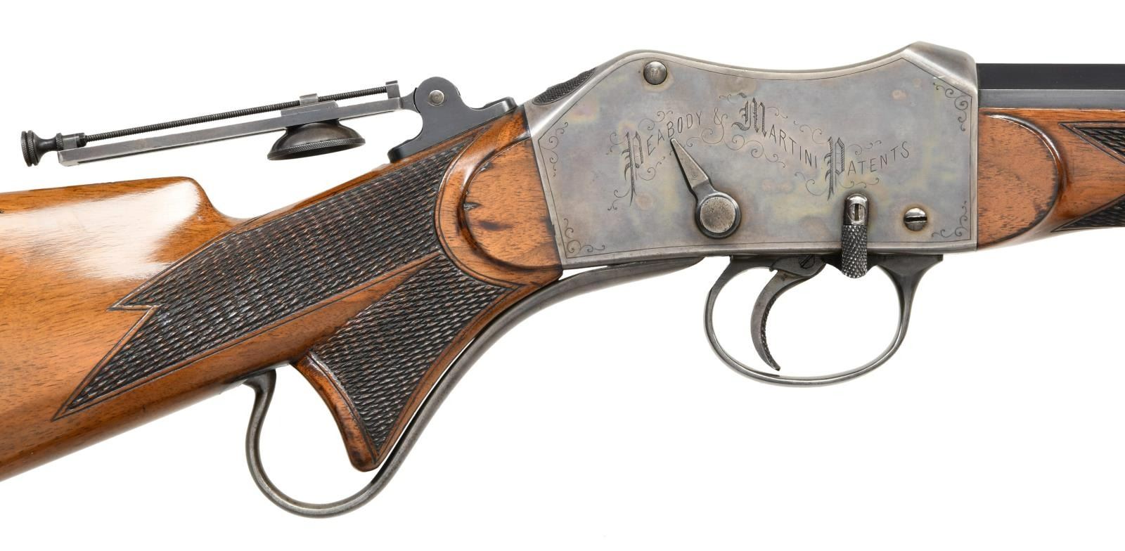 RIFLE. Cal. 44-100. S# 335. Bbl. 32" octagon to round. Wind-Gauge front sight. Long range Vernier tang sight is numbered to the rifle w/ second mounting base at heel of stock. Case colored Martini style action w/ straight line borders & highlights of scroll engraving. Left side is engraved "Creedmoor". Right side is engraved "Peabody-Martini / Patents". Trigger is checkered. Steel tipped walnut forearm & pistol grip stock have hand checkering. LOP: 14 1/8" steel shotgun buttplate. WEIGHT: 10 lbs, 2.8 ozs. Estimated quantity of a few thousand of all types mfg. by Providence Tool Co., 1860s-1880s. CONDITION: very fine. Bbl. retains over 95% blue showing light edge wear. Action has over 90% lightly faded case colors. Wood has good finish & checkering showing numerous marks & small dents. Bore has slightly darkened appearance retaining strong rifling. PROVENANCE STATEMENT: From the Harold Prucha Collection". (01-23259/DS). ANTIQUE. $4000-6000.