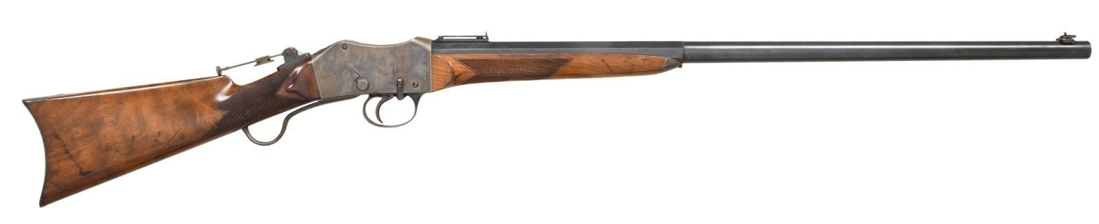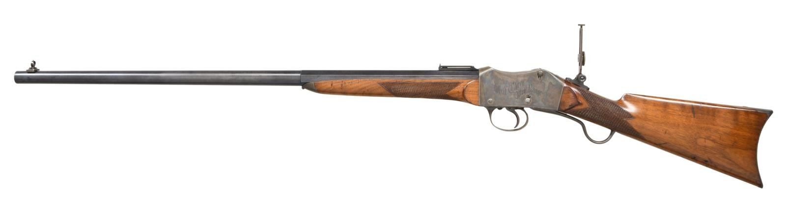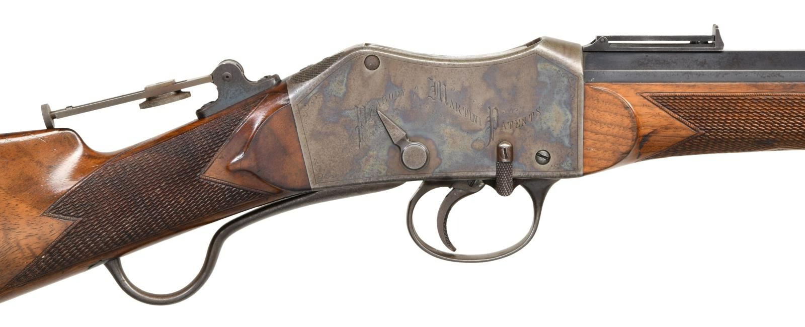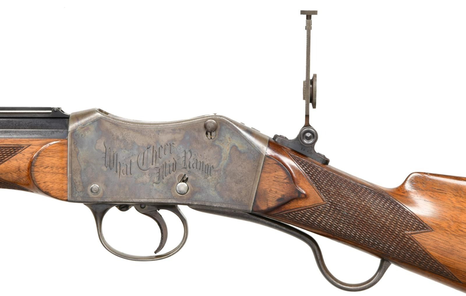 Cal. 40-90. S# 156. Bbl. 28" octagon to round. Combination front sight w/ folding leaf rear sight & mid range Vernier tang sight. Case colored Martini action w/ checkered trigger. Left side is engraved "WHAT CHEER MID RANGE". Right side is engraved "PEABODY-MARTINI" patents. Action has straight line borders w/ highlights of scroll engraving. Steel tipped forearm & straight grip walnut stock of hand checkering. LOP: 14" to crescent steel buttplate. WEIGHT: 8 lbs, 15.6 ozs. Estimated quantity of a few thousand of all types mfg. by the Providence Tool Co., 1860s-1880s. CONDITION: fine. Bbl. retains over 80% lightly faded blue showing scattered areas of corrosion. Action retains 80% lightly faded case colors. Lightly worn original wood finish shows dents & marks. Bore has a slightly darkened appearance retaining strong rifling. PROVENANCE STATEMENT: From the Harold Prucha Collection". (01-23260/DS). ANTIQUE. $4000-6000.
