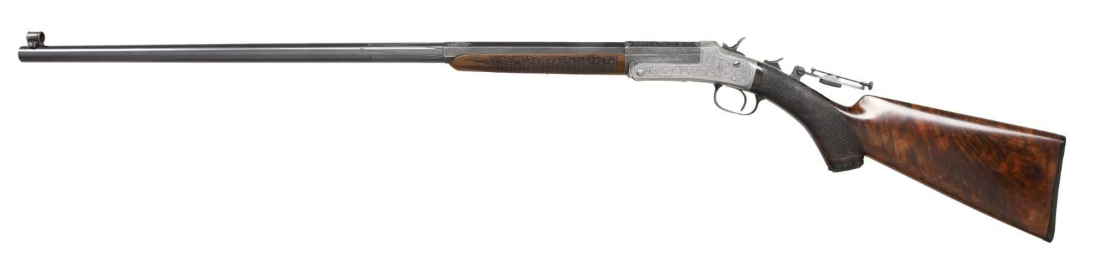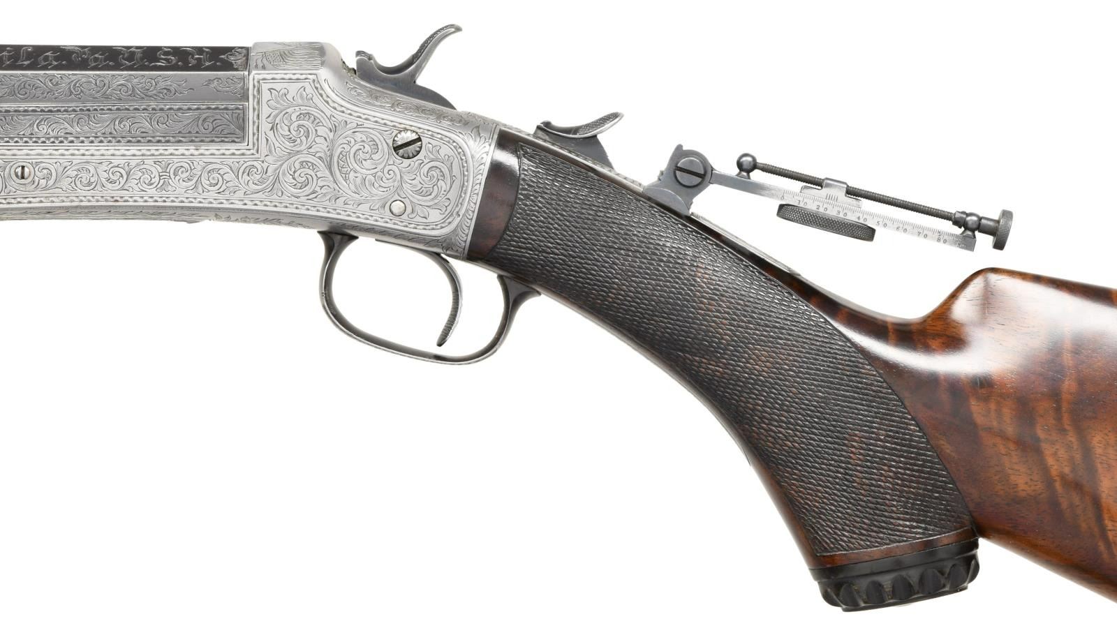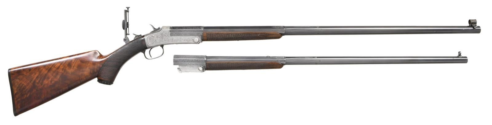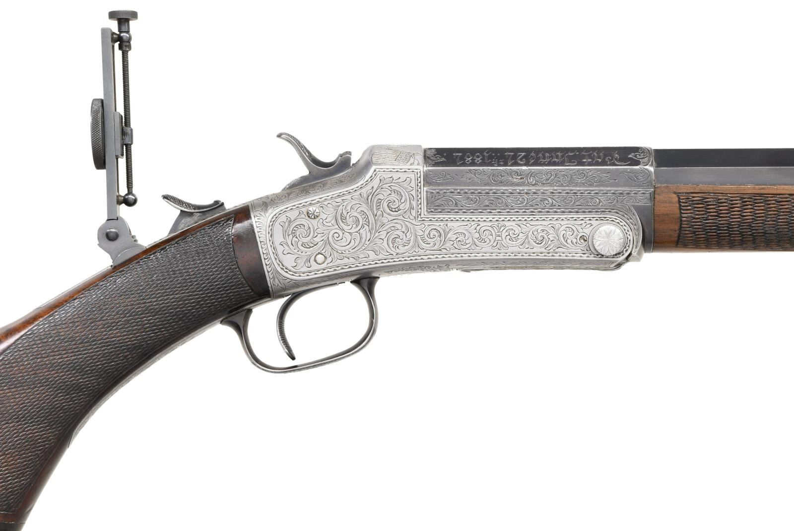 SET SINGLE SHOT RIFLE. Cal. 32-40 & 22-15. S# 5131. Bbl. 1 32-40. 29 1/2" octagon to round w/ a Wind-Gauge globe front sight. Bbl. 2 22-15. 28" octagon to round w/ combination front sight & filler in rear dovetail. Top bbl. flats are engraved "Wm. Wurffein". Left flats are engraved "Phila. Pa. U. S. A.". Right flats have patent date of June 24th, 1882. Break open tip-up style action w/ thumb lever release located on top tang ahead of mid range Vernier tang sight. Action has full coverage vine type foliate scroll w/ fancy borders having American eagle & flags around the breech. Complimenting scroll engravings extends to breech end & octagon to round transition areas of both bbls. w/ shooting stars extending onto the round portion of both bbls. Splinter forearm & hard rubber capped pistol grip stock of fancy walnut w/ hand checkering. LOP: 13 7/8" checkered hard rubber buttplate. WEIGHT w/ 32-40 bbl: 8 lbs, 2.2 ozs. Estimated quantity of a few thousand, mfg. 1880s-1890s. CONDITION: fine. Both bbls. retain over 90% blue showing edge wear. Action has faded to gray. Wood has good original finish & checkering showing a few small marks. 32-40 bbl. has a dark bore retaining sound rifling. 22-15 bbl. has a bright bore w/ strong rifling. PROVENANCE STATEMENT: From the Harold Prucha Collection". (01-23230/DS). ANTIQUE. $3000-5000.