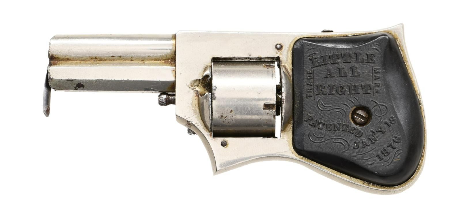 Cal. 22 RF. NSN. Bbl. 1 7/8" octagon. Nickel finished squeezer type pistol. Pivoting sheet metal sliding trigger fit in tube over bbl., cocks & fires the gun when pulled rearward. 5 shot round cyl. 2 piece hard rubber grip panels. Estimated quantity of several hundred produced in the late 1870's. CONDITION: 90% nickel shows spots of flaking. Very good grips. Function action. Pitted bore. PROVANANCE: Marshall "Brook" Davis collection. (01-23549/DS). ANTIQUE. $1500-2500.