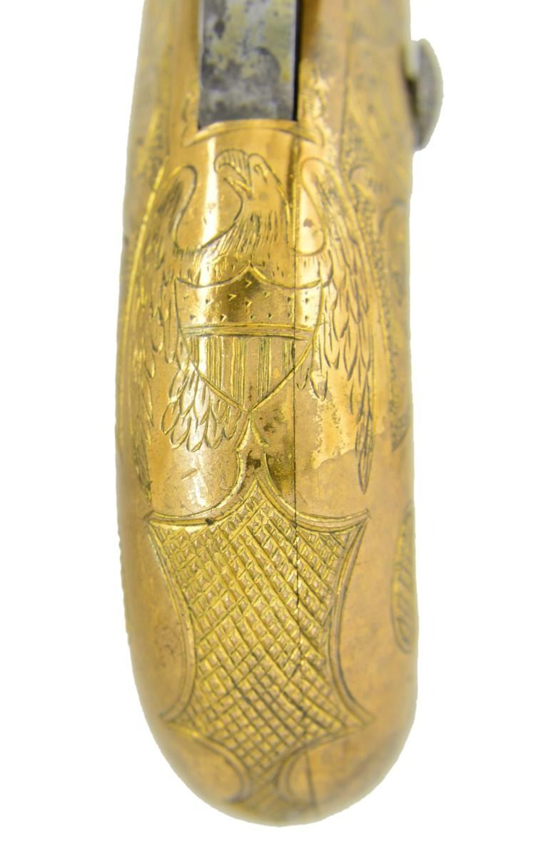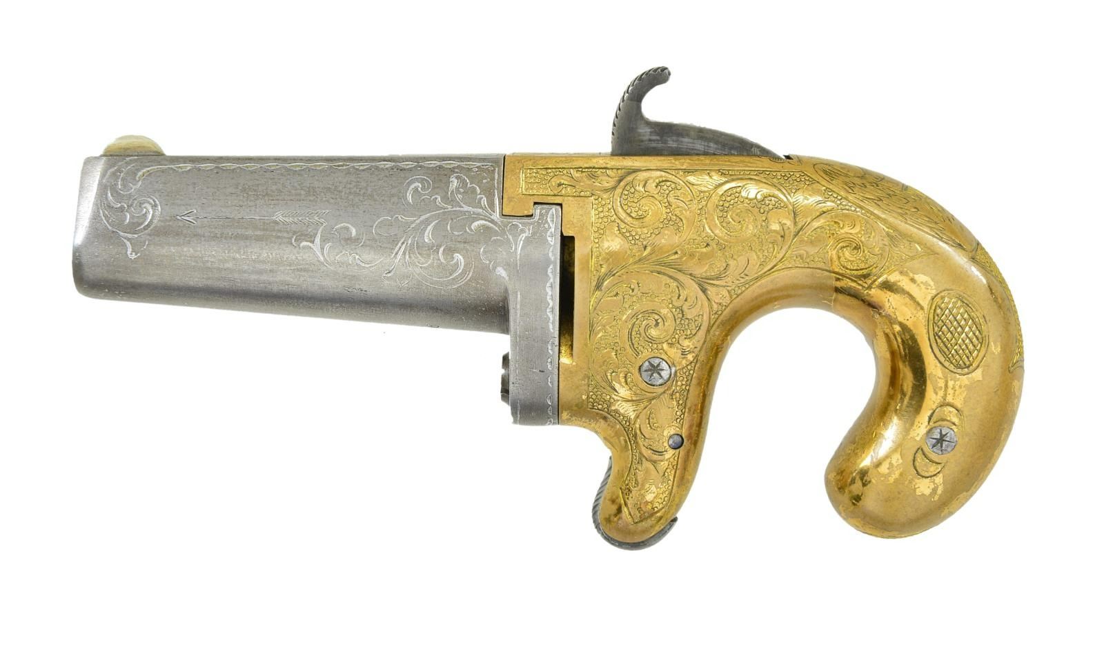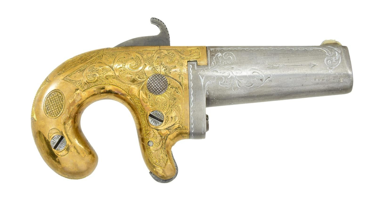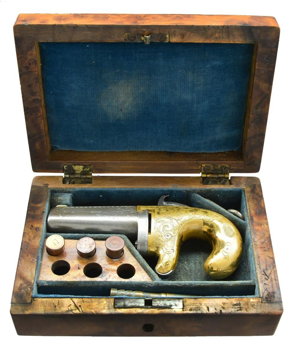 DERRINGER. Cal. 41. S# 4296. Standard configuration of Moore's Civil War patented pistol, "NATIONAL ARMS Co, BROOKLYN, NY" on top 2.5" barrel flat, brass frame, spur trigger, center mounted hammer, knurled barrel release button on right. Nicely engraved gold plated frame with large eagle motif, and engraved silver plated barrel. CONDITION: very good overall, barrel retains traces of silver plate with balance silver/gray patina. frame returns about 20% plating. Strong action, good rifled bore. Custom mahogany casing has exotic grain, blue baize lining is worn and soiled, fitted for 6 cartridges, functional key, 2-piece brass cleaning rod. (01-23020/JS). $1,500-2,500.