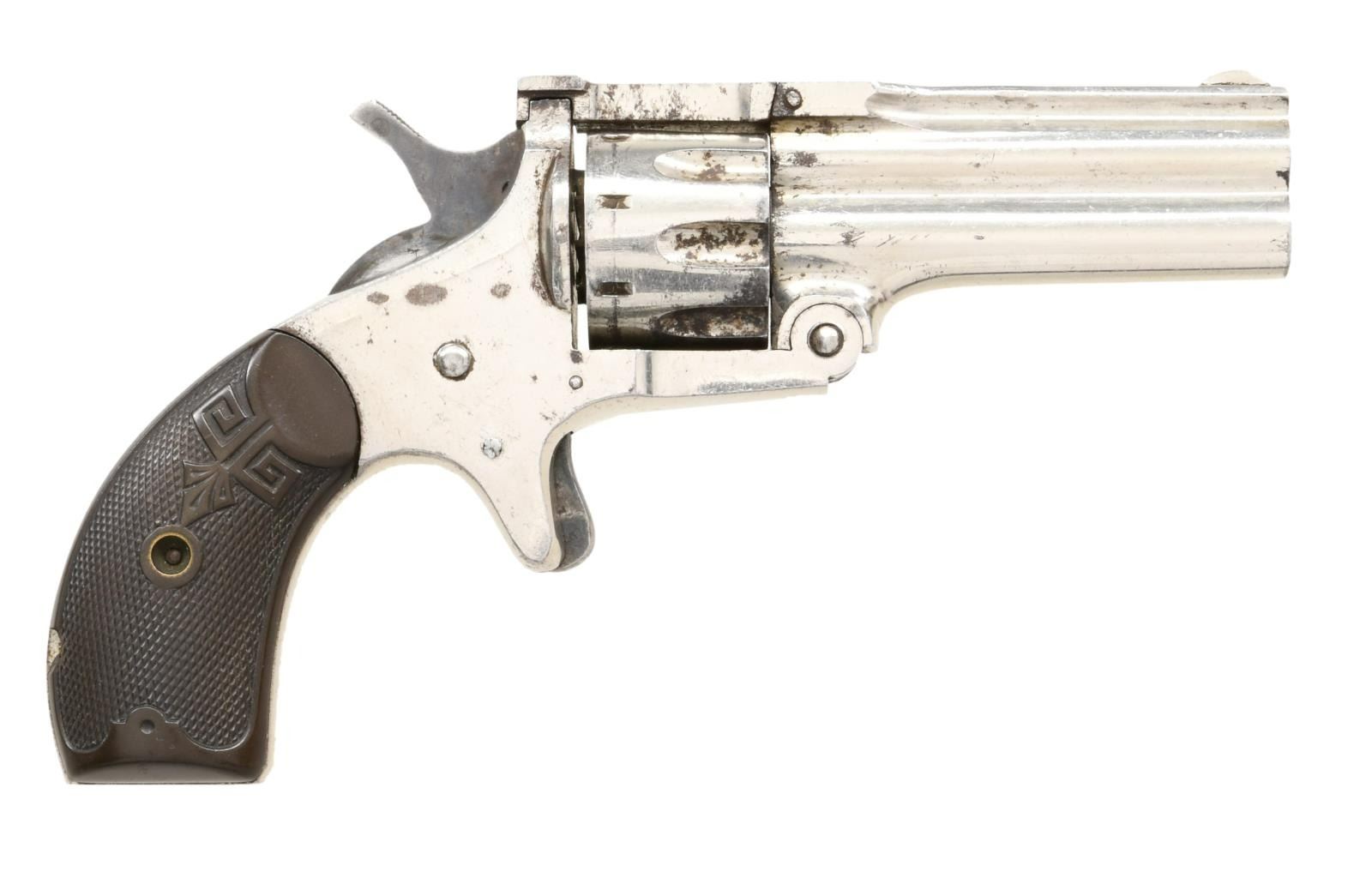 Cal. 22 RF / 32 RF. Bbls. 2 1/2" superposed configuration with rib. 32 cal. lower bbl acts as center pin. 8 shot 22 RF fluted cyl. with 32 RF center chamber. Top break spur trigger action. Hammer has moveable duplex firing pin for chamber selection. Nickel finish. 2 piece checkered hard rubber grips. Estimated production of several hundred, ca. 1880's. CONDITION: Over 80% nickel showing spots of corrosion. Right grip panel has small chip along backstrap. Functioning action. Pitted bores have worn rifling. PROVENANCE: Marshall "Brook" Davis Collection. (01-23546/DS). ANTIQUE. $1500-2000.