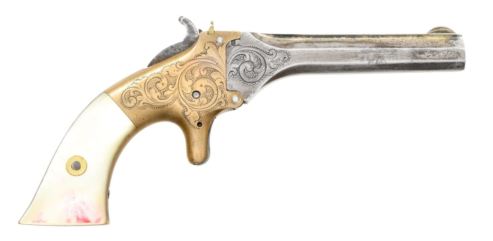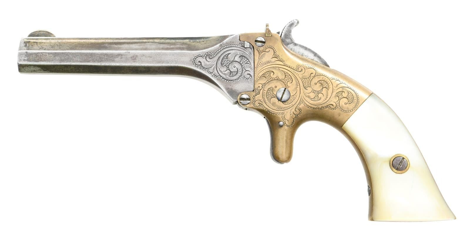 Cal.22 RF. S#. 1544. Bbl. 3 1/2" octagon tip down for loading. Fixed V notch rear with semi circular front sight. Brass spur trigger action. Frame & bbl. flats have vine type foliate scroll hand engraving with punch dot backgrounds. Blue bbl. finish with Gold plated brass action. 2 piece square butt mother of pearl grips. Estimated production of 2100 in the early 1860's. CONDITION: Bbl. blue has faded to gray. Brass action retains traces of gold finish in protected areas along side the hammer. Very good grips. Sound action. Dark pitted bore. PROVENANCE: Marshall "Brook" Davis Collection. (01-23553/DS). ANTIQUE. $1200-1800.