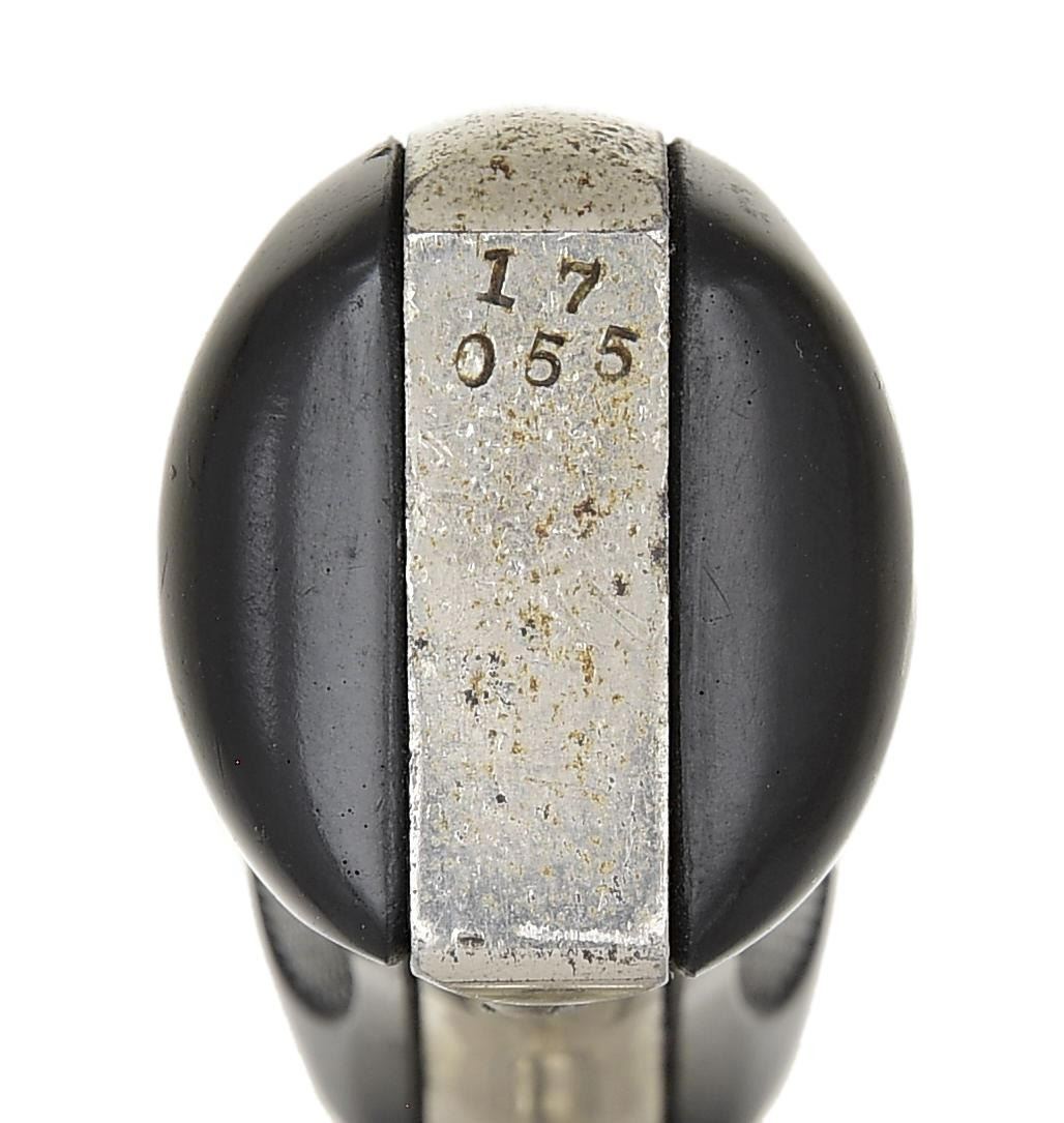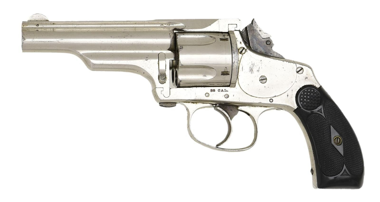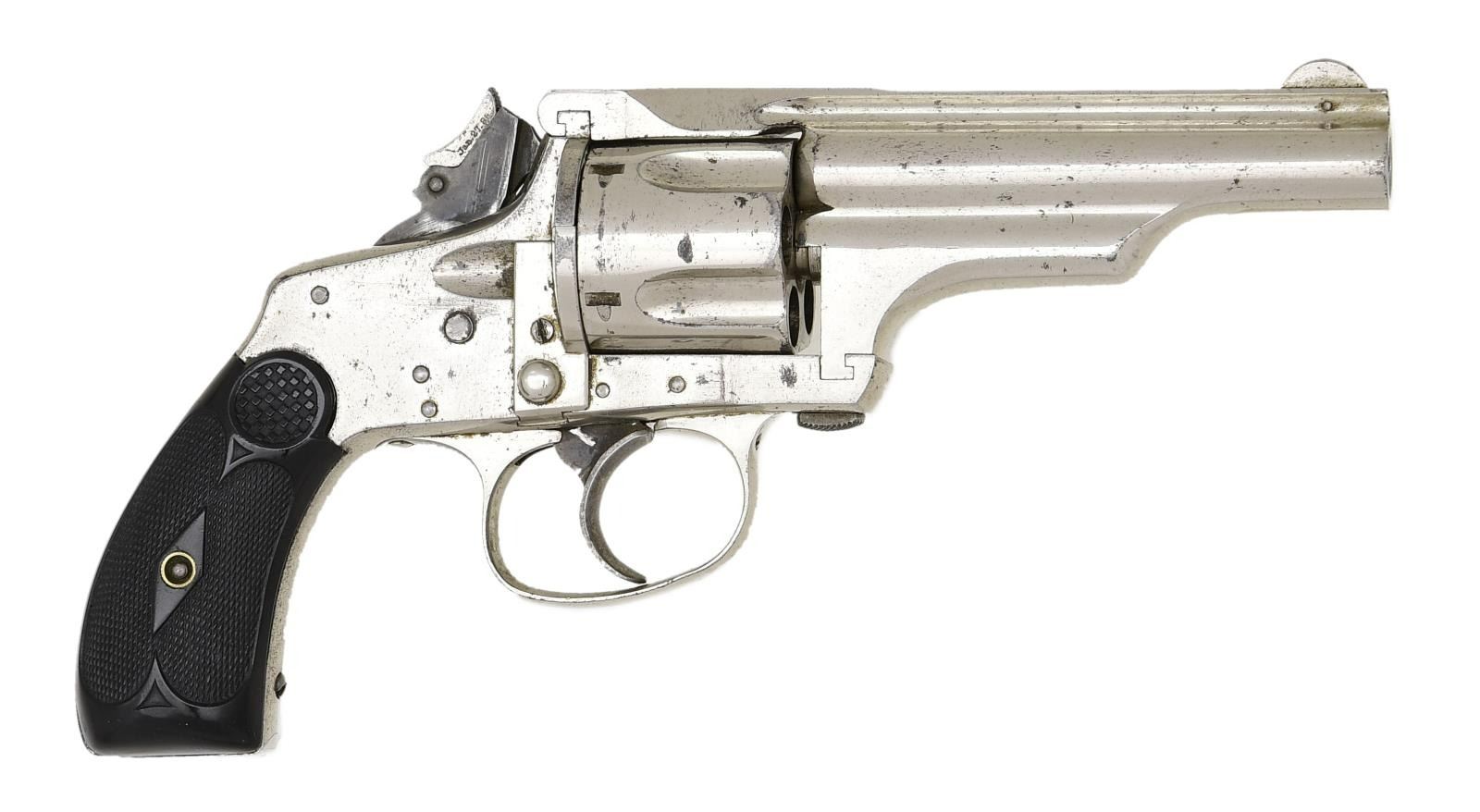 Cal. 38 CF. S# 17055. Bbl. 3 1/2" w/ solid rib. Rounded blade front sight. Fixed rear sight. Right side of frame marked "38 CAL.". Nickel finish. Case colored trigger & holding hammer. Checkered black rubber grips. CONDITION: grips show some dings & handling wear. Trigger & hammer are turning gray w/ strong traces of case colors & some oxidation. Balance of metal retains 85% original nickel w/ a few spots of pitting, scattered light flaking & oxidation. Pitted bore w/ visible rifling. PROVENANCE: From the Harold Prucha Collection. (01-23217/MJC). ANTIQUE. $800-1200.