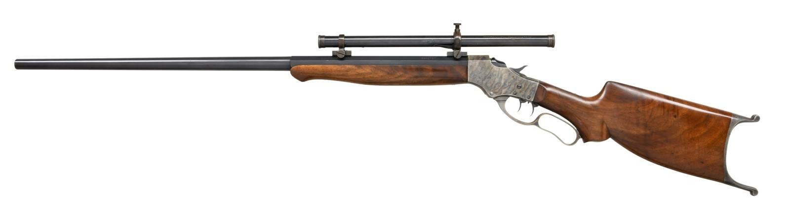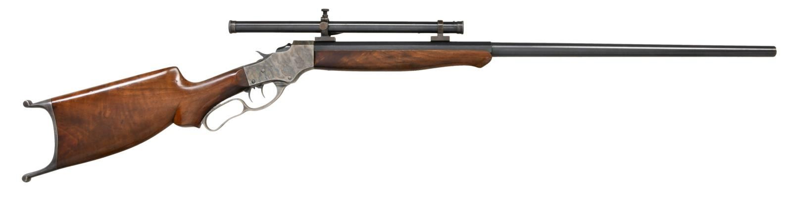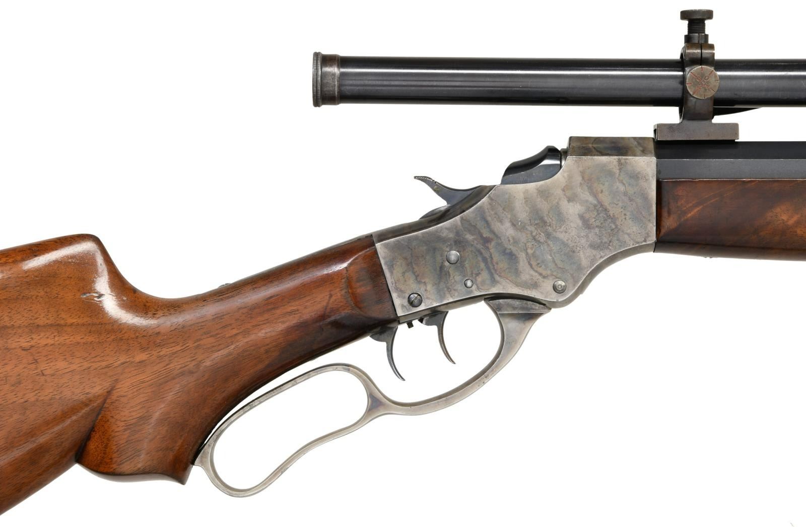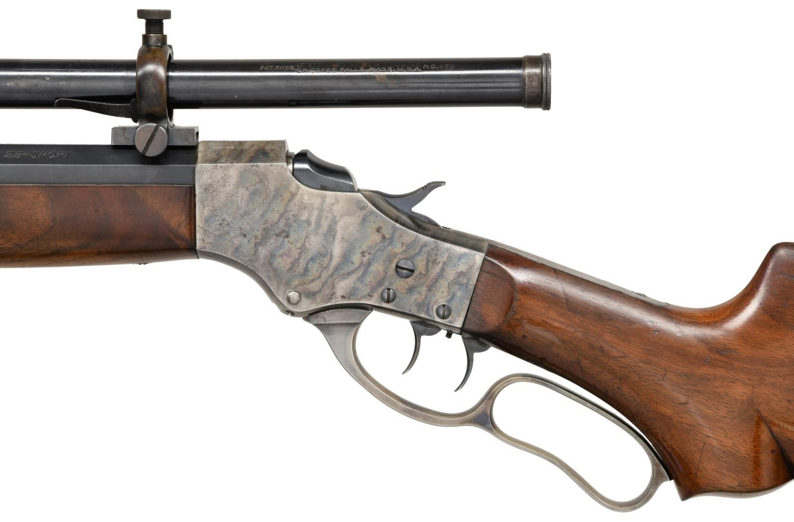 WITH SCOPE. Cal. 22 S. S# 5317. Bbl 29 3/4". No. 49 single shot rifle manufactured by Stevens A&T Co. Half octagonal barrel is marked with Steven's 2 line address on the top flat, with the caliber designation on the left flat. Frame and loop lever are case color hardened, with the breechblock, hammer, and barrel being blued. Smooth wood pistol grip stock featuring a Swiss buttplate, with a smooth wood forend. Barrel is mounted with a Stevens No. 470 scope, with the frame featuring double set triggers. Matching numbers are present on the frame and barrel. CONDITION: frame retains good amounts of its case colored finish, exhibiting fading and light wear overall that shows through to gray patina. Barrel retains bountiful amounts of its blue finish, exhibiting some superficial marks from handling and storage. Bright bore, exhibiting some scattered spots of pitting and strong rifling throughout. Wood furniture shows some scattered marks and minor impressions from storage and handling, but are otherwise very good overall. Scope retains a hazy optic. PROVENANCE STATEMENT: From the Harold Prucha Collection". (23-5015/MLW). CURIO. $2,000-2,800.