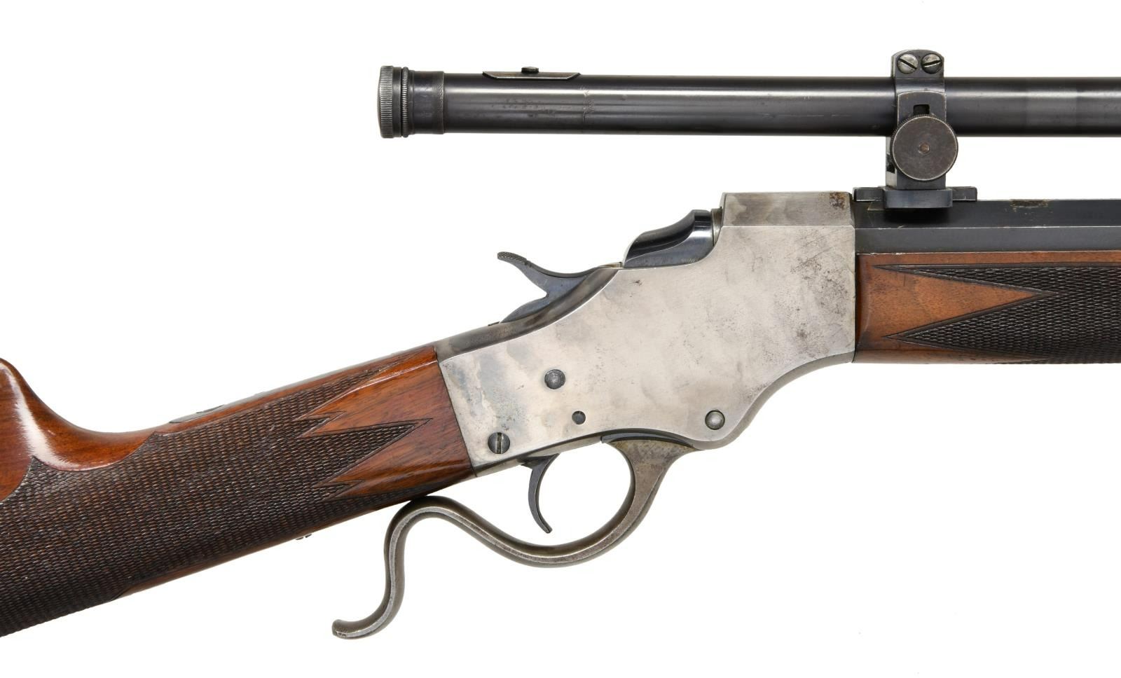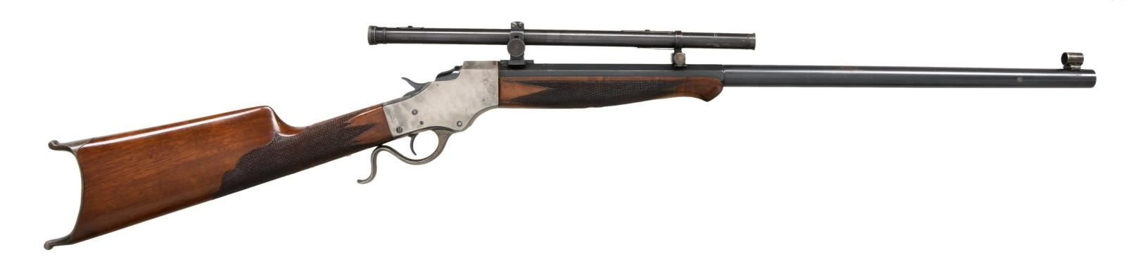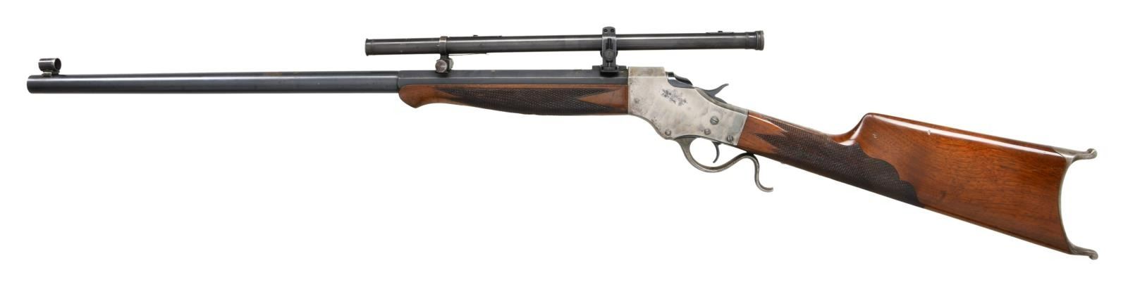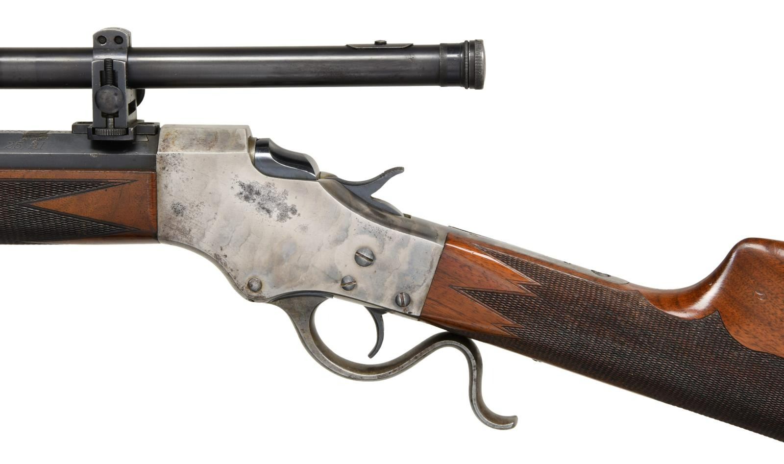 WITH SCOPE. Cal. 25-21. S# 2194. Bbl 24 1/8". No. 45 single shot target rifle chambered in 25-21 manufactured by Stevens A&T Co. Half octagonal barrel is stamped with Steven's 2 line address over the top flat, with the caliber designation on the left. Case colored frame and lever, with blued breechblock, hammer, and barrel. Beautifully checkered wood buttstock featuring a Swiss pattern buttplate, with a checkered wood forend. Barrel has been dovetailed and rewelded twice. Globe front sight. Barrel is mounted with a WM Malcom scope. Matching numbers are present on the frame and barrel. CONDITION: frame retains traces of its original case color hardened finish, having been cleaned and polished and exhibiting areas of mild pitting overall. Lever retains a gray patina. Barrel retains the majority of its blue finish, exhibiting scattered marks form handling and storage, and some small areas of wear and discoloration. Bright bore, exhibiting well defined rifling throughout. Wood furniture shows some scattered marks and minor impressions from storage and handling, but otherwise presents very nicely. Optic is slightly hazy. PROVENANCE STATEMENT: From the Harold Prucha Collection". (23-5016/MLW). CURIO. $2,000-2,500.