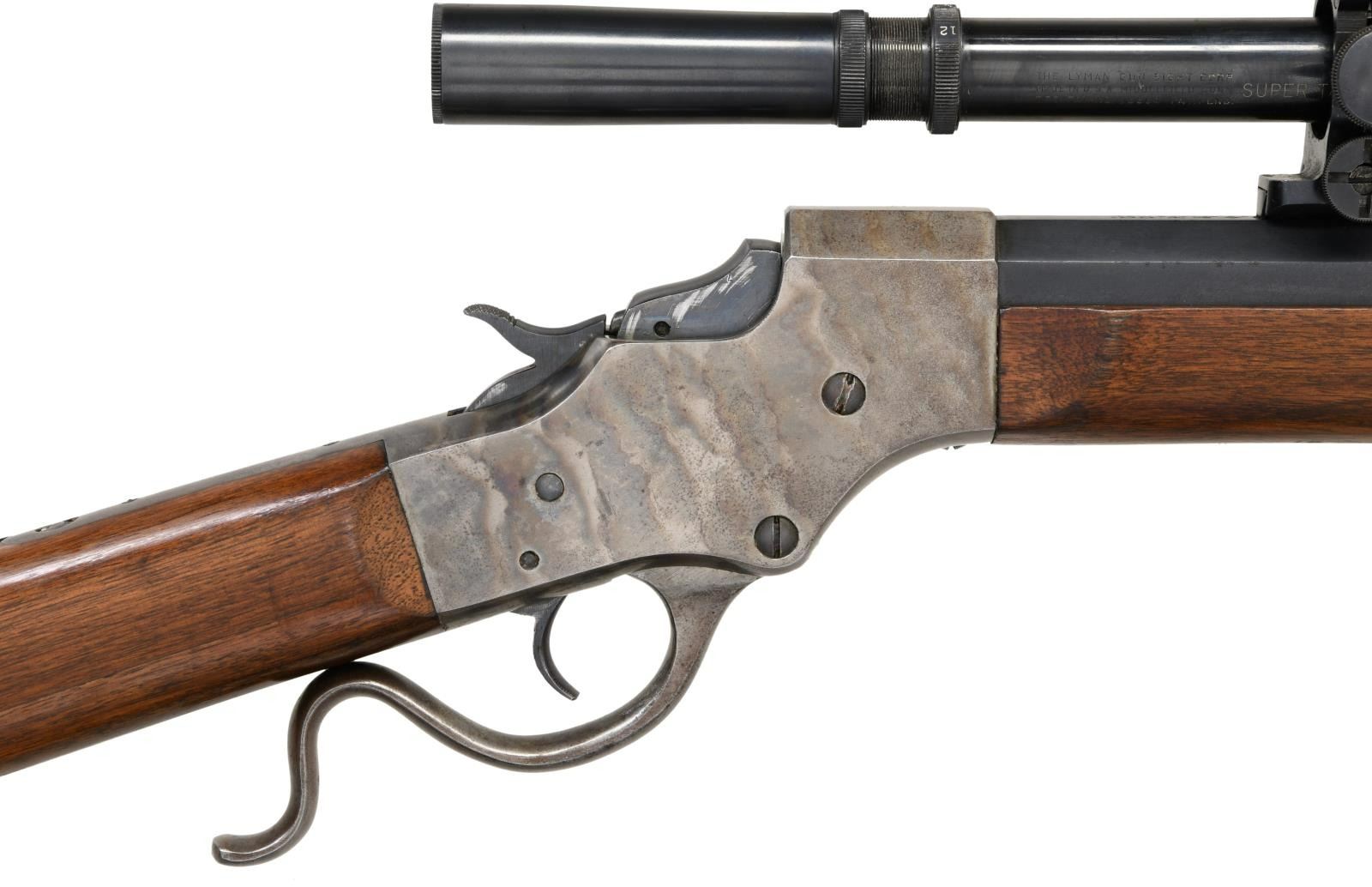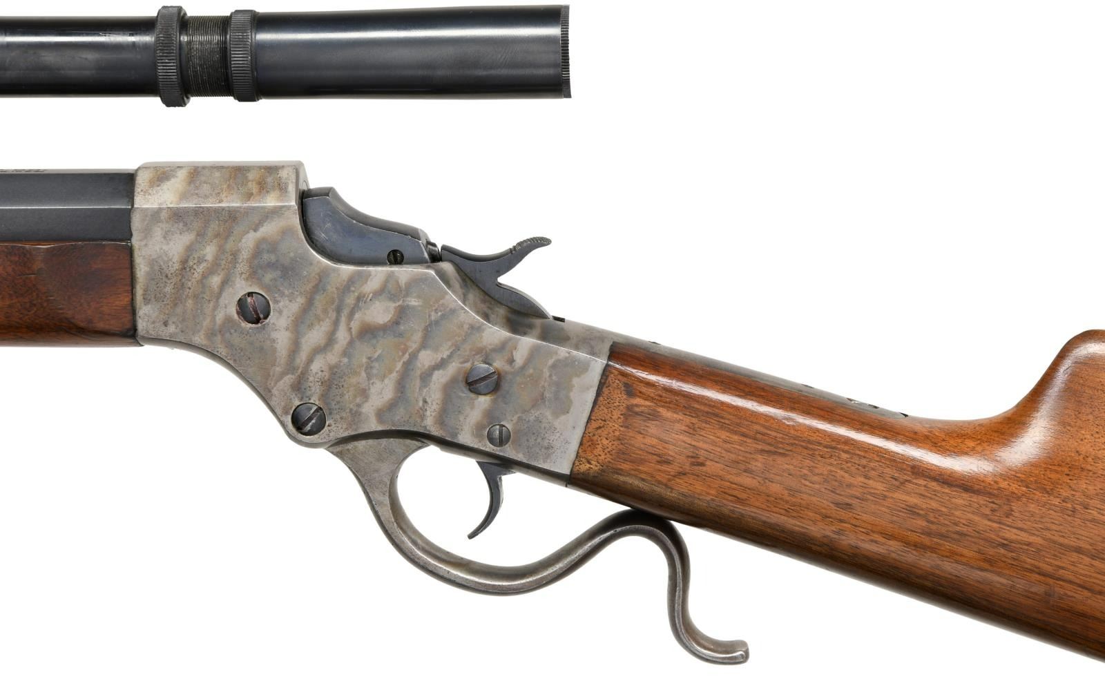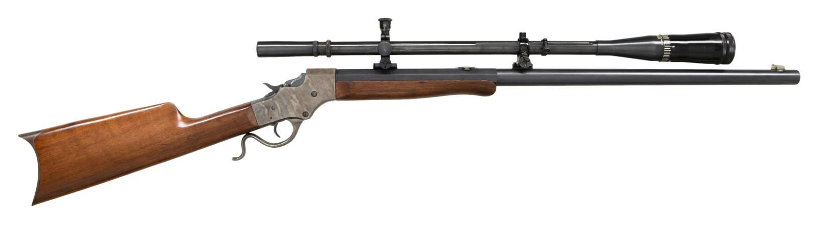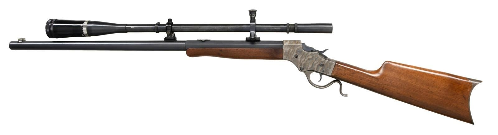 RIFLE WITH SCOPE. Cal. .25-20. S# 51339. Bbl 26". No. 44 single shot target rifle chambered in .25-20 manufactured by Stevens A & T Co. The top of the barrel exhibits part Steven's address, with the remainder being beneath the rear scope mount, with the caliber "25.20" stamped on the left flat. Half octagon barrel featuring a German silver front sight as well as a Lyman Super Targetspot scope. Rear sight has been removed. Plain wood buttstock featuring a cresent buttplate, with a smooth wood semi-schnabel tip forend. Frame and lever exhibit a case color hardened finish, with the breechblock, hammer, and barrel being blued. Matching numbers are present on the underside of the receiver and barrel. CONDITION: frame retains large amounts of its original case color hardened finish, exhibiting some wear and thinning that shows through to gray patina. Lever and buttplate exhibit a gray patina. Barrel retains bountiful amounts of its original factory blue finish, exhibiting some light wear around the muzzle, a few minor superficial handling marks, as well as a couple extremely light spots of pitting. Bright bore, exhibiting strong rifling throughout. Wood furniture shows some scattered marks and minor impressions from storage and handling, but are otherwise very good overall. Scope retains a clear optic. PROVENANCE: From the Harold Prucha Collection". (23-5017/MLW). CURIO. $1,300-1,800.