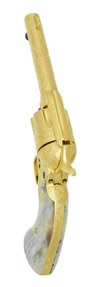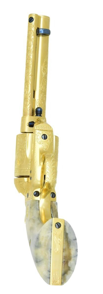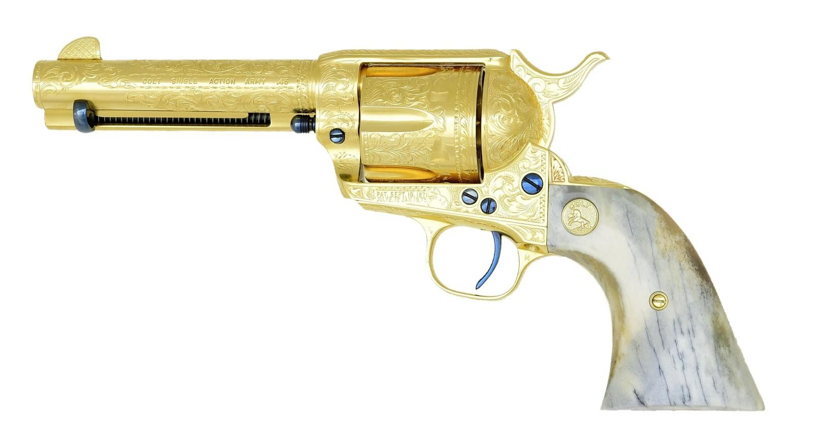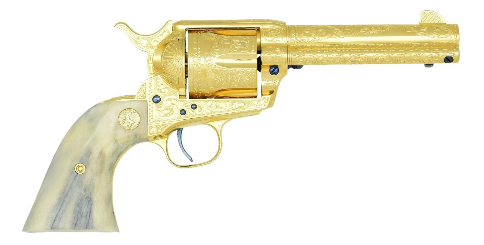 COLT SINGLE ACTION ARMY REVOLVER. Cal. 45 Colt. S# 70994SA. Bbl. 4 3/4". Six shot fluted cyl. Full coverage Class D engraving consisting of vine type foliate scroll w/ punch dot backgrounds & fancy borders. Loading gate is engraved w/ sunburst design. Backstrap is engraved "PEACEMAKER". Engraver's signature "J. ADAMS" is found on the front of the frame below the cyl. pin. Adams & Adams were factory Colt engravers for a period of over 20 years. Full gold finish w/ fire blued trigger, ejector head, cyl. pin & screws. 2 piece grips w/ gold rampant colt medallions. Grips appear to be ancient Mammoth Ivory having a mottled blue, brown & cream colored appearance w/ dark grain streaks. Mfg. 1975. UNATTACHED ACCESSORIES: etched Colt logo glass top walnut shadow lined display case w/ blue velvet lined interior. CONDITION: near new, appears unfired. Metal retains nearly all gold & fire blued finish. Near excellent grips. Near excellent bore. (23-4746/DS). CURIO. $10000-12000.
