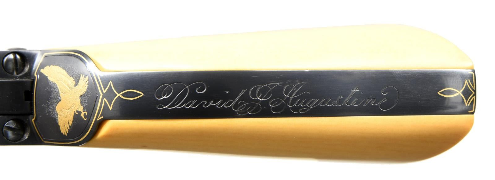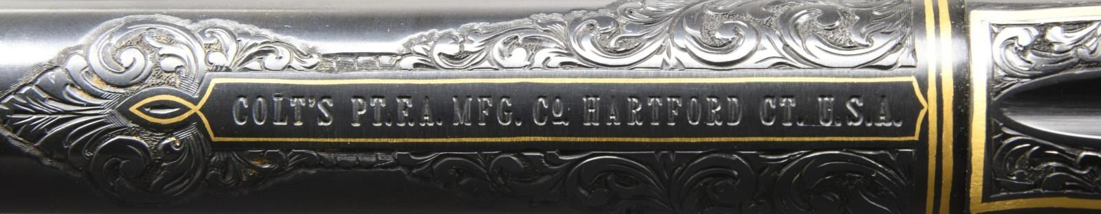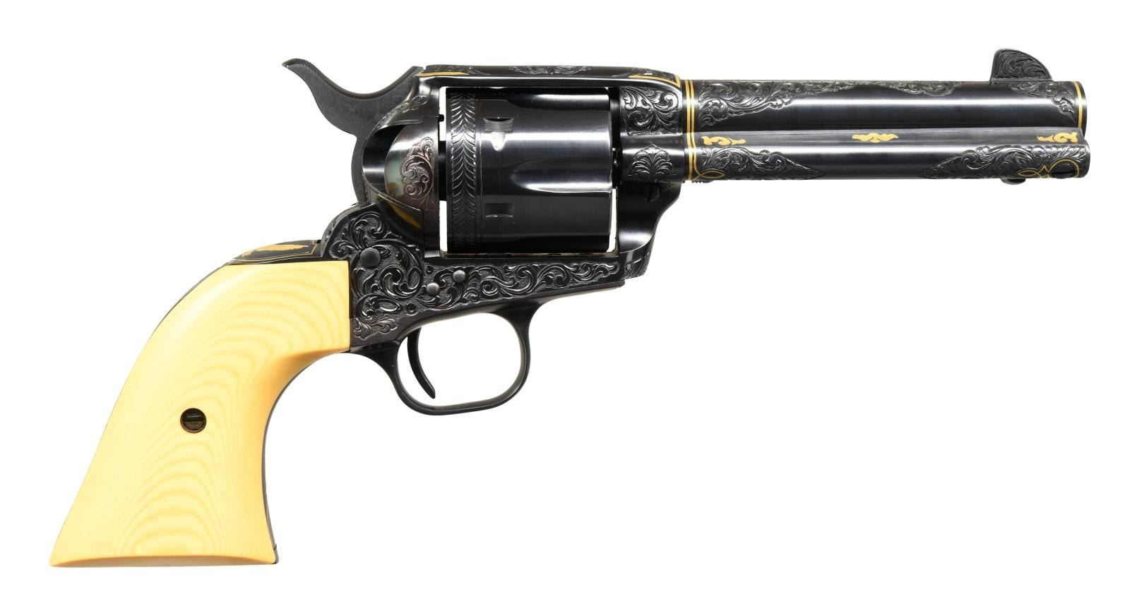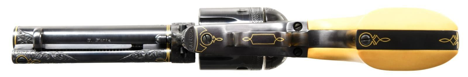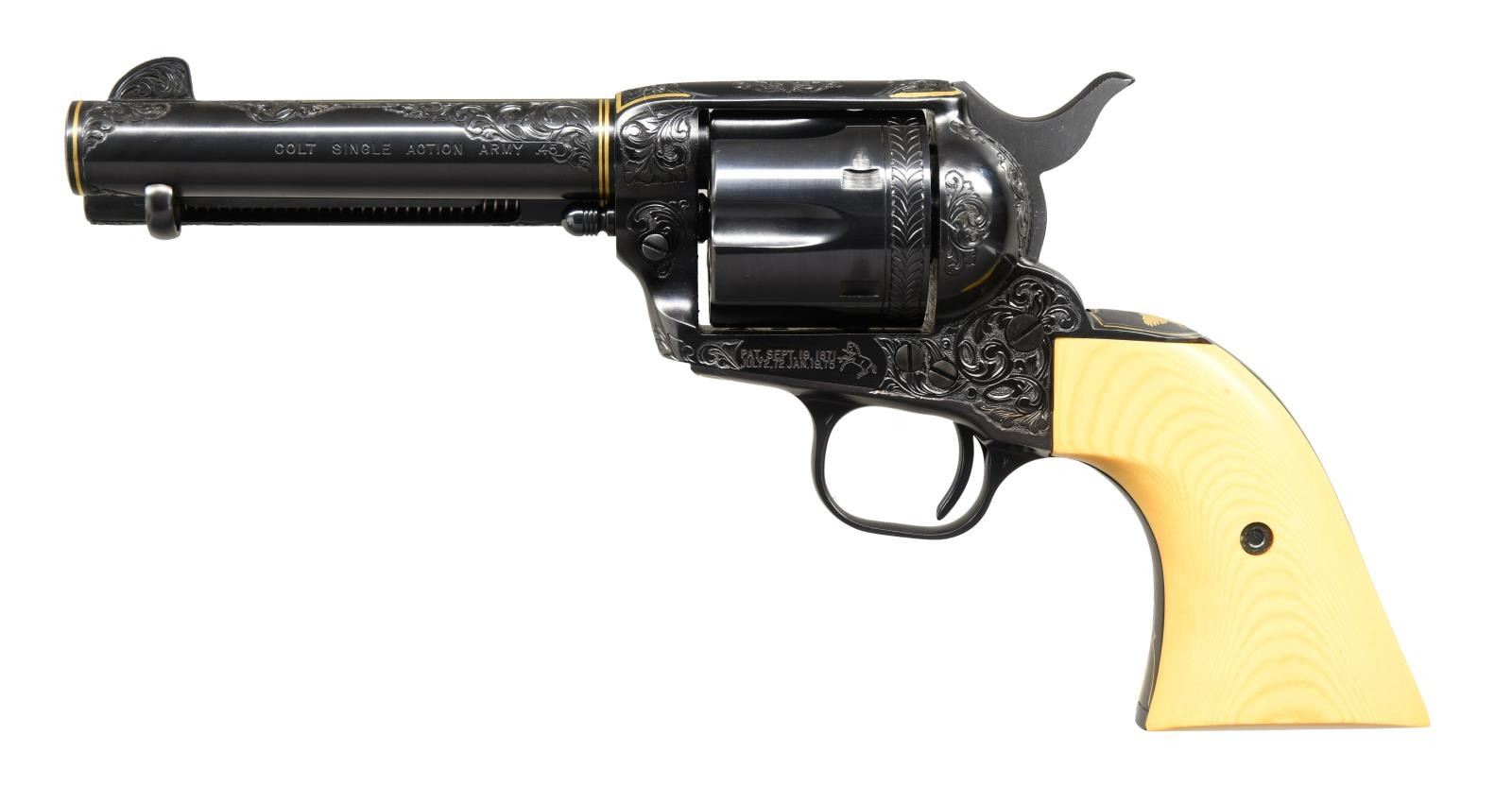 COLT 3RD GEN SAA REVOLVER. Cal. 45 Colt. S# SA60394. Bbl. 4 3/4". Mfg 1983. Bbl. & frame are ornamented with masterfully executed 50% coverage vine type foliate scroll engraving to include the front sight. Rear of cylinder has straight line feather type border behind stops. Engraving is tastefully accented with gold wire inlay on butt, trigger guard bow, front of grip frame & top of receiver. Bbl. exhibits single gold band at muzzle end with double gold band at rear near action to include ejector housing. Top of bbl marked "COLT'S PT. F.A. Co HARTFORD CT. U.S.A." in plain field with thin gold wire border inlay surrounded by foliate scroll. Top of rear grip strap features a gold inlaid spread winged eagle with finely stippled background highlighted by shield shaped gold wire inlay. Metal finished in an attractive deep, dark immersion blue. Sides of hammer polished bright. Inscribed on backstrap "David J Augustine" in fine scroll. Bottom of bbl. signed "G. Forte". Guiseppe Forte was a member of the Firearm Engraver's Guild of America before his passing. Revolver is stocked with 2 piece composite faux bone grips. CONDITION: all aspects near excellent; possibly unfired. (23-4744/BH). MODERN. $7,000-11,000.